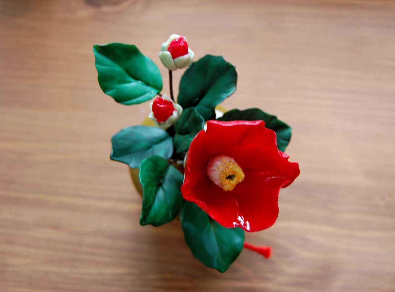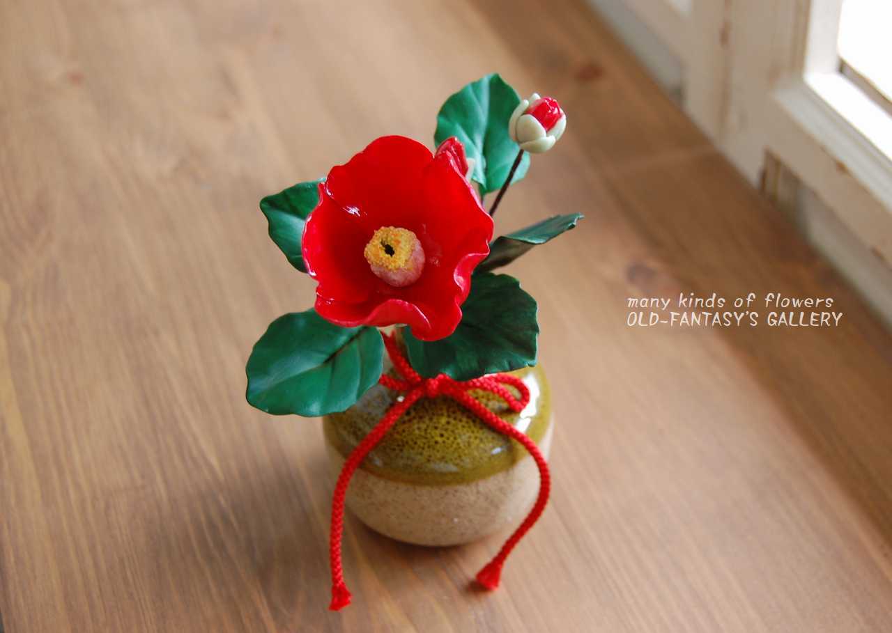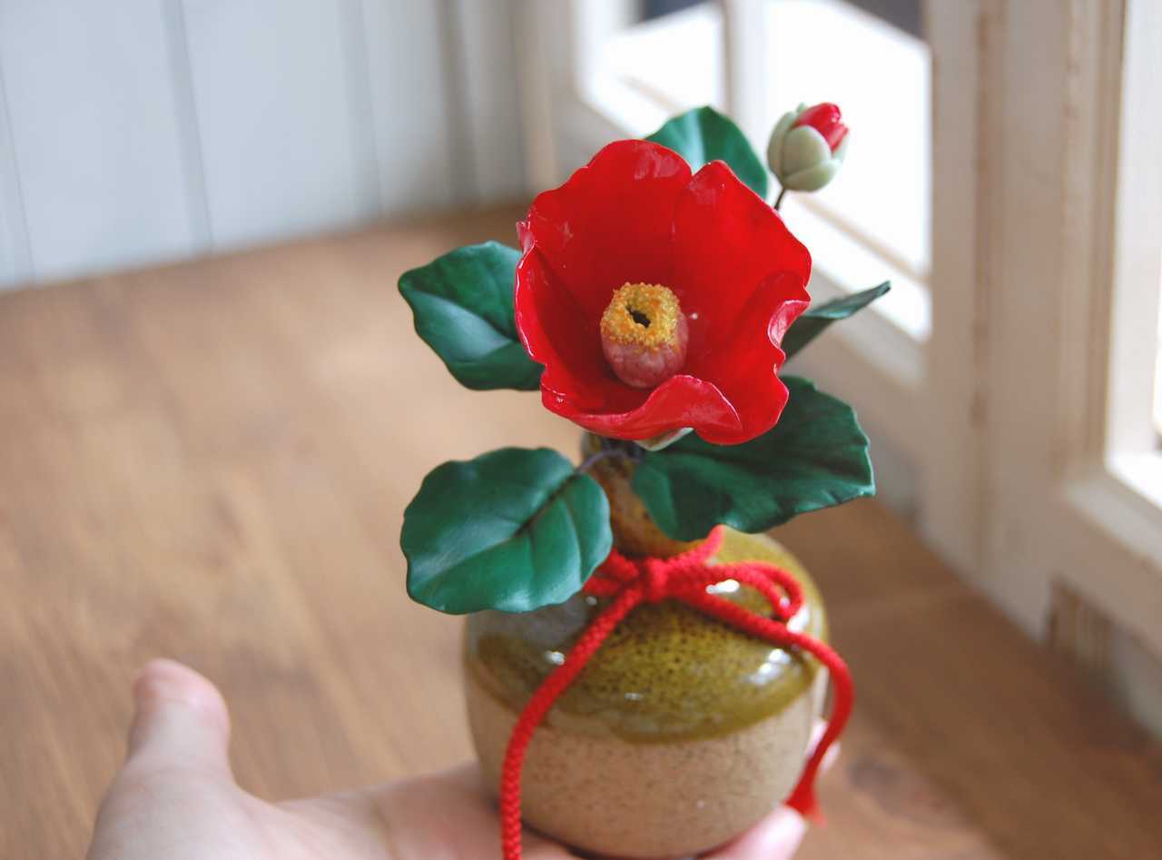 鮮やかな真っ赤な椿を粘土で作り、可愛いミニサイズに仕上げました。