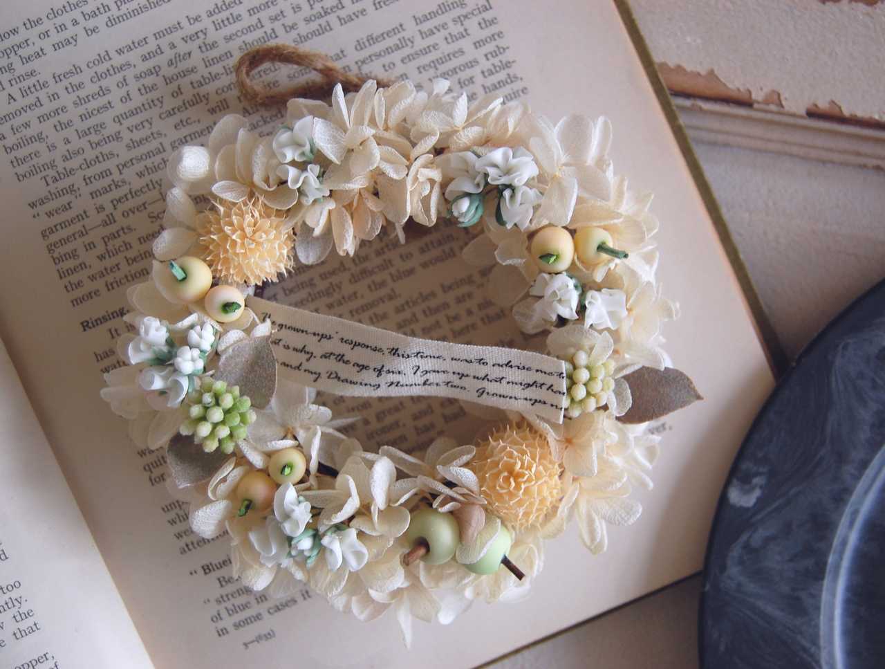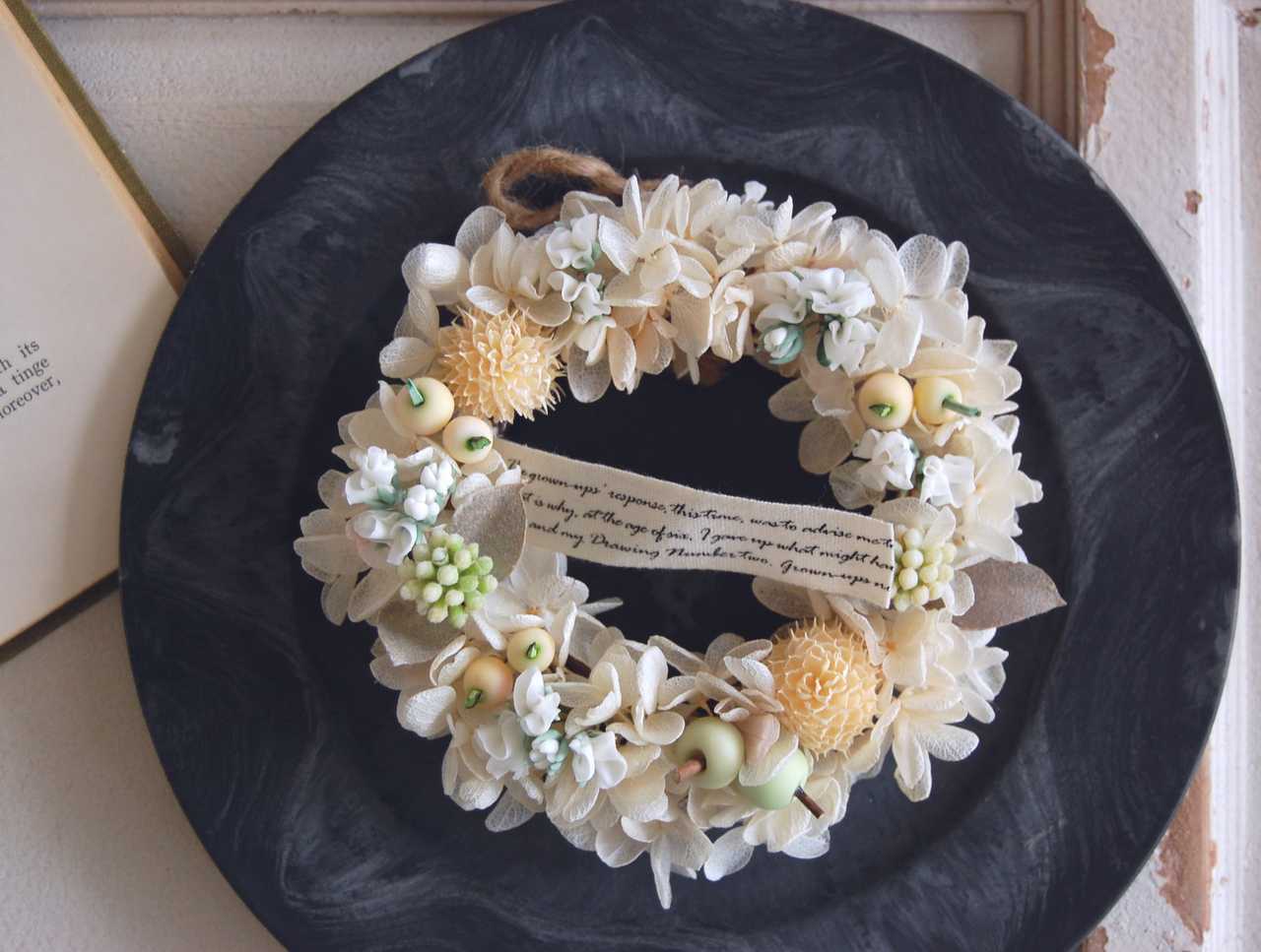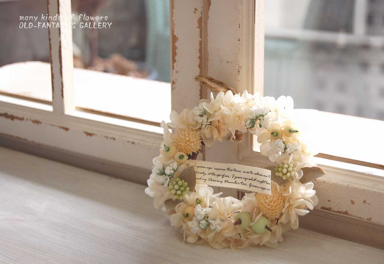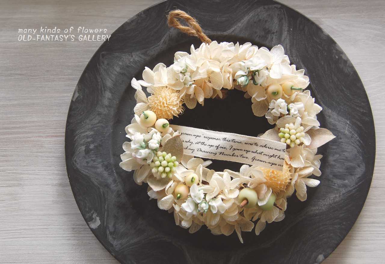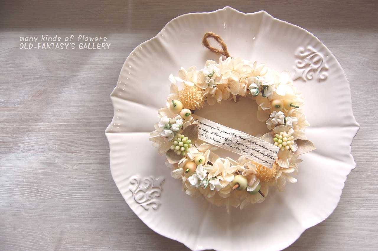 ミニサイズ&1.300円! 直径約12センチ アンティークホワイト あじさいと木の実のリース A432