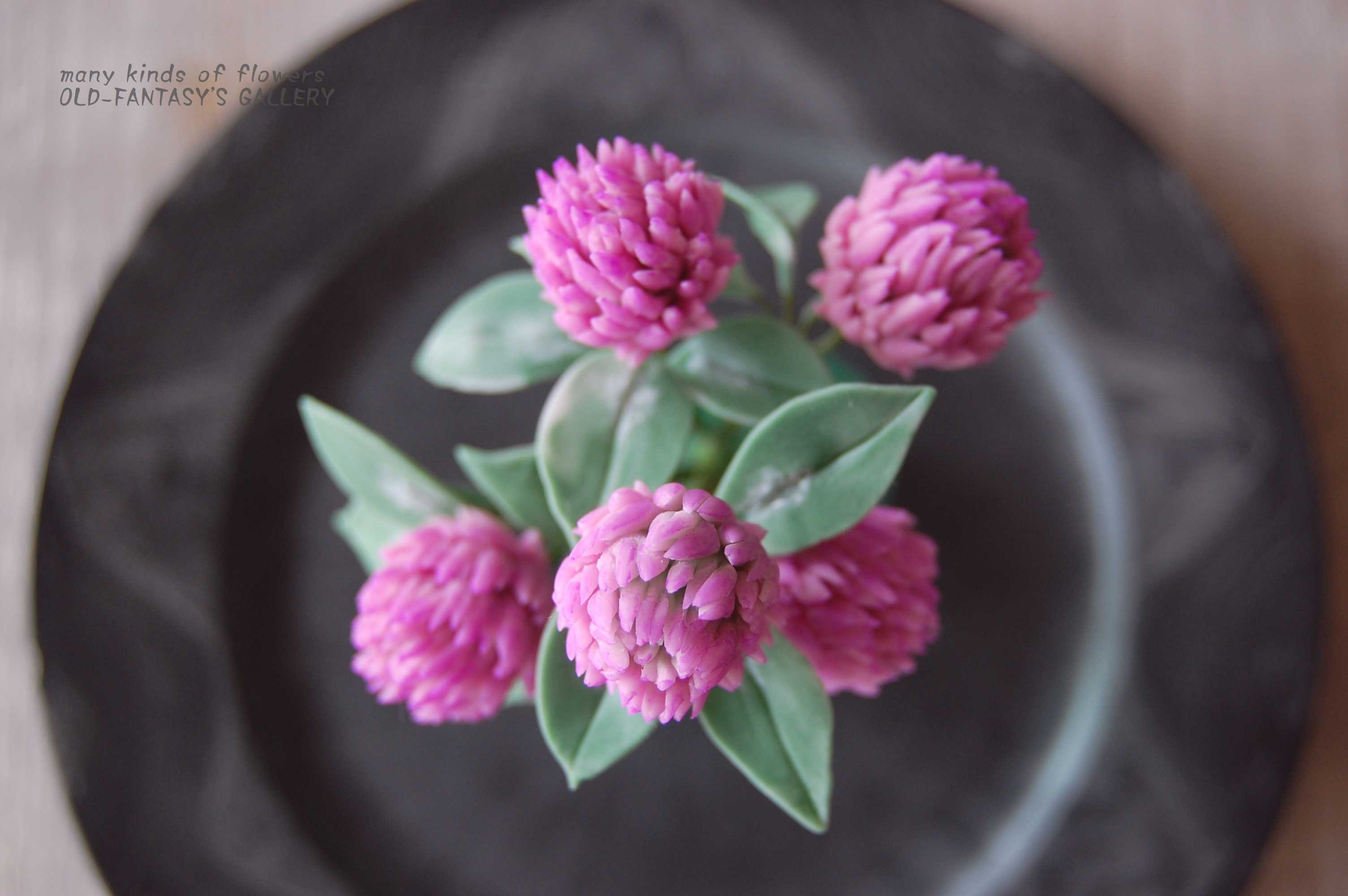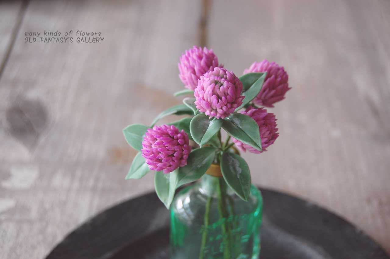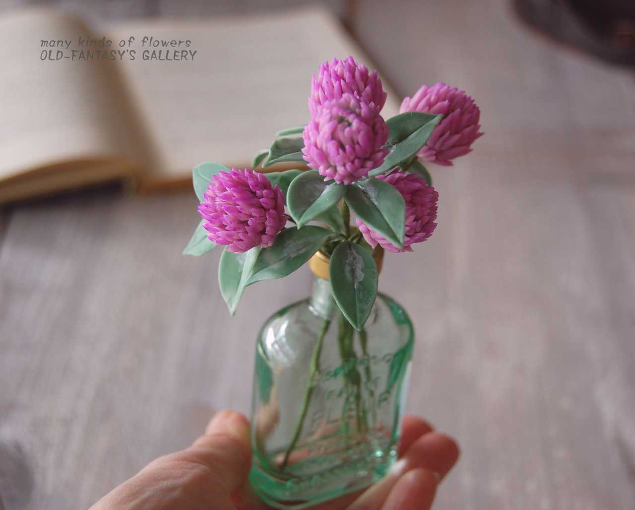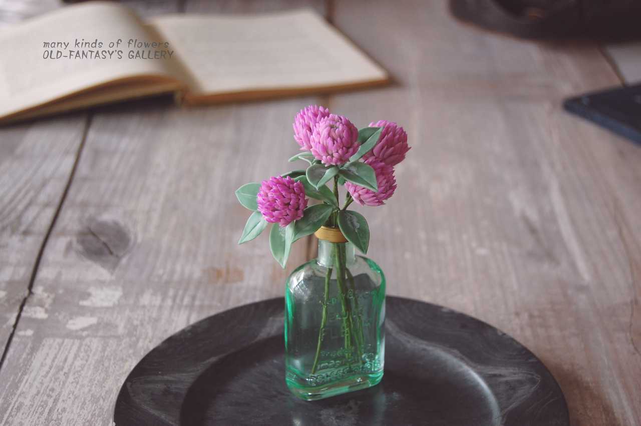 ◆粘土のお花◆ ミニボトル♪ アカツメクサを アンティーク調 ホラリング・プティボトルに飾って 赤紫 … A451