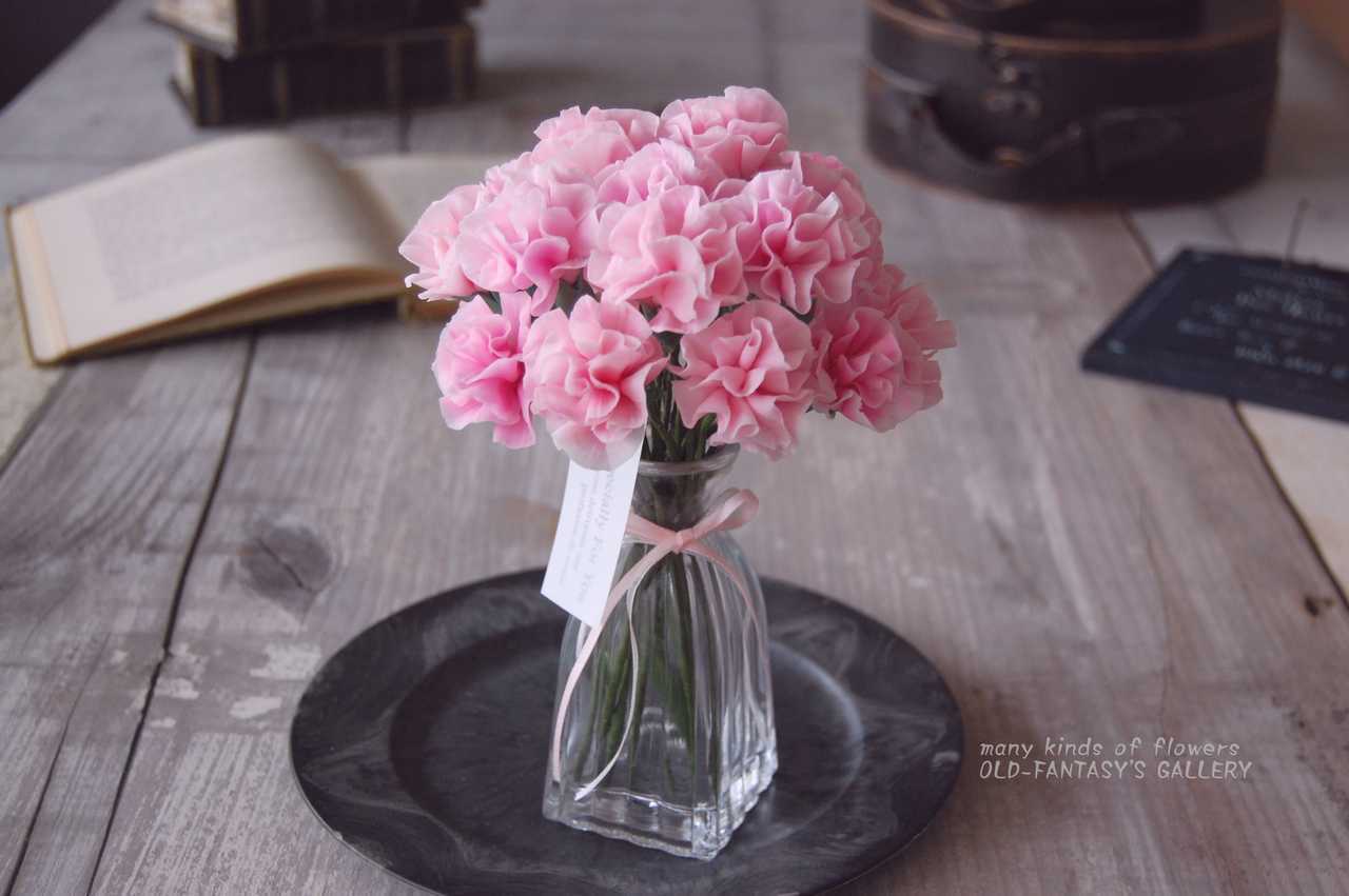 そんな人気のカーネーションをたっぷりとおしゃれなシルバーリム・スリムシングルベース に飾りました。クリアーカラーの可愛いベースです。