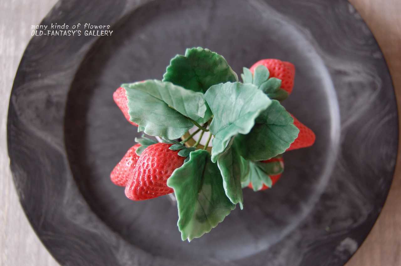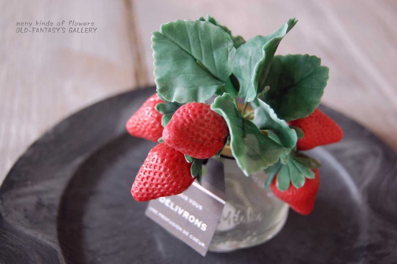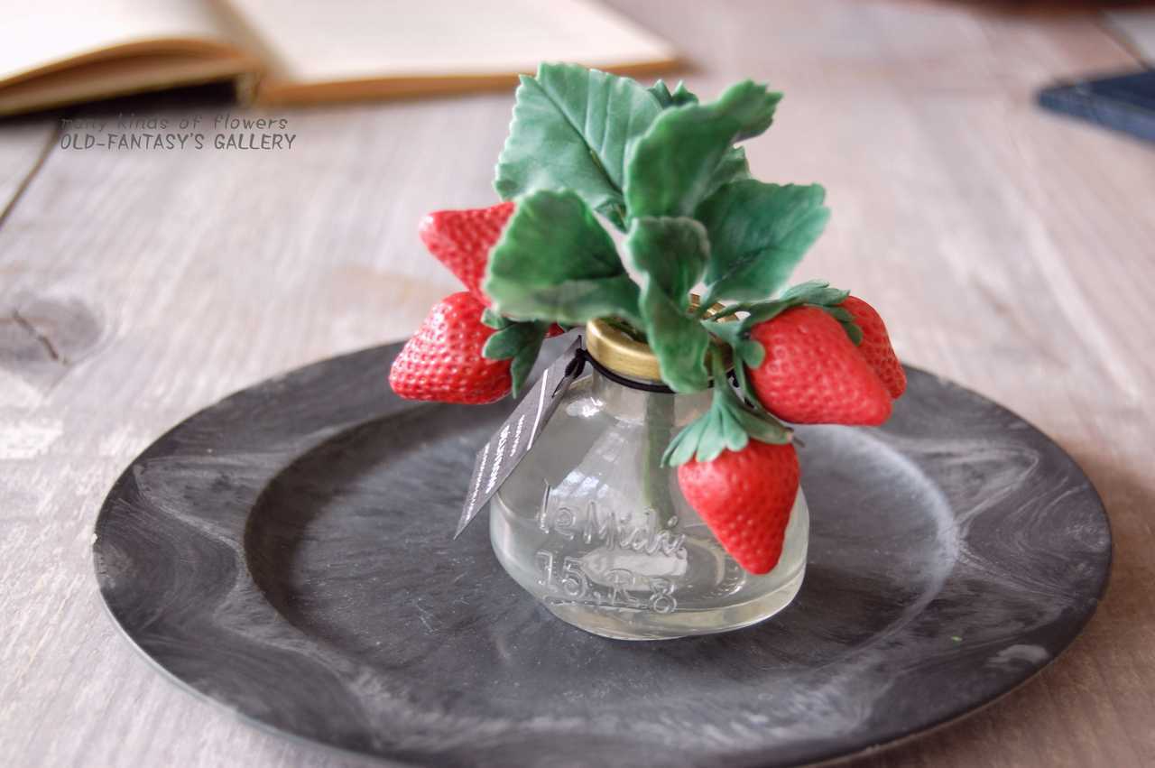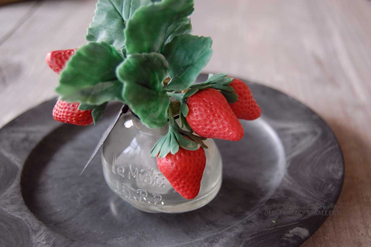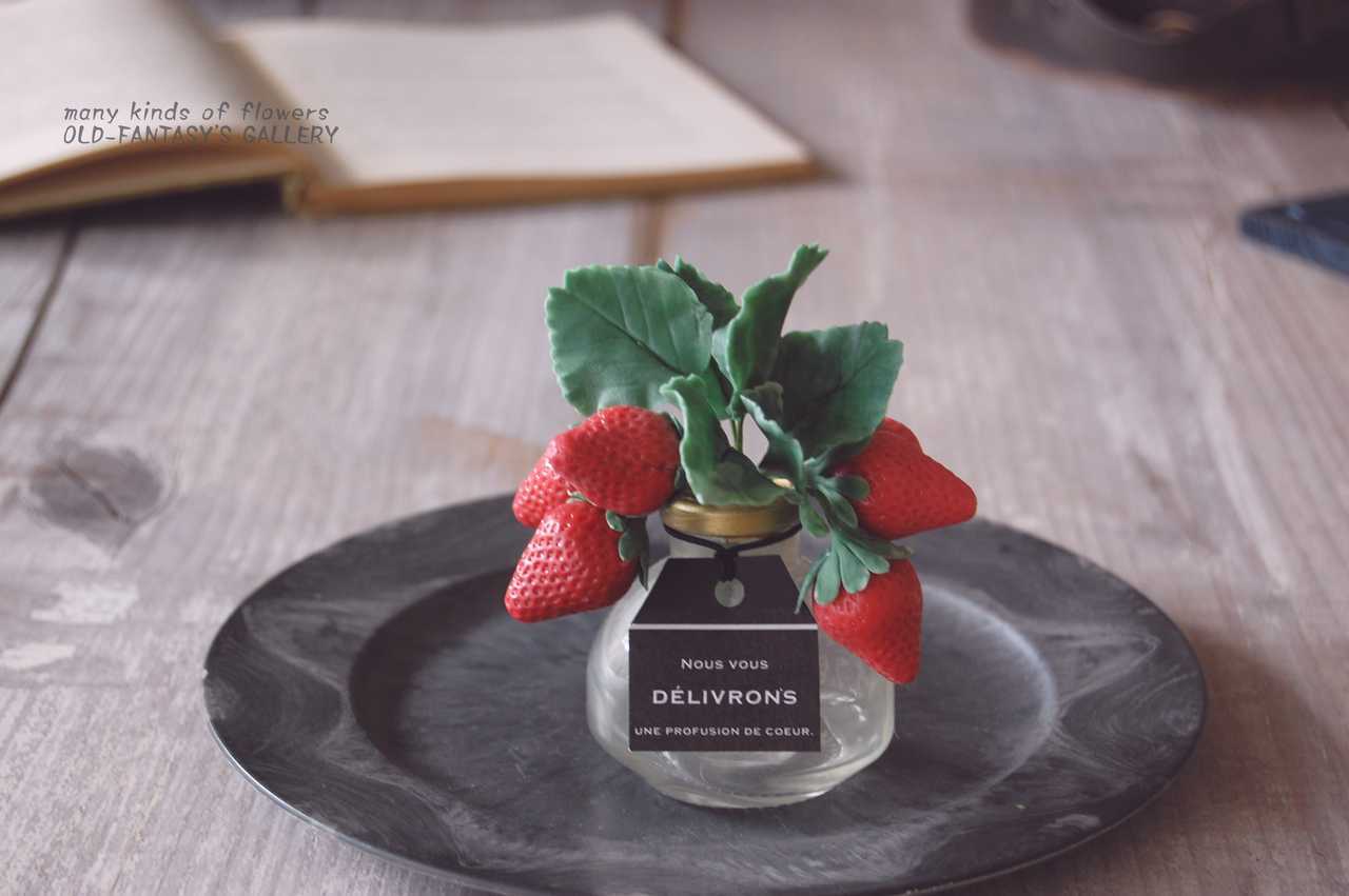 枯れないイチゴ♡ 苺をアンティーク ミニ ホラリング・フラットボトルに飾って・・・Ⅰ453