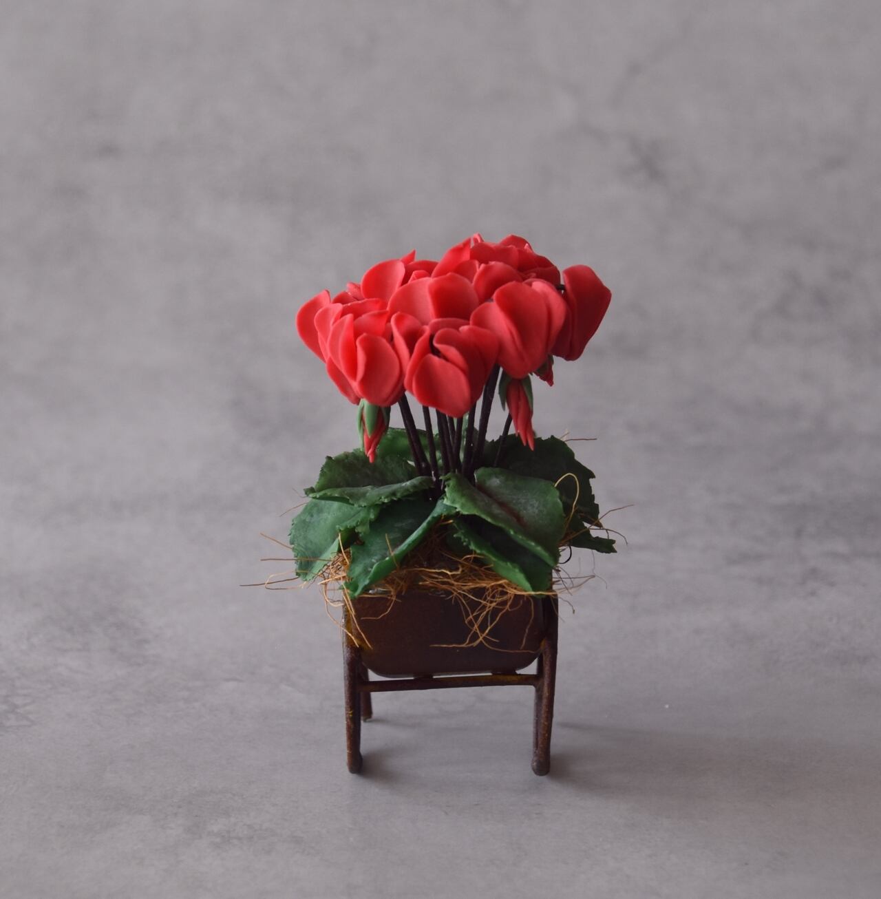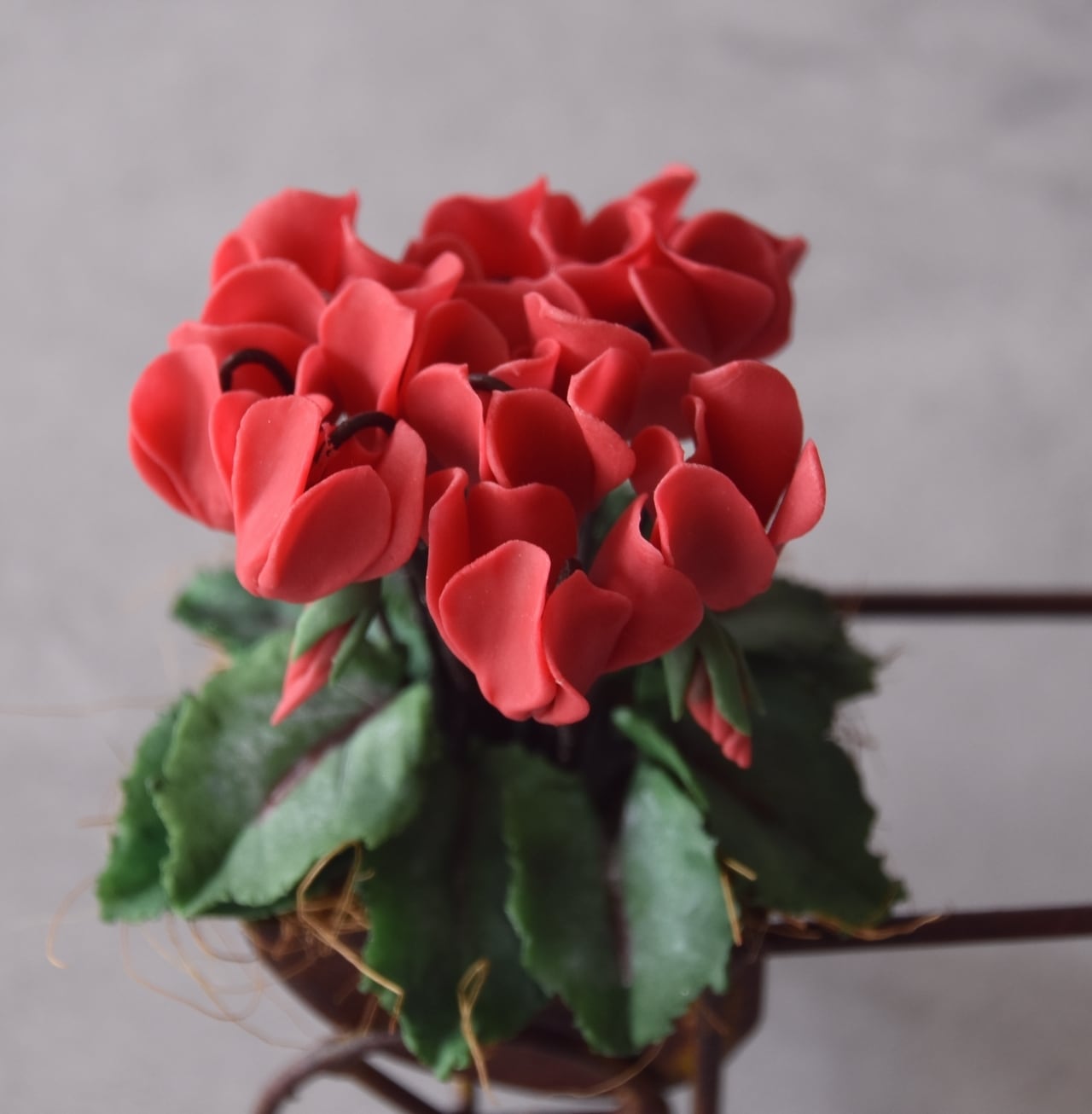 手のひらにちょこんと乗る小さなサイズで、小さなシクラメンがとても可愛らしい作品です。
