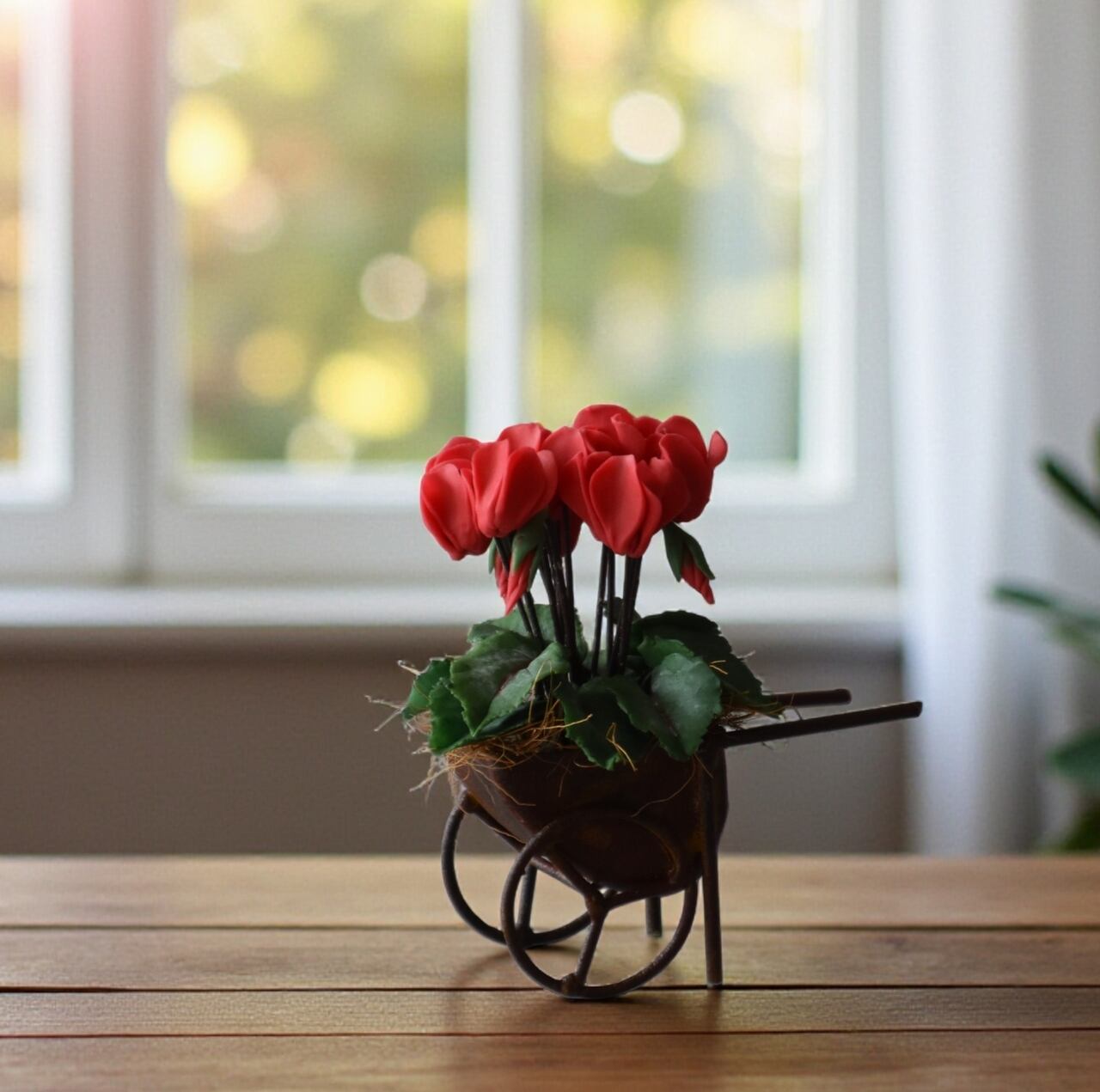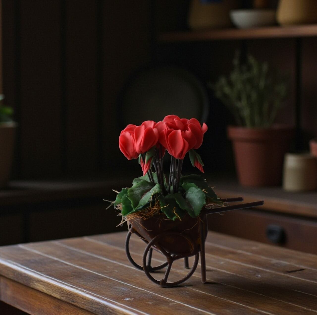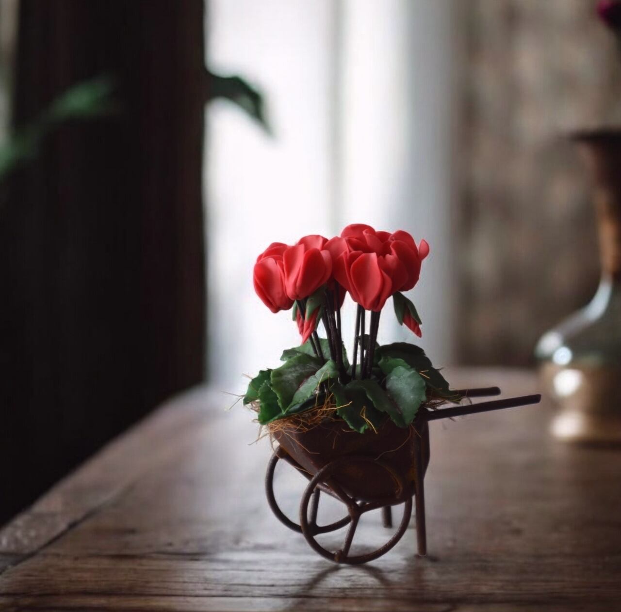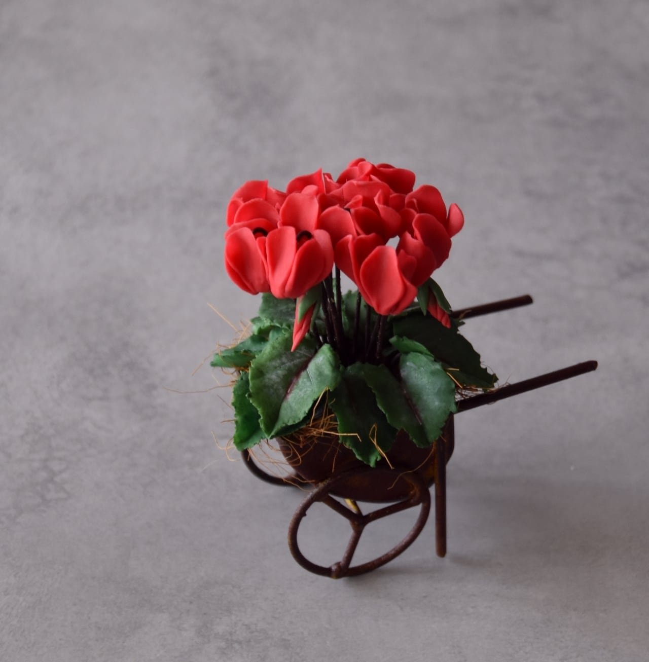 ◆粘土のお花◆ 小さなシクラメン アンティーク ブリキ車輪… S1327