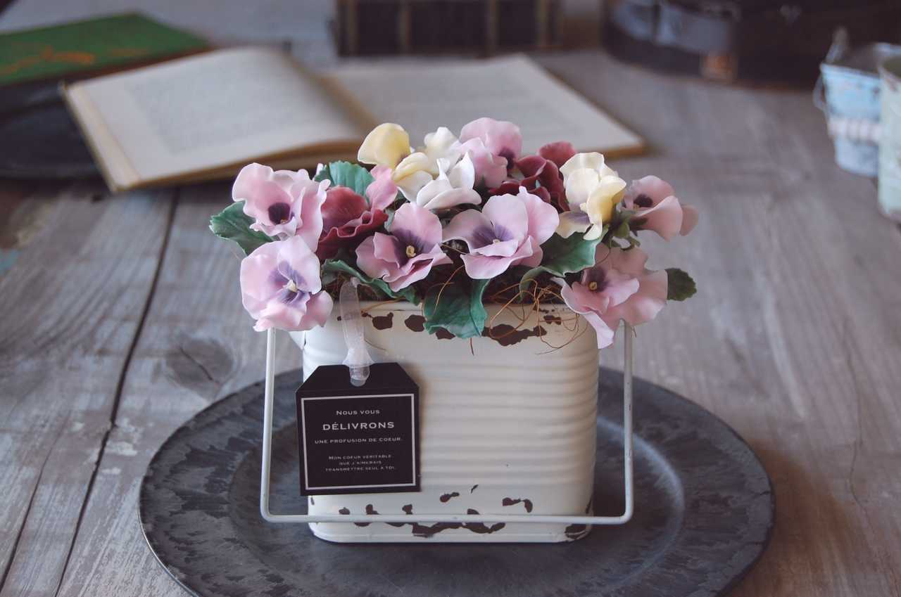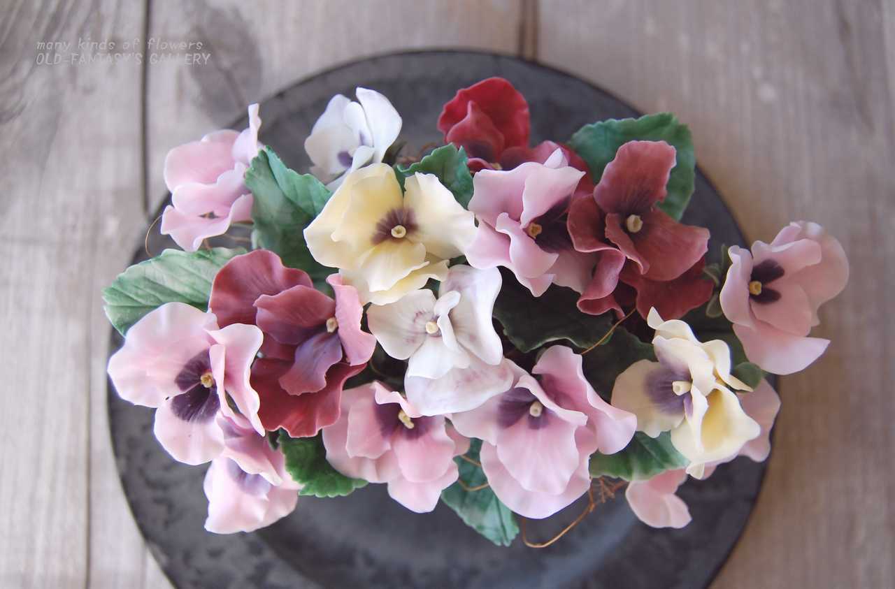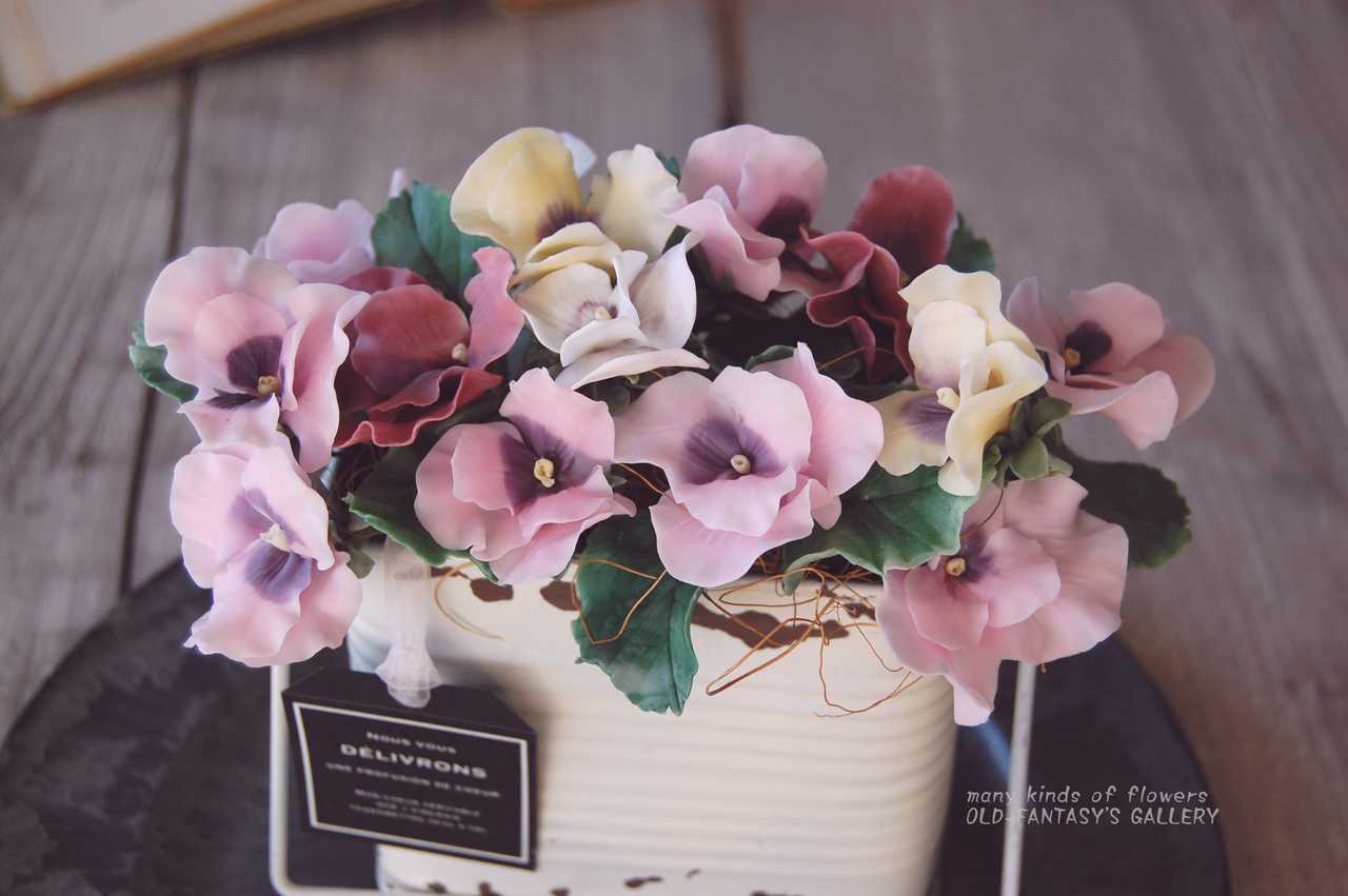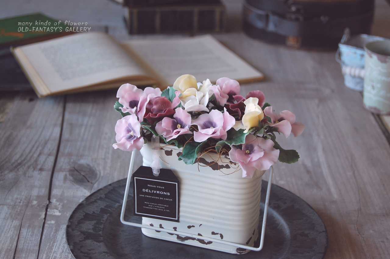 ビオラを アンティーク ブリキポットに飾って・・・ピンク&ホワイト&レッド&イエロー B456