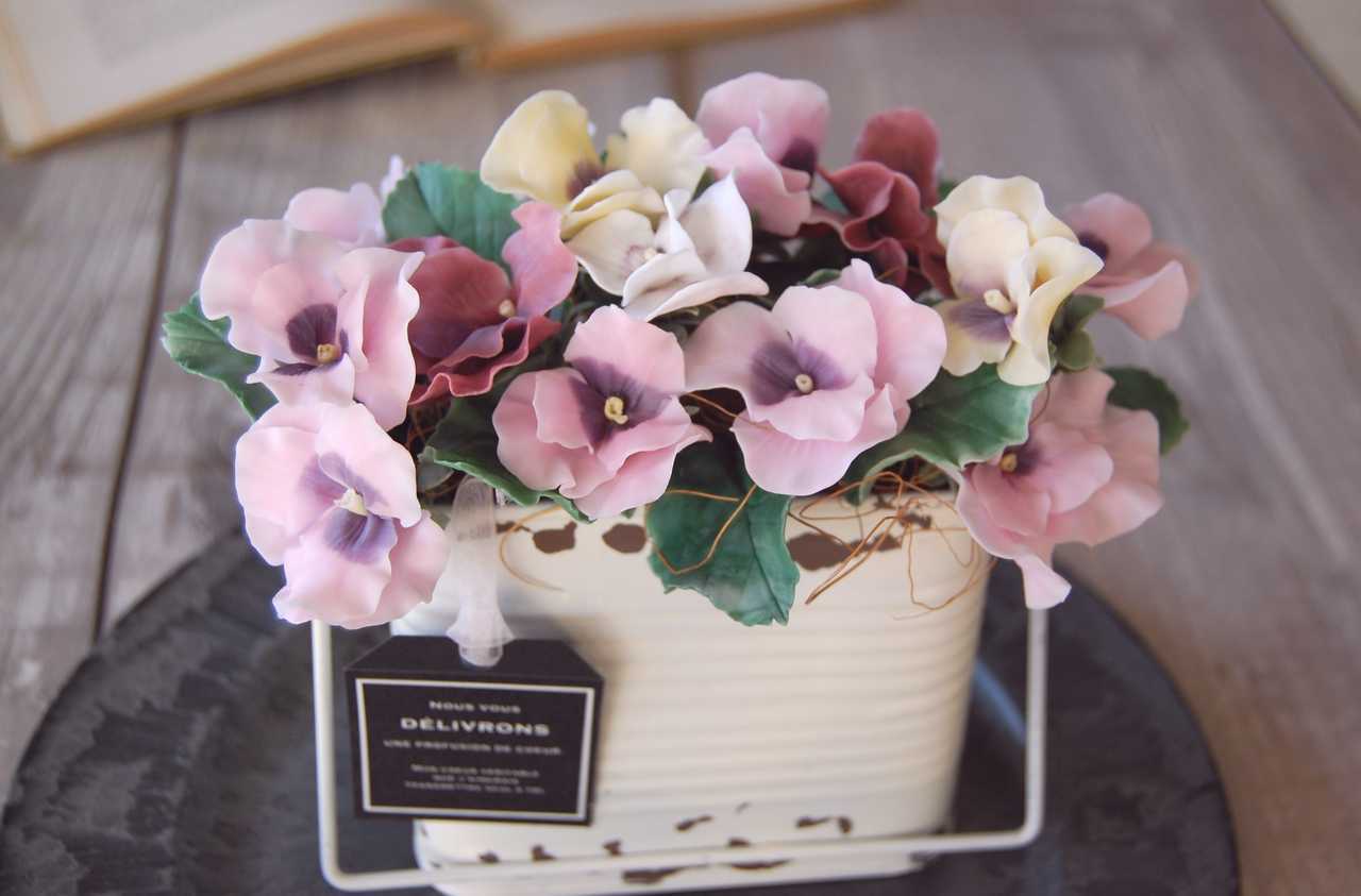アンティーク調のホワイトブリキポットに大輪のビオラを飾りました。