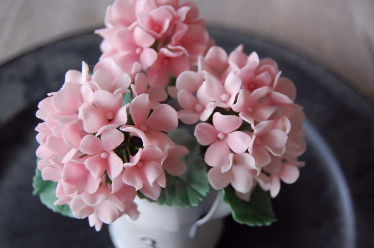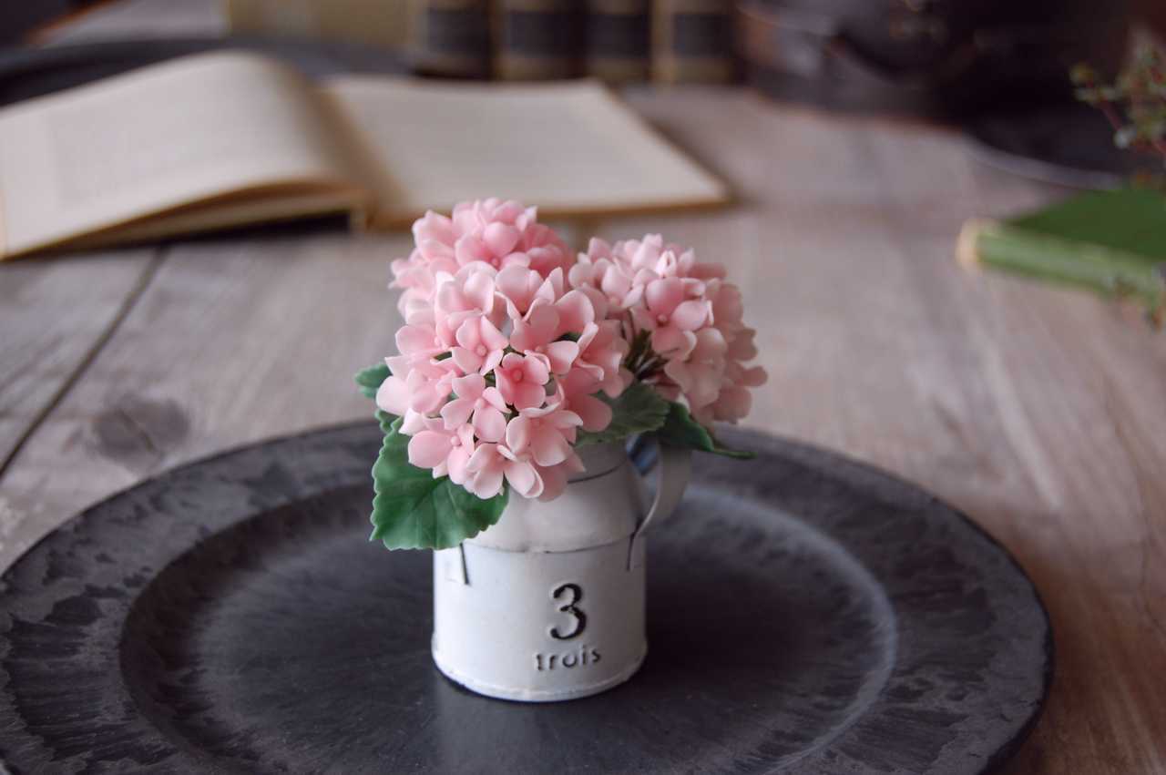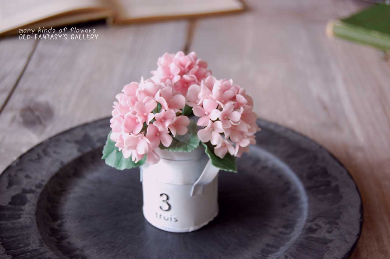 粘土で紫陽花を作り、小さなブリキのミルク缶に飾りました。