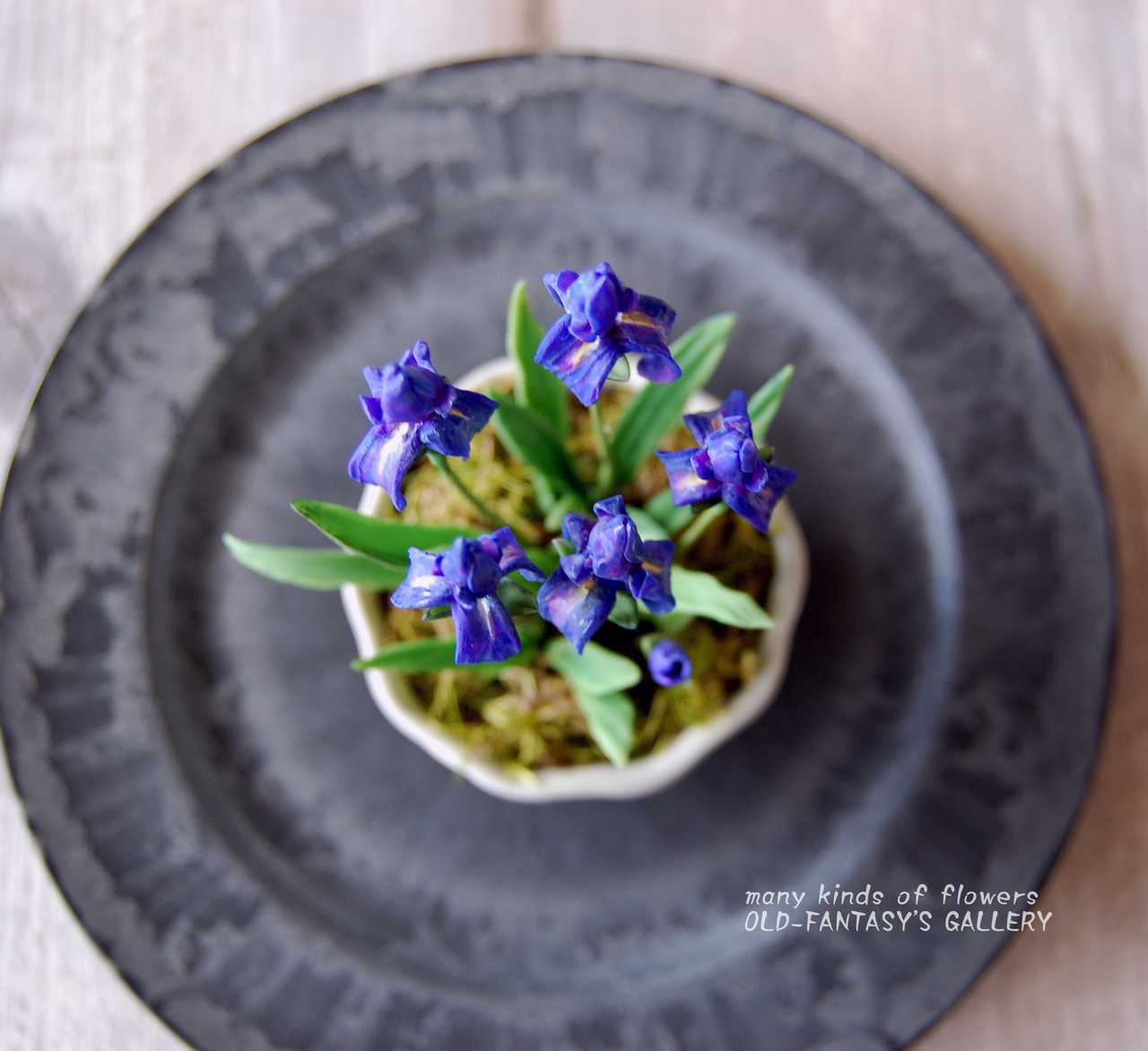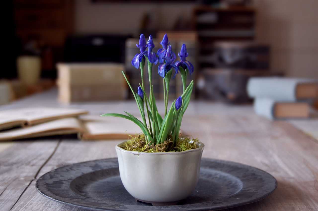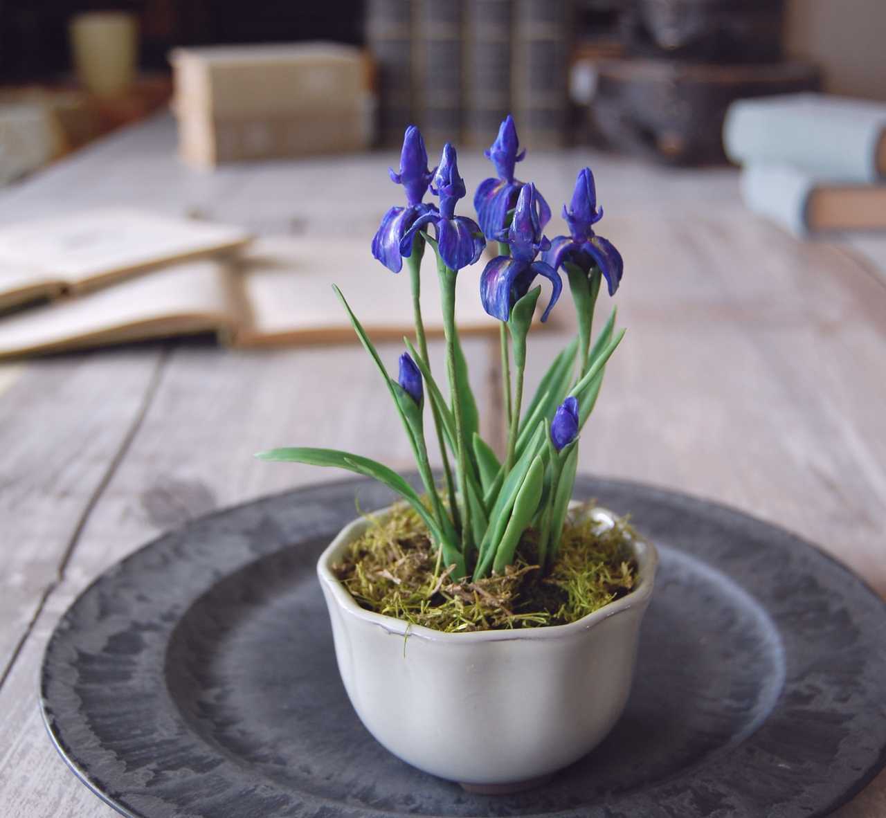 今回は菖蒲(あやめ)を気軽に楽しんでいただけるように、ミニサイズの菖蒲(あやめ)を粘土でを作り、手のひらにちょこんと乗るサイズの鉢に植え込みました。