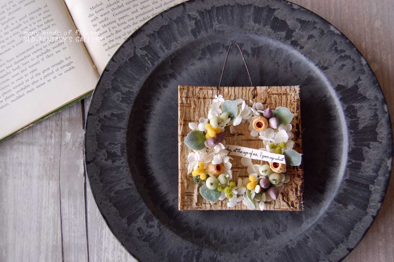 プリザーブドの紫陽花をベースにたっぷりの木の実や小花等を合わせて仕上げています。