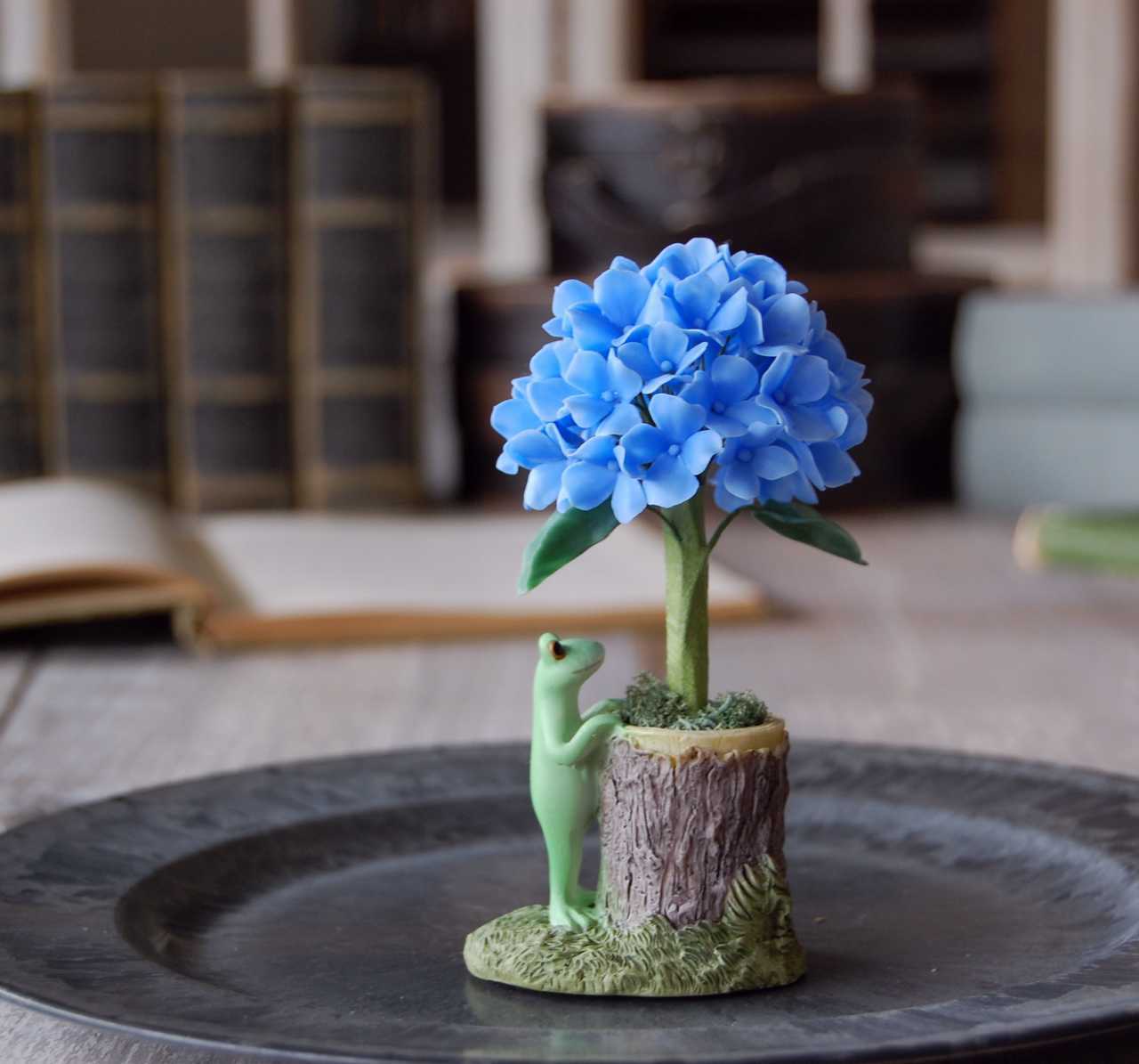 カエルさんが紫陽花で雨宿り♪・・・ブルー 高さ約12センチ A523