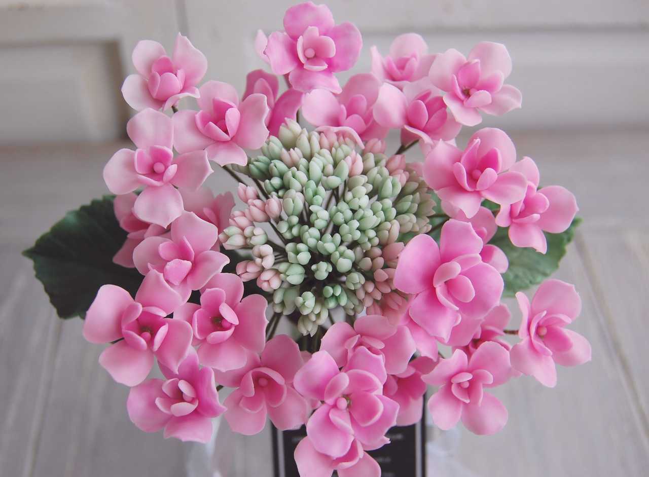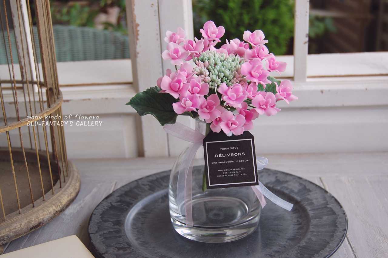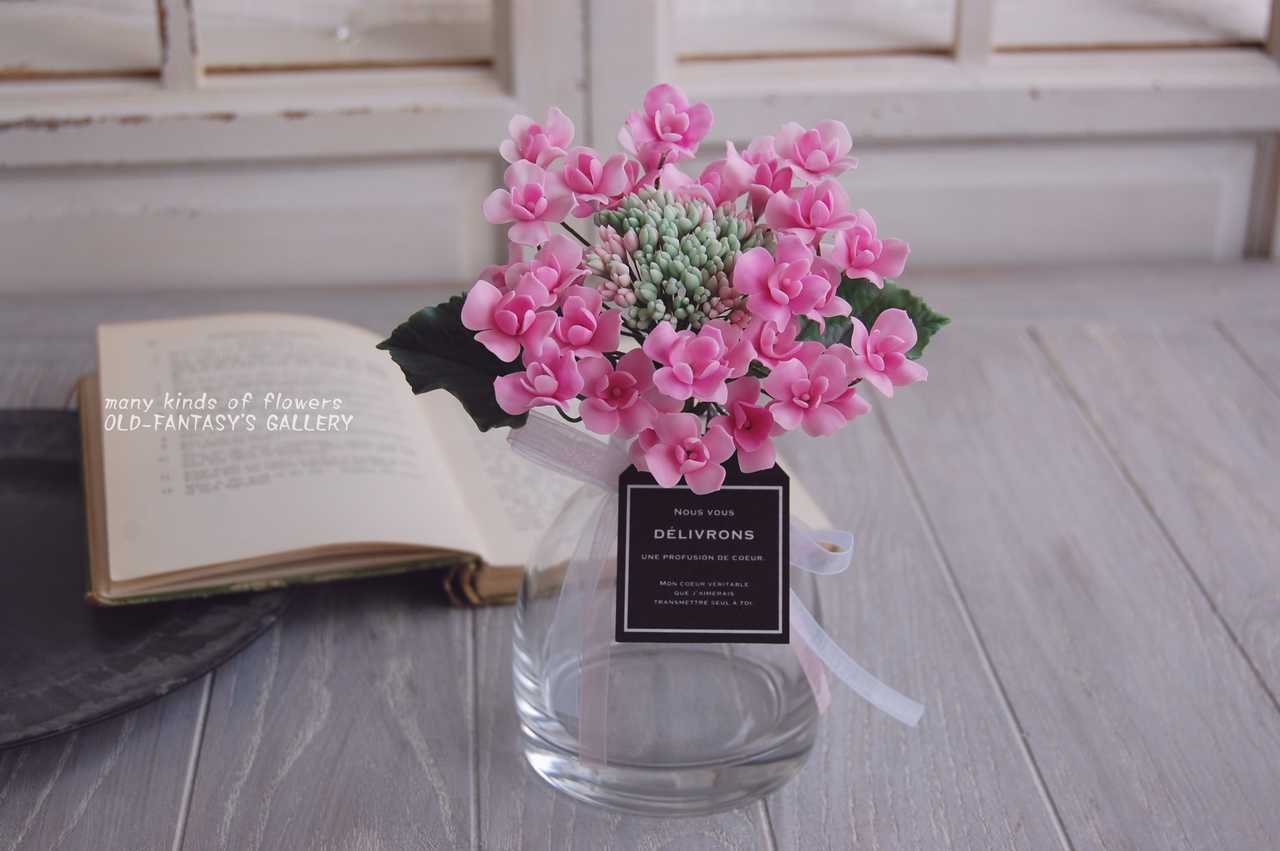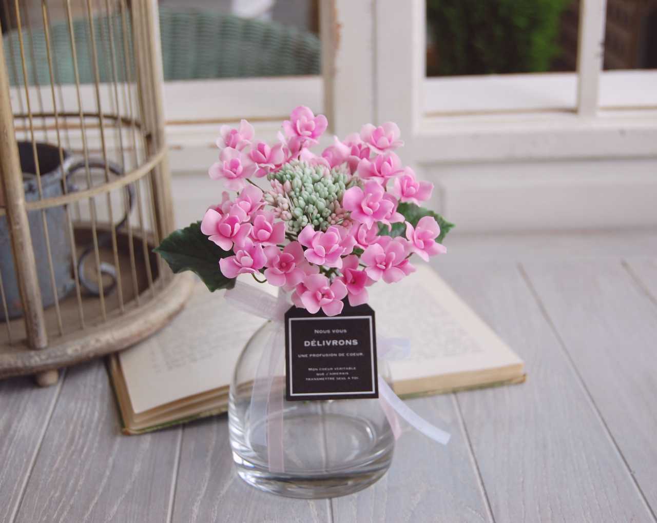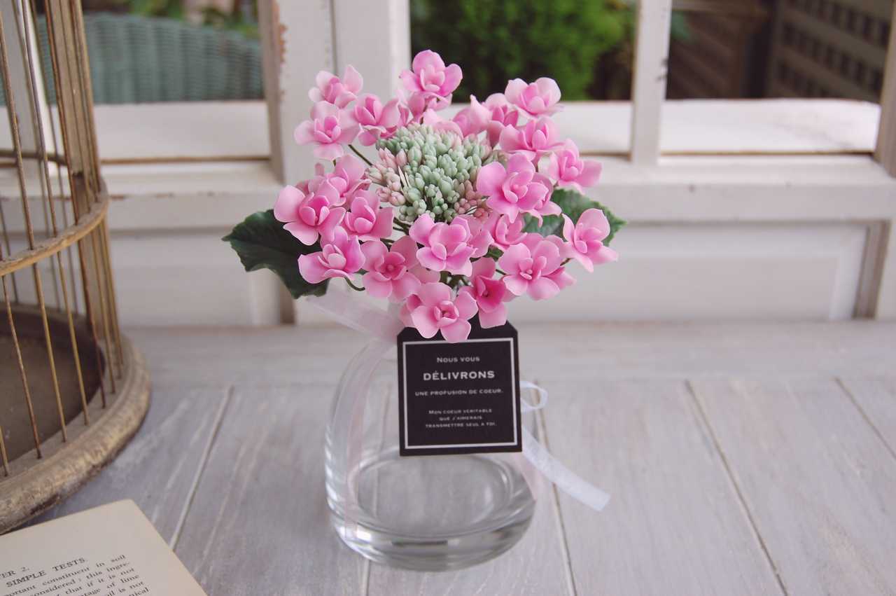 ◆粘土のお花◆ 八重咲きガクアジサイをシンプルガラスボトルに飾って・・・ピンク 高さ約19センチ A528