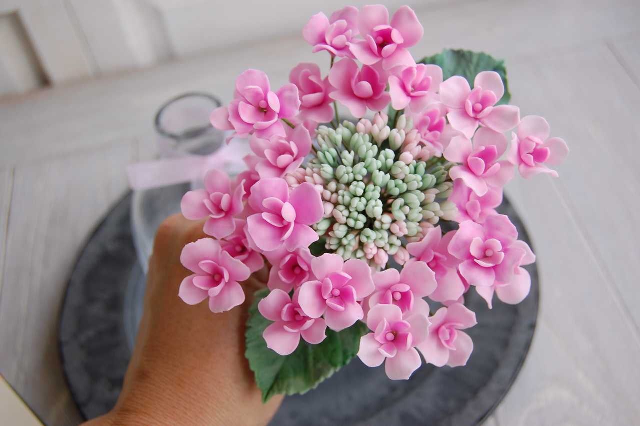 粘土で八重咲きガクアジサイを作り、シンプルなガラスボトルに生けました。