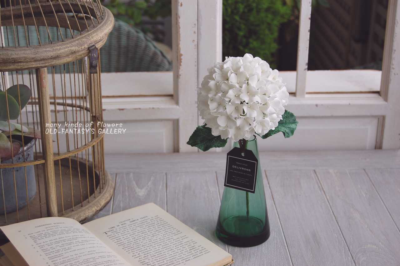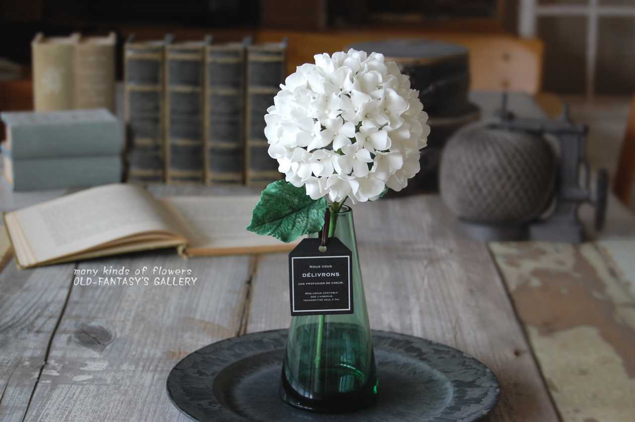 ◆粘土のお花◆ 紫陽花をシンプルグリーンガラスボトルに飾って・・・ホワイト 高さ約28センチ A533