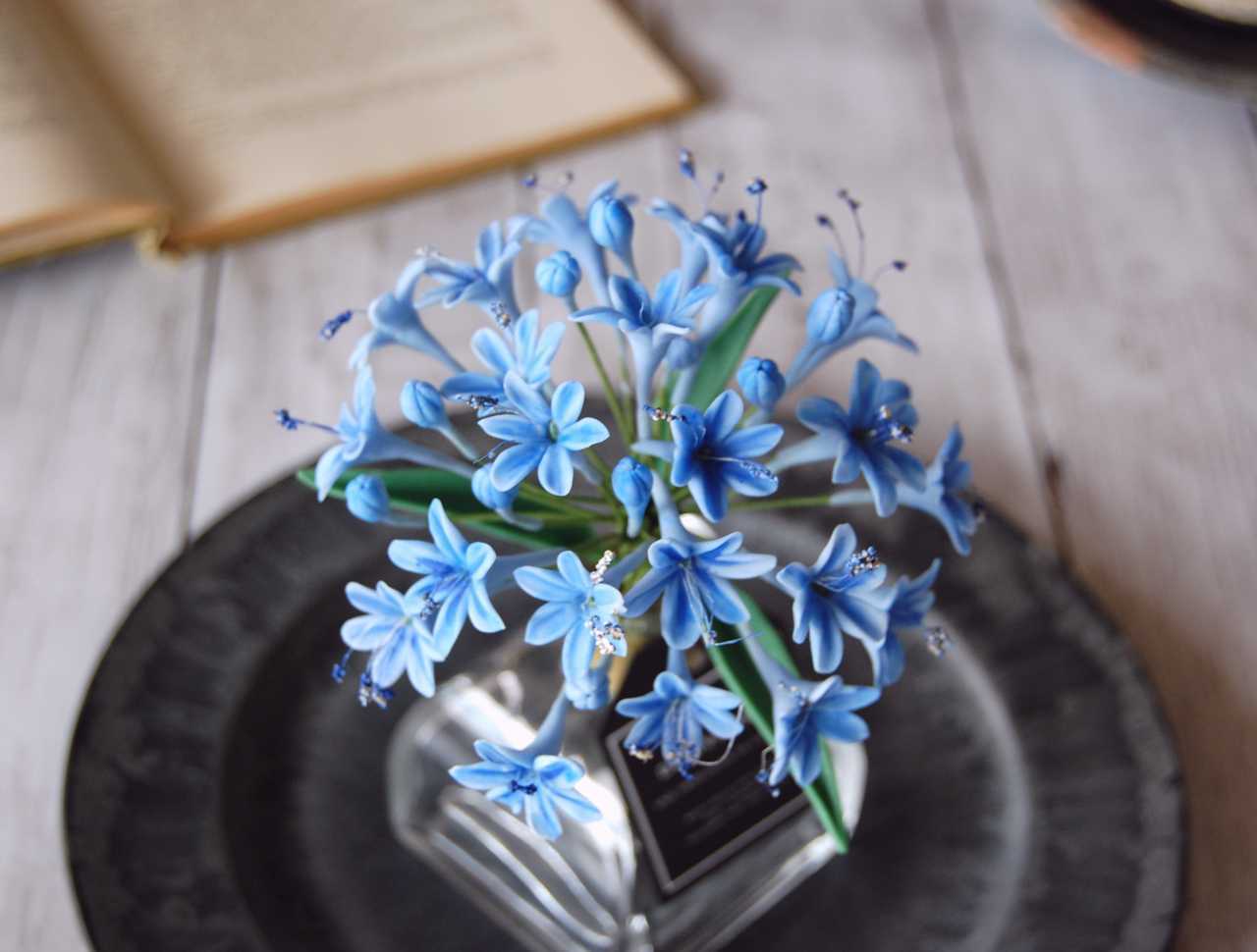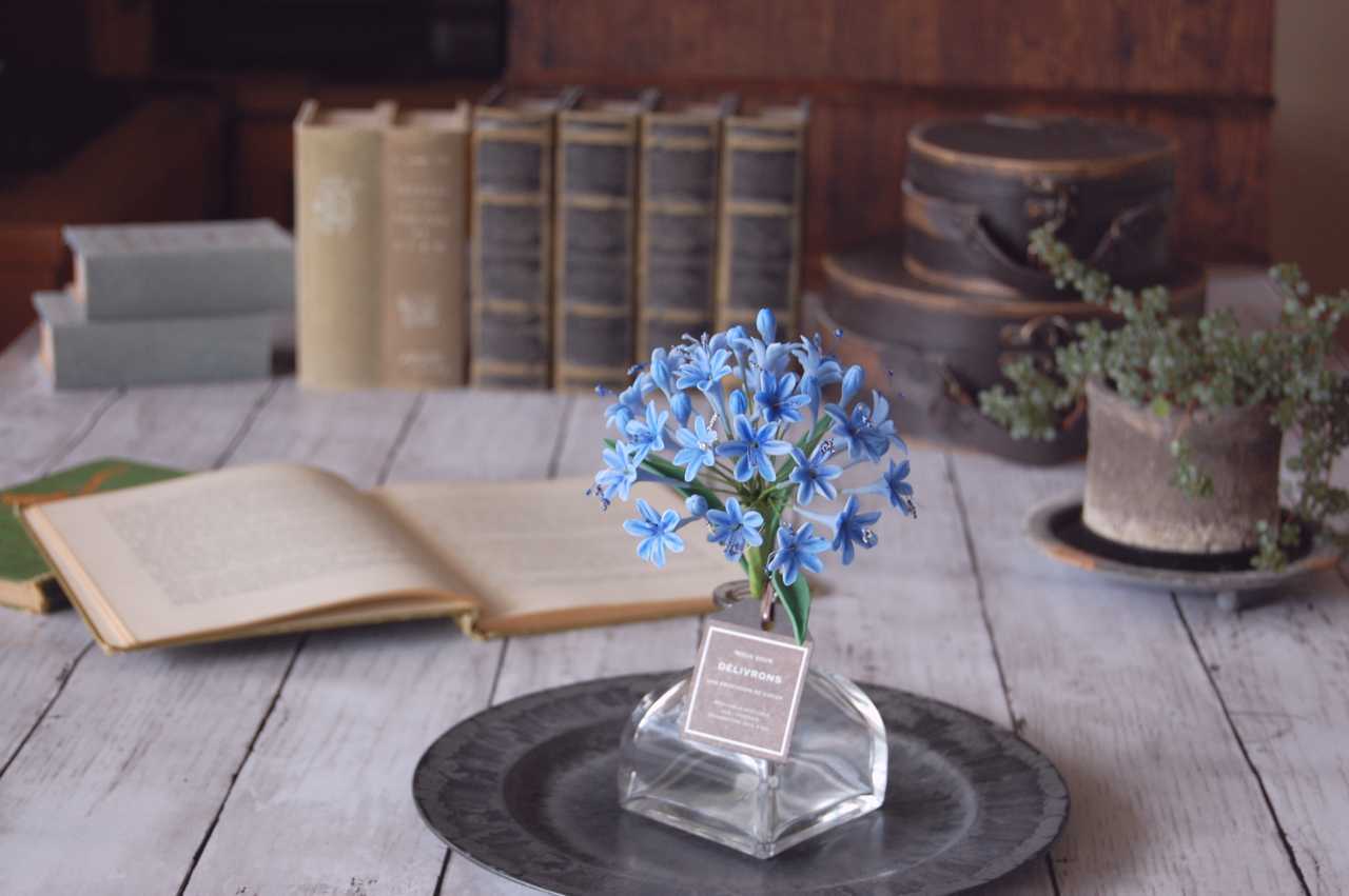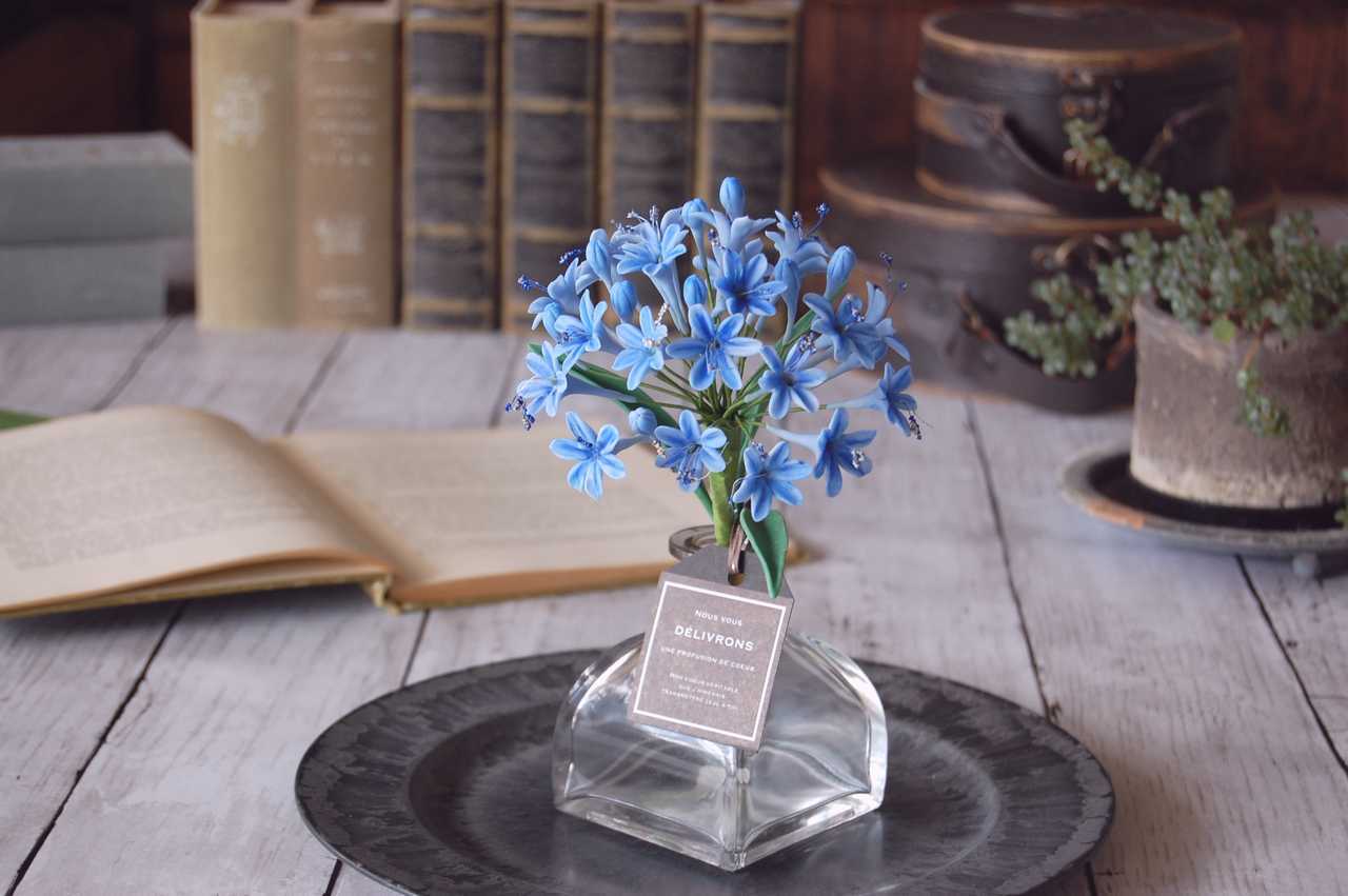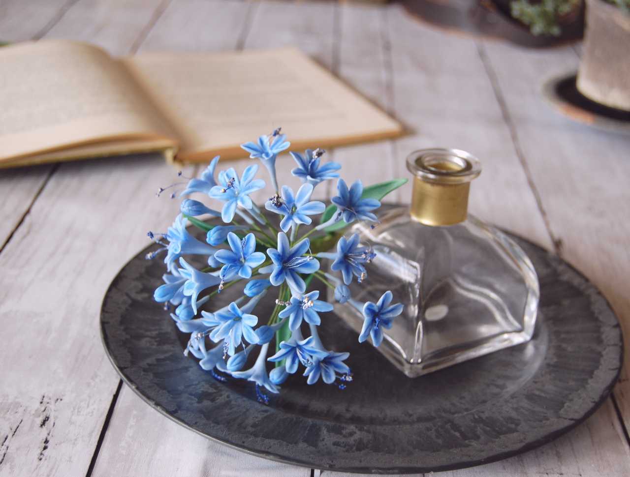 粘土でアガパンサスを作り、どっしりとしたホラリング・ブランテボトルに飾りました。