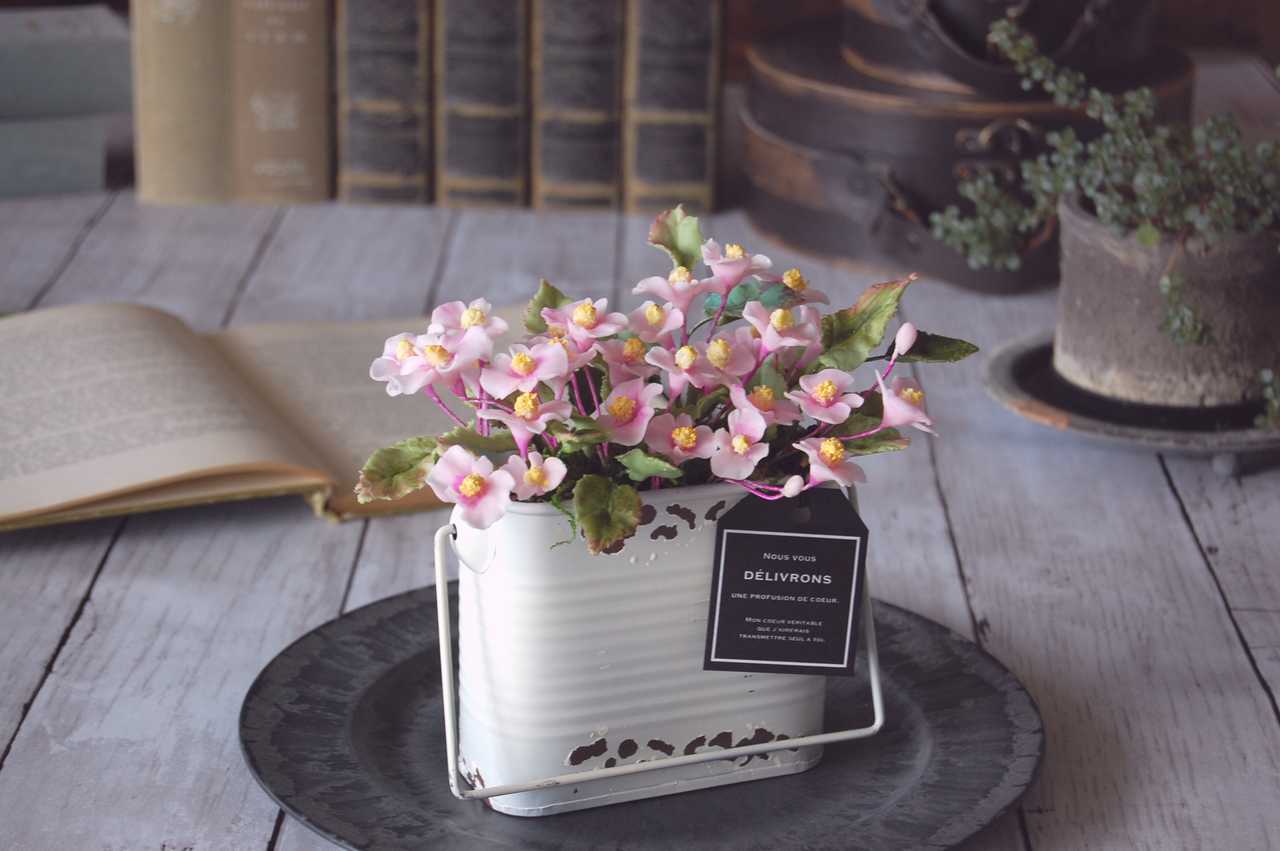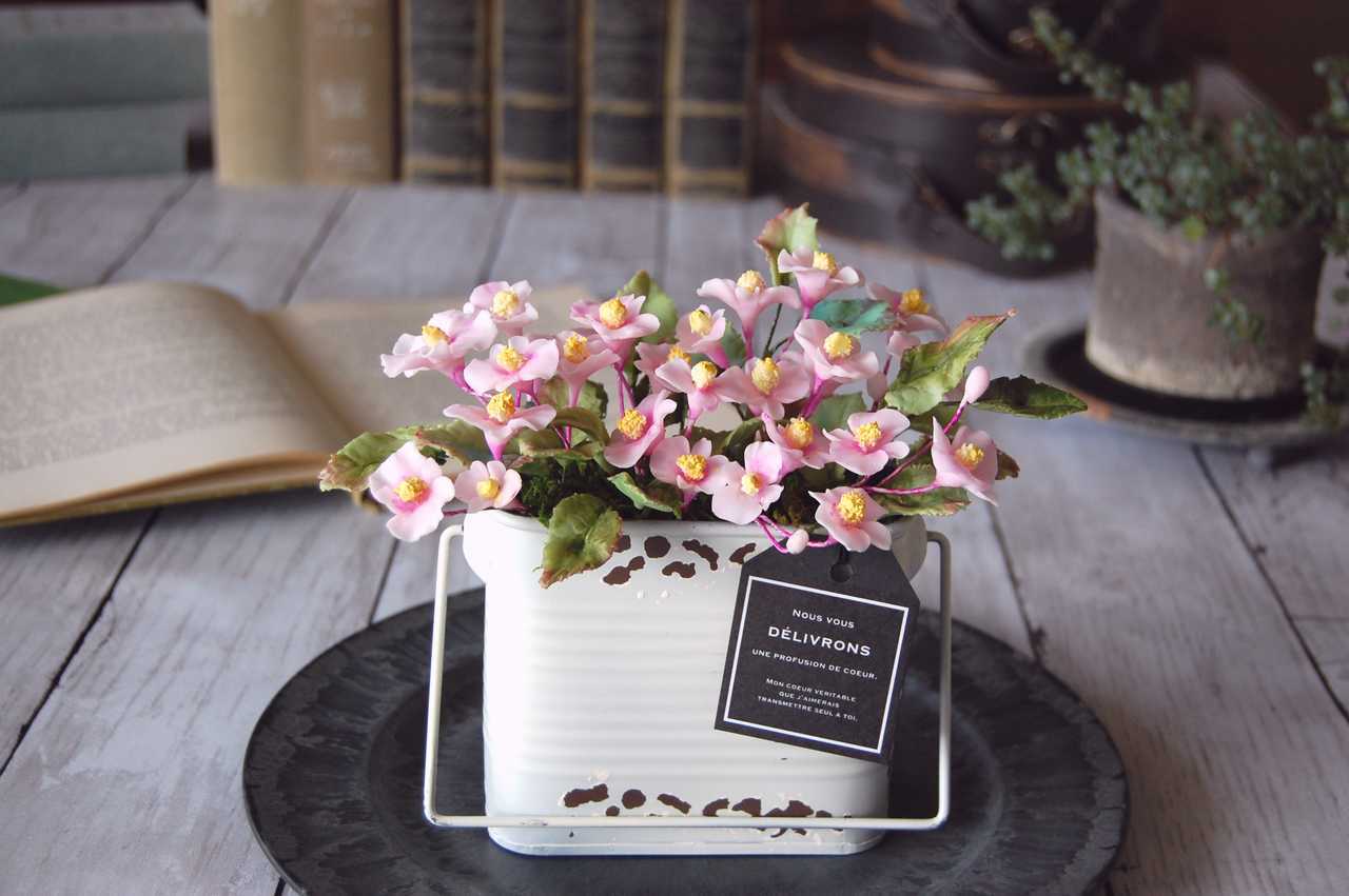 アンティーク調のホワイトブリキポットにたっぷりとベゴニアを植え込みました。