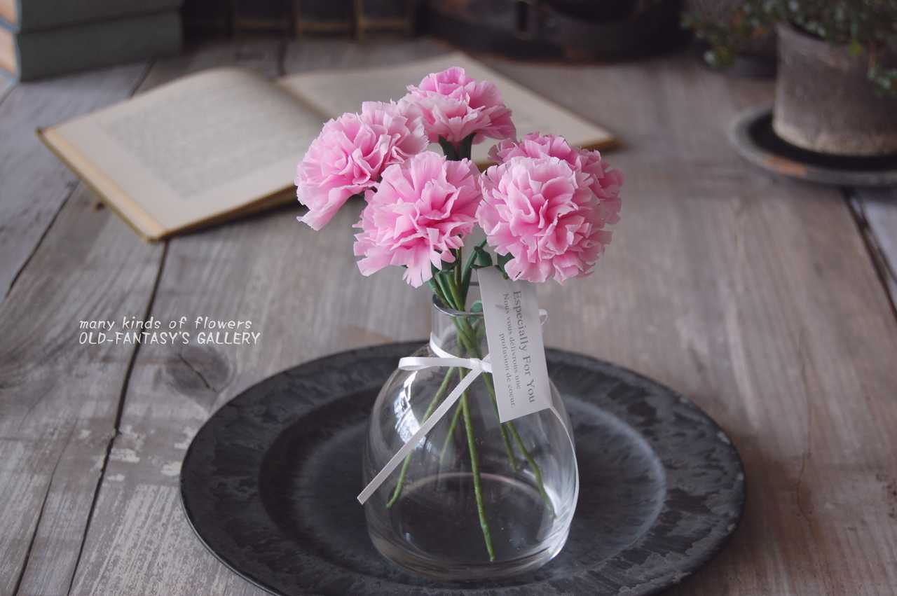そんな人気のカーネーションをたっぷりとシンプルなガラスボトルベース に飾りました。