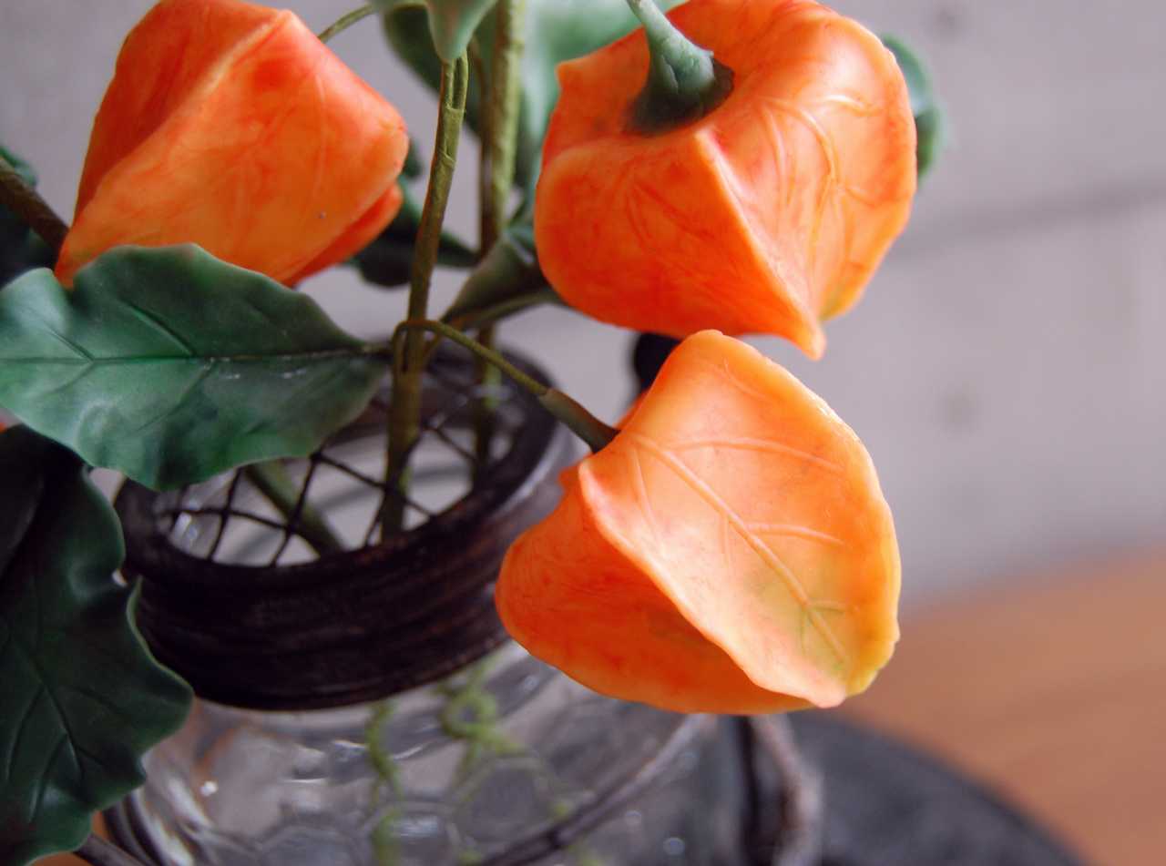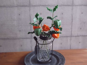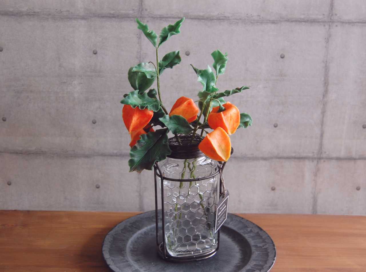 粘土でホオズキを作り、ガラスとアイアンがおしゃれなガラスボトルに飾りました。