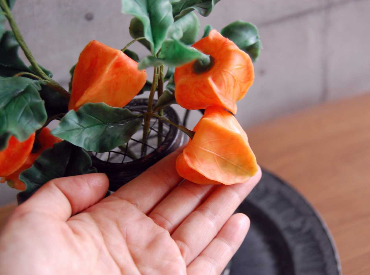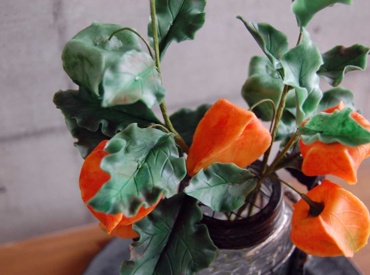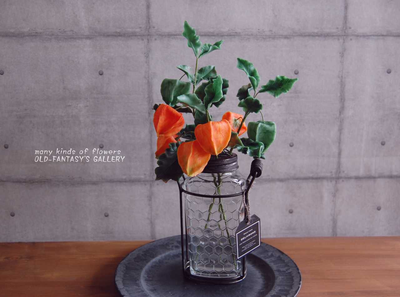 ◆粘土のお花◆ ホオズキ(鬼灯)をアイアンボトルに飾って・・・ 高さ約36センチ H554