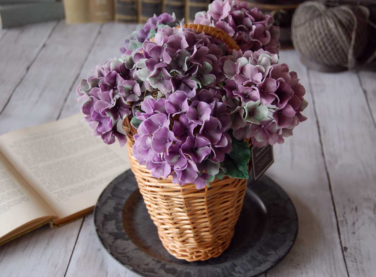 ◆粘土のお花◆ 秋色アジサイをバスケットに飾って・・・ 高さ約26センチ A557