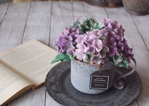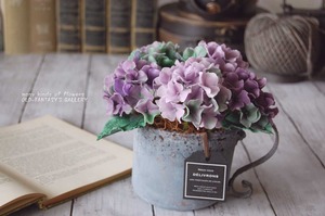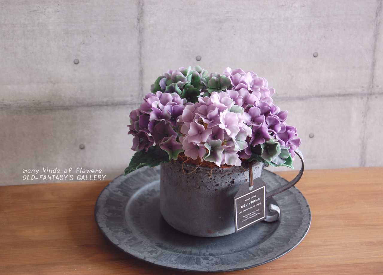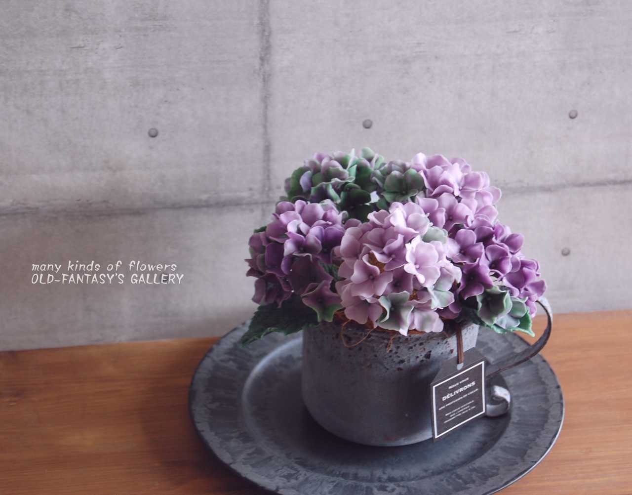 ●アンテーィクブリキポットとのセットでの販売です。紫陽花はポットに固定しております。