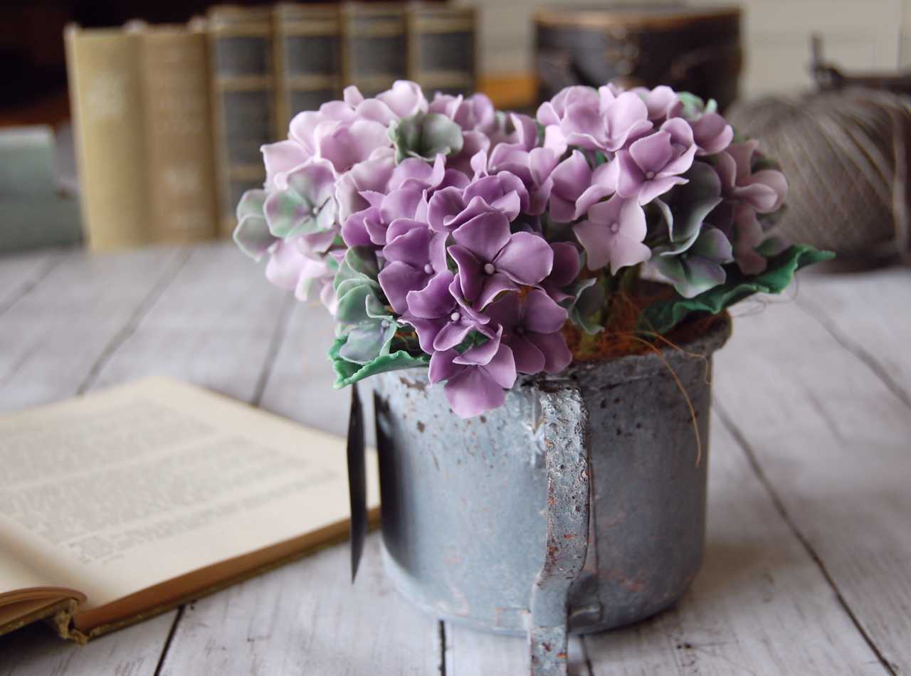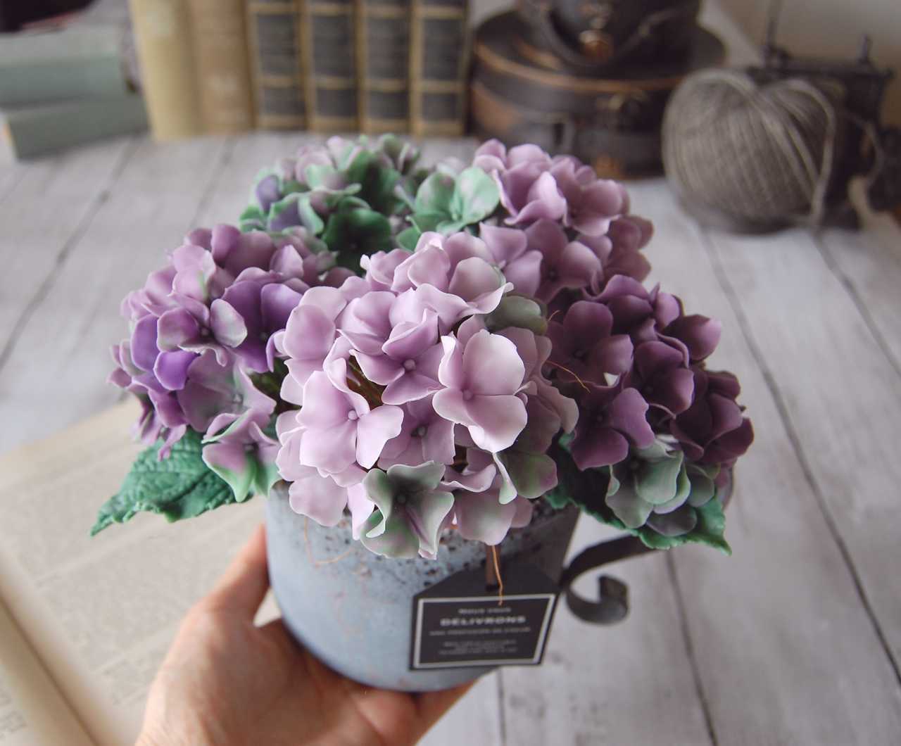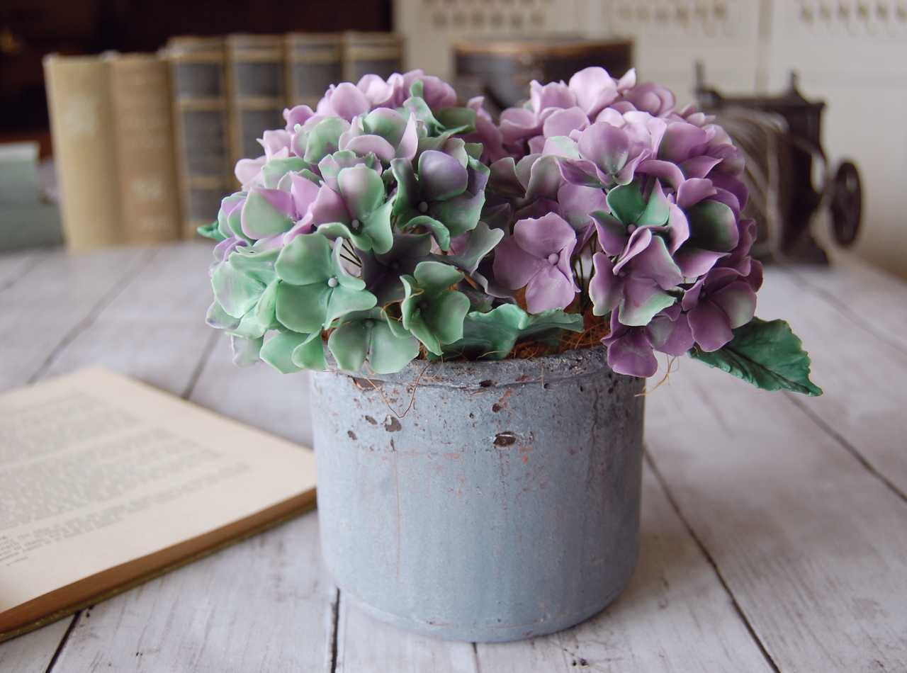◆粘土のお花◆ 秋色アジサイをアンテーィクブリキポットに飾って・・・パープルグリーン 高さ約18センチ A561