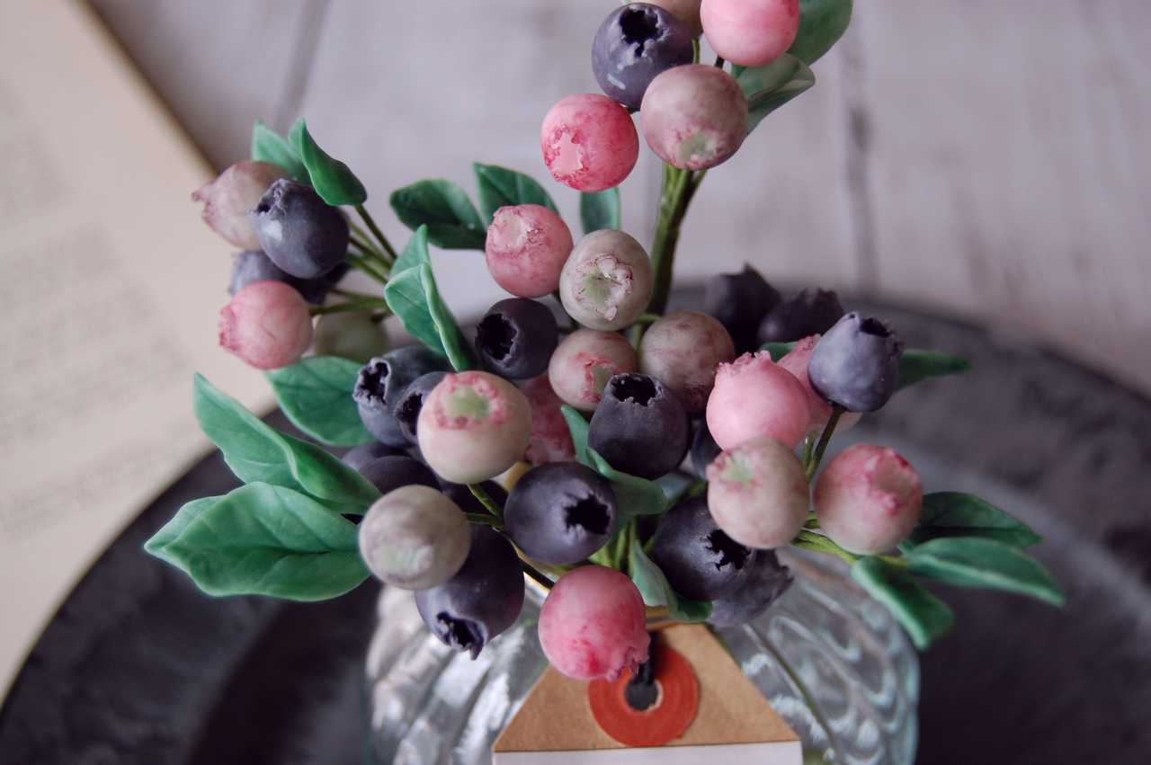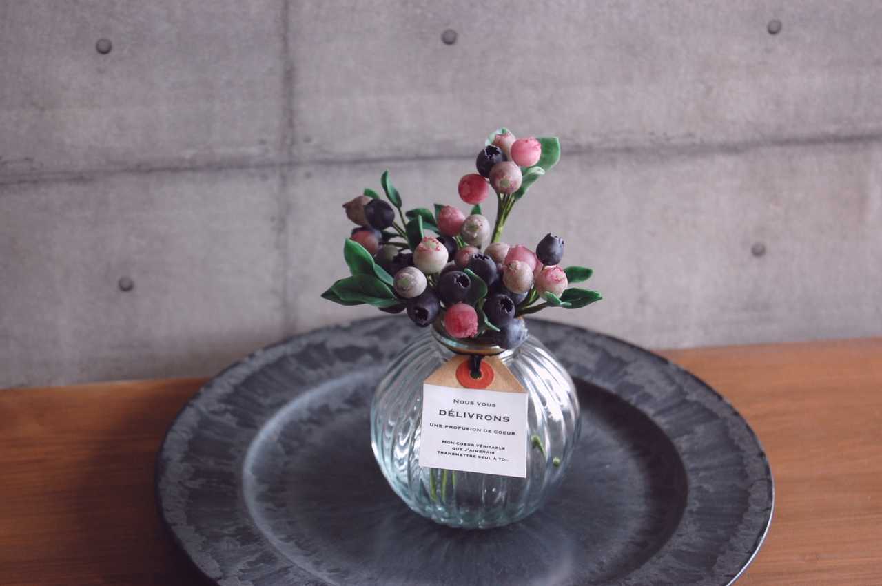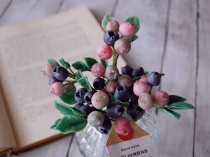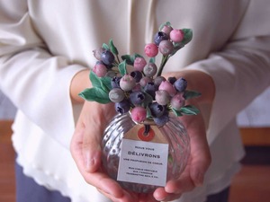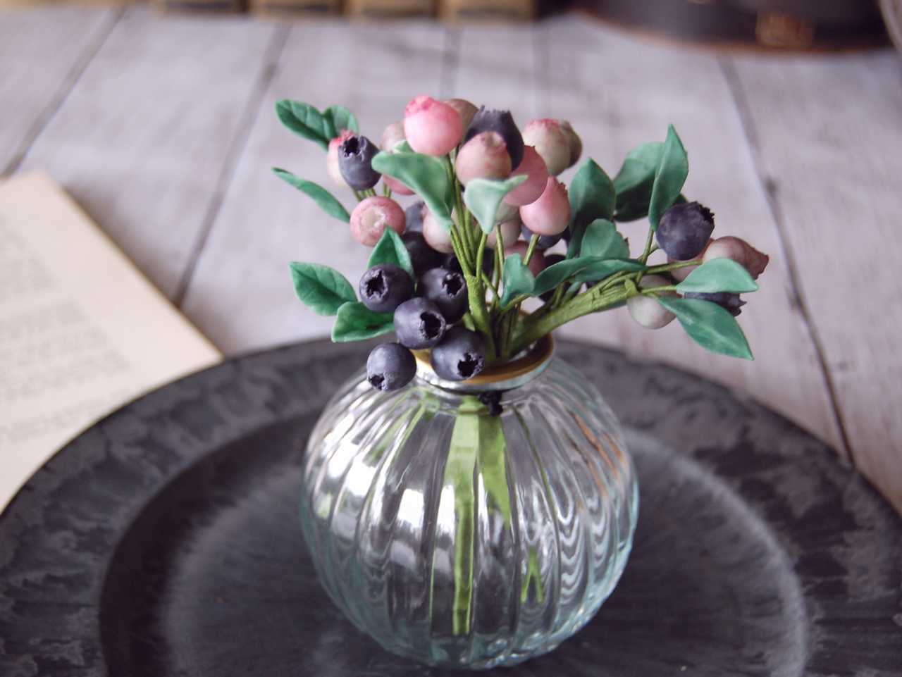 ◆粘土のお花◆ ブルーベリーをぽってりガラスボトル飾って・・・ 高さ約15センチ B562