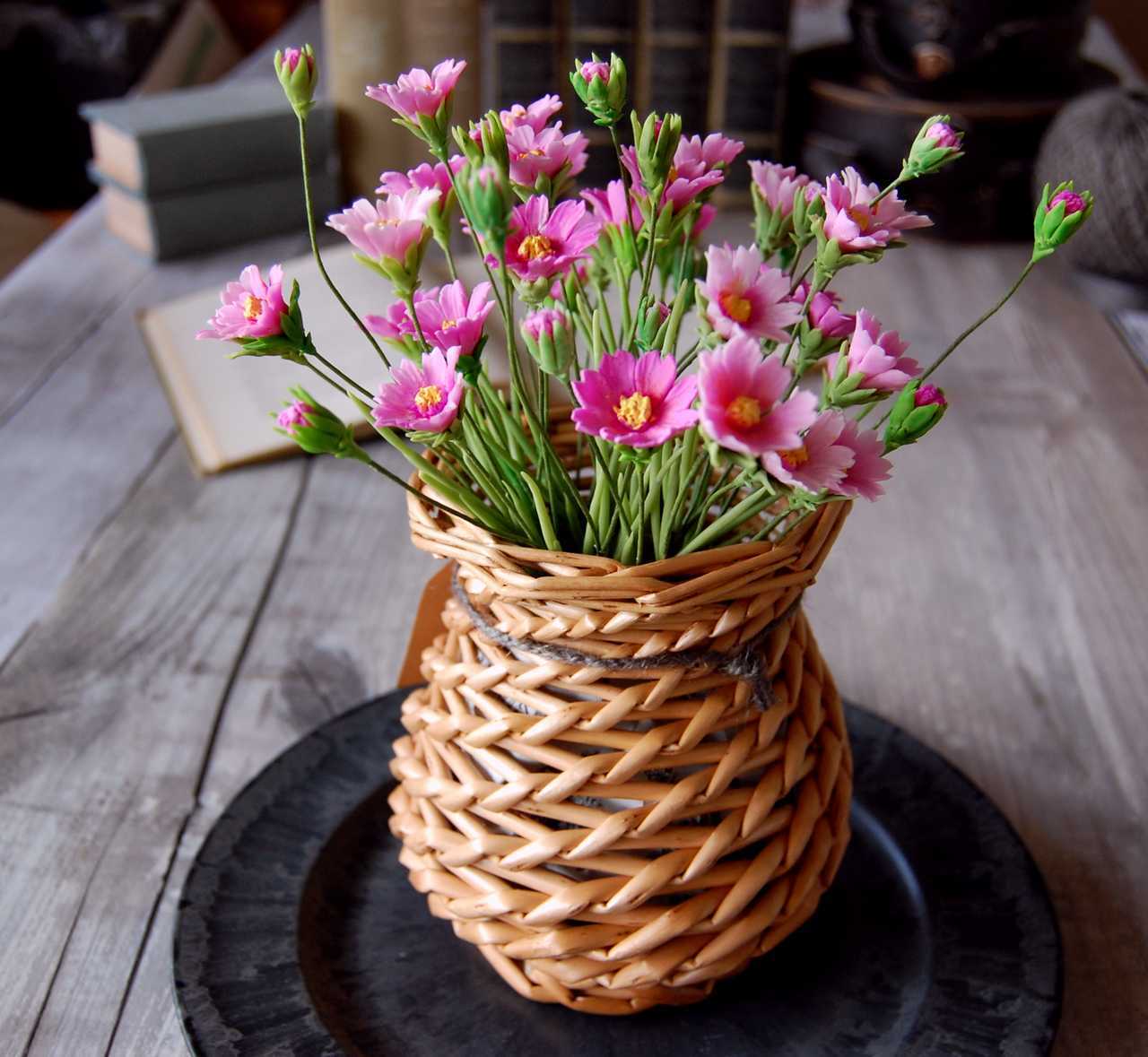 粘土で可憐なブラキカムを作り、籠(バスケット)に飾りました。