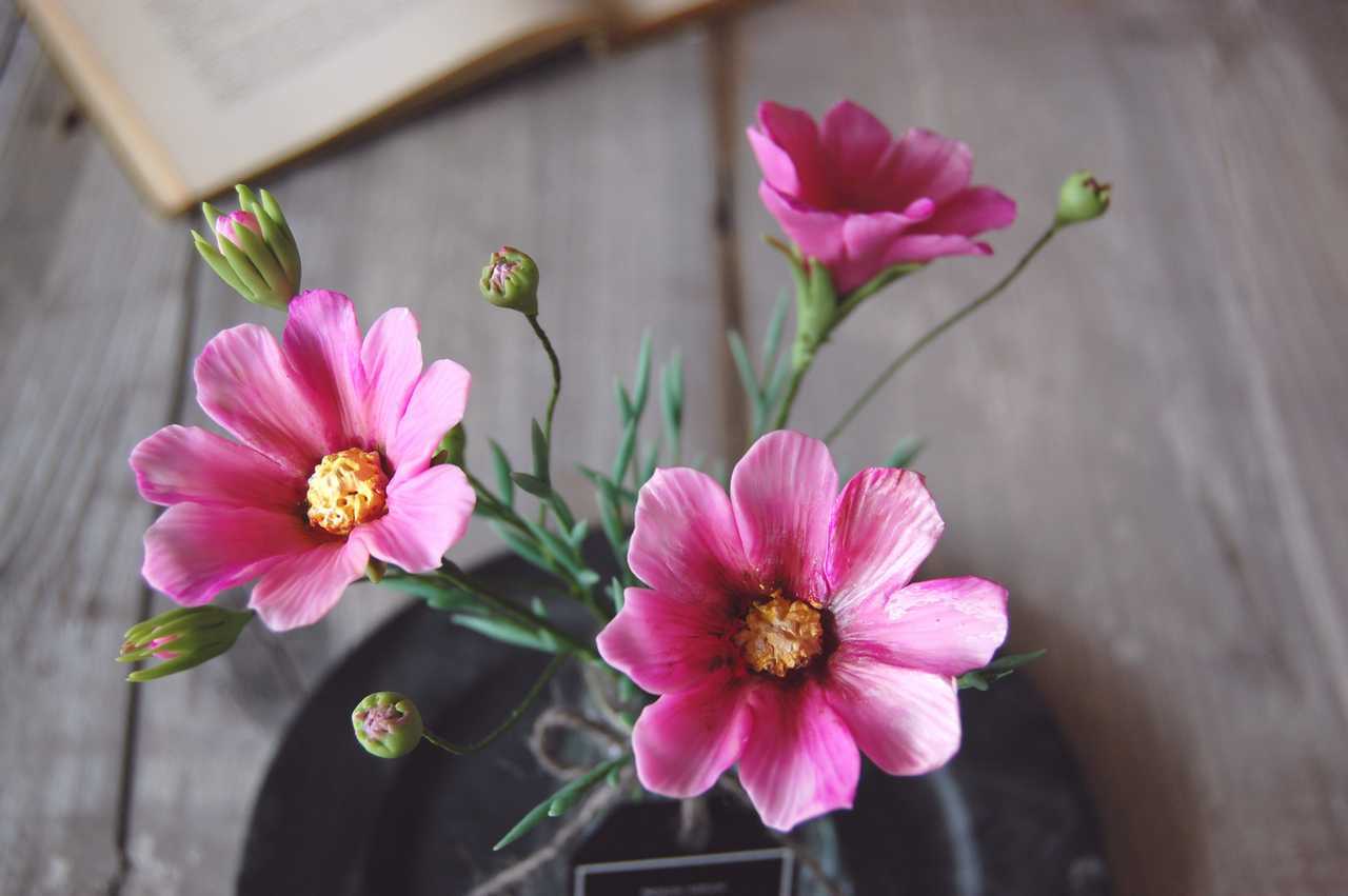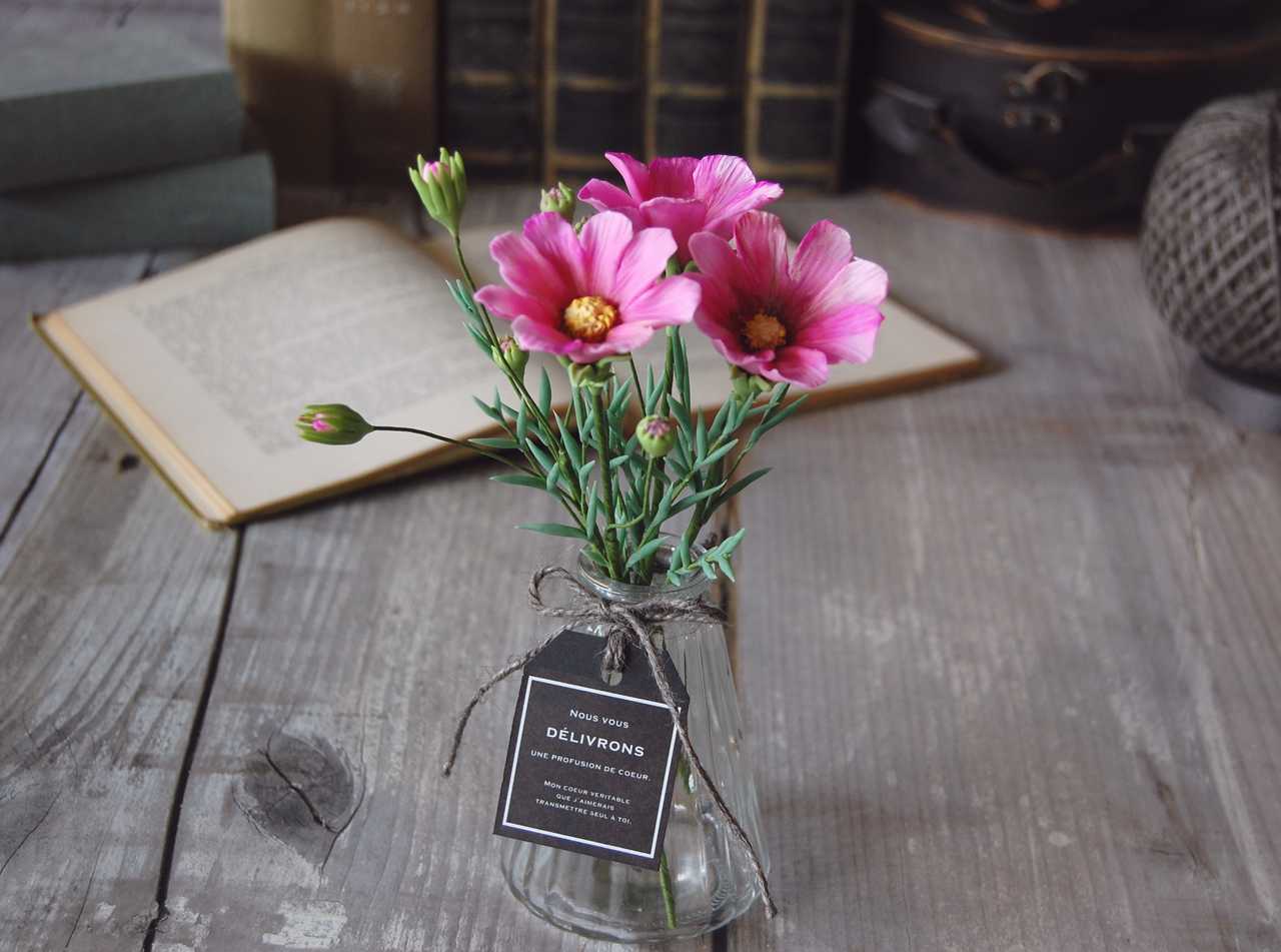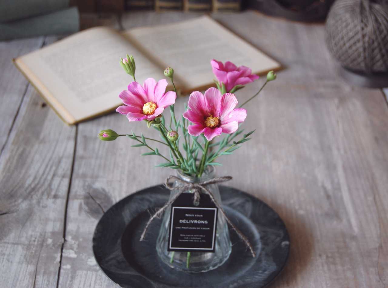 今回は、そんなコスモスを粘土で作りゆったりと3輪、ガラスボトルに飾りました。