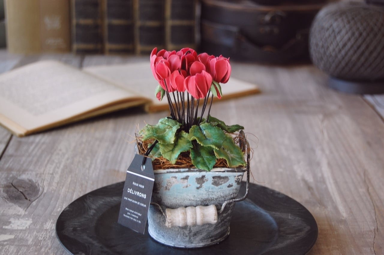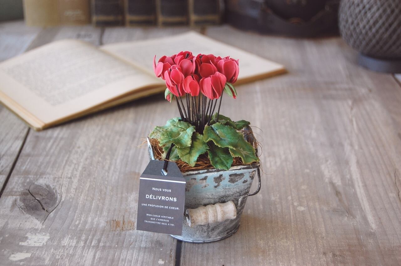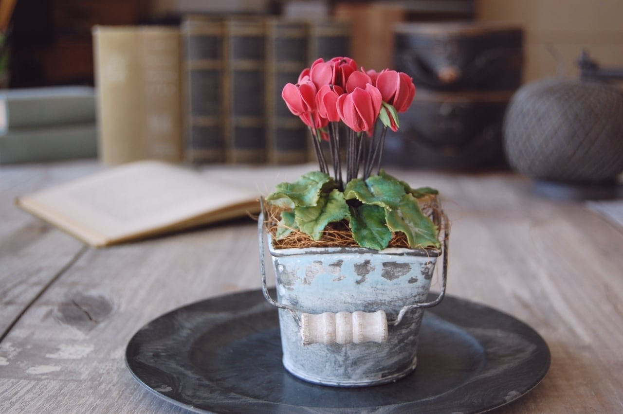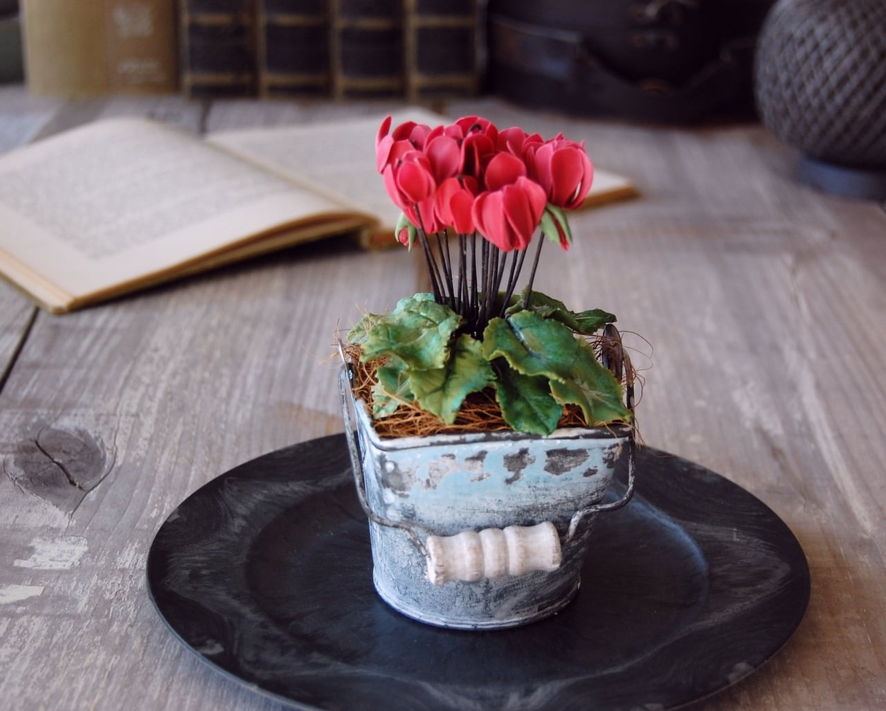 ◆粘土のお花◆ 小さなシクラメン アンティーク ブリキバケツ… S593
