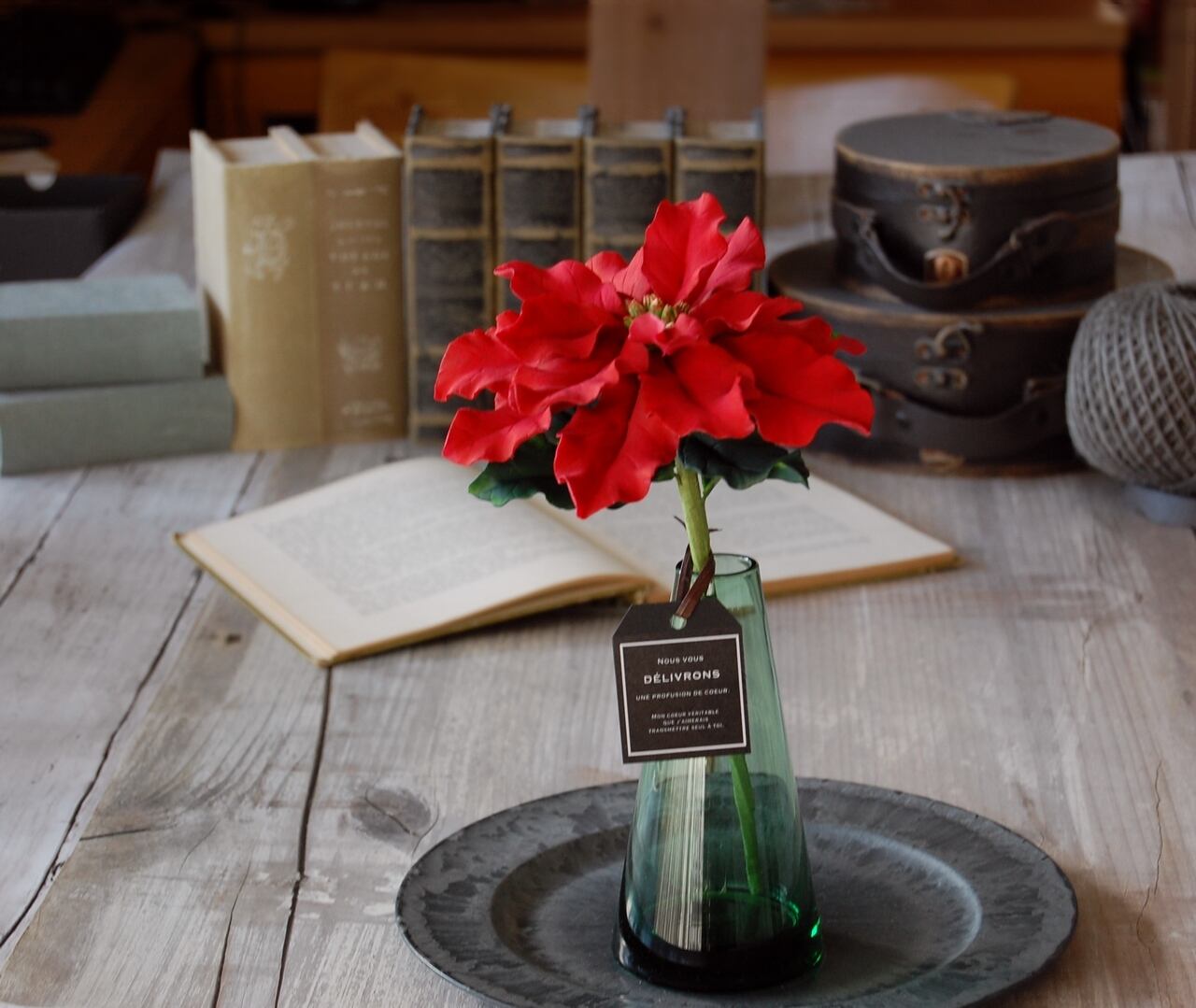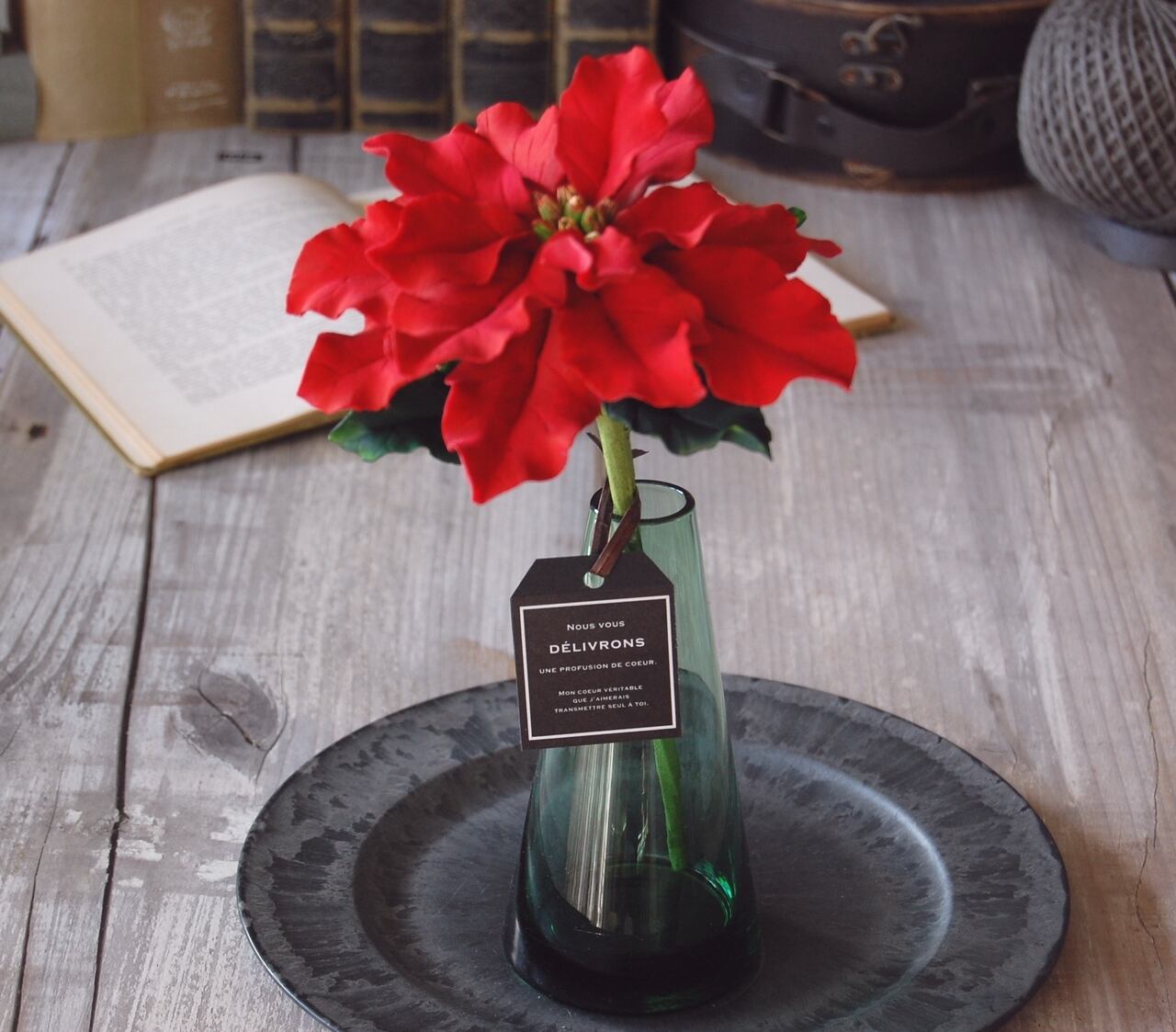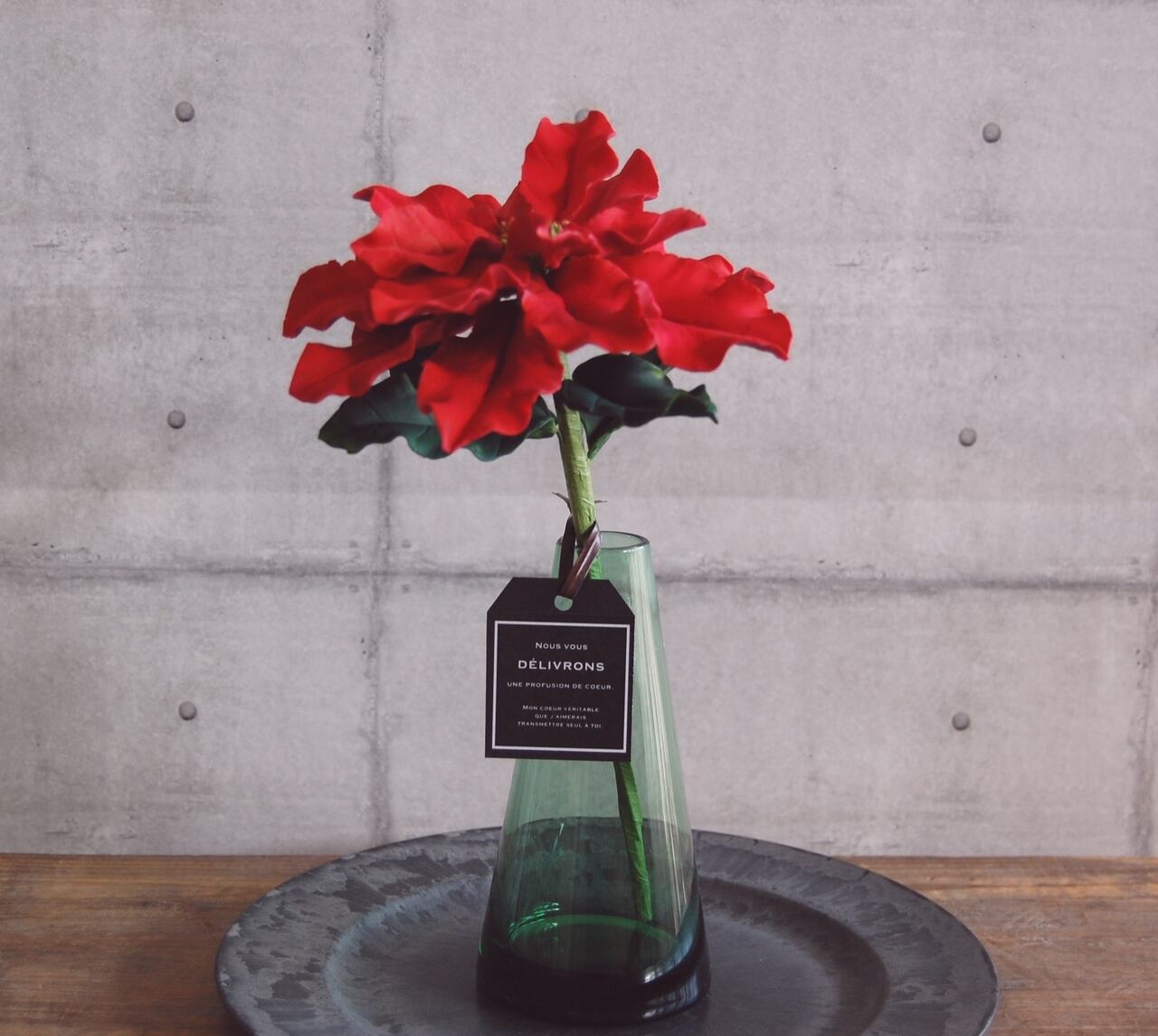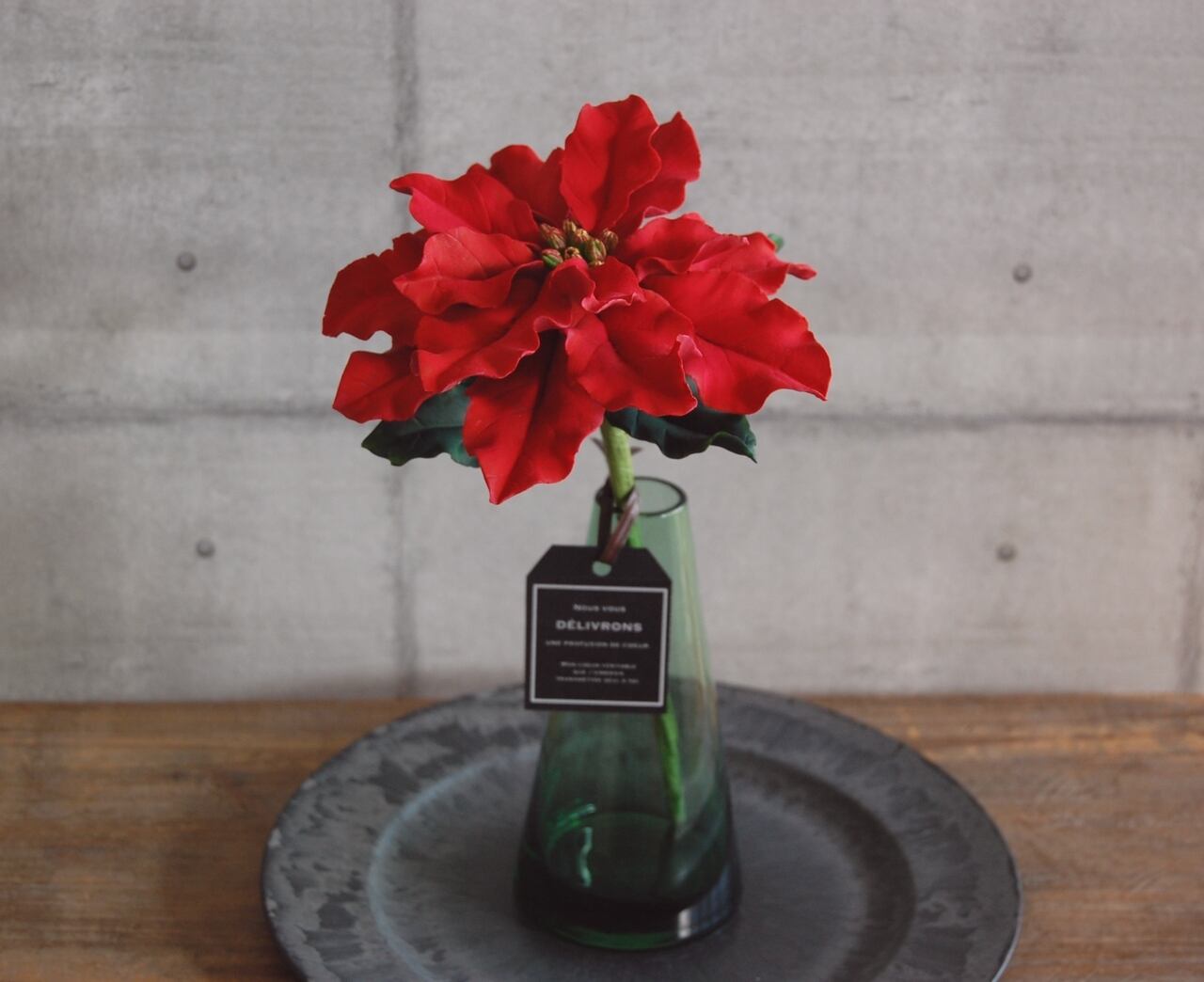 粘土でポインセチア作り、シンプルなグリーンボトルに一輪どーんと飾りました。