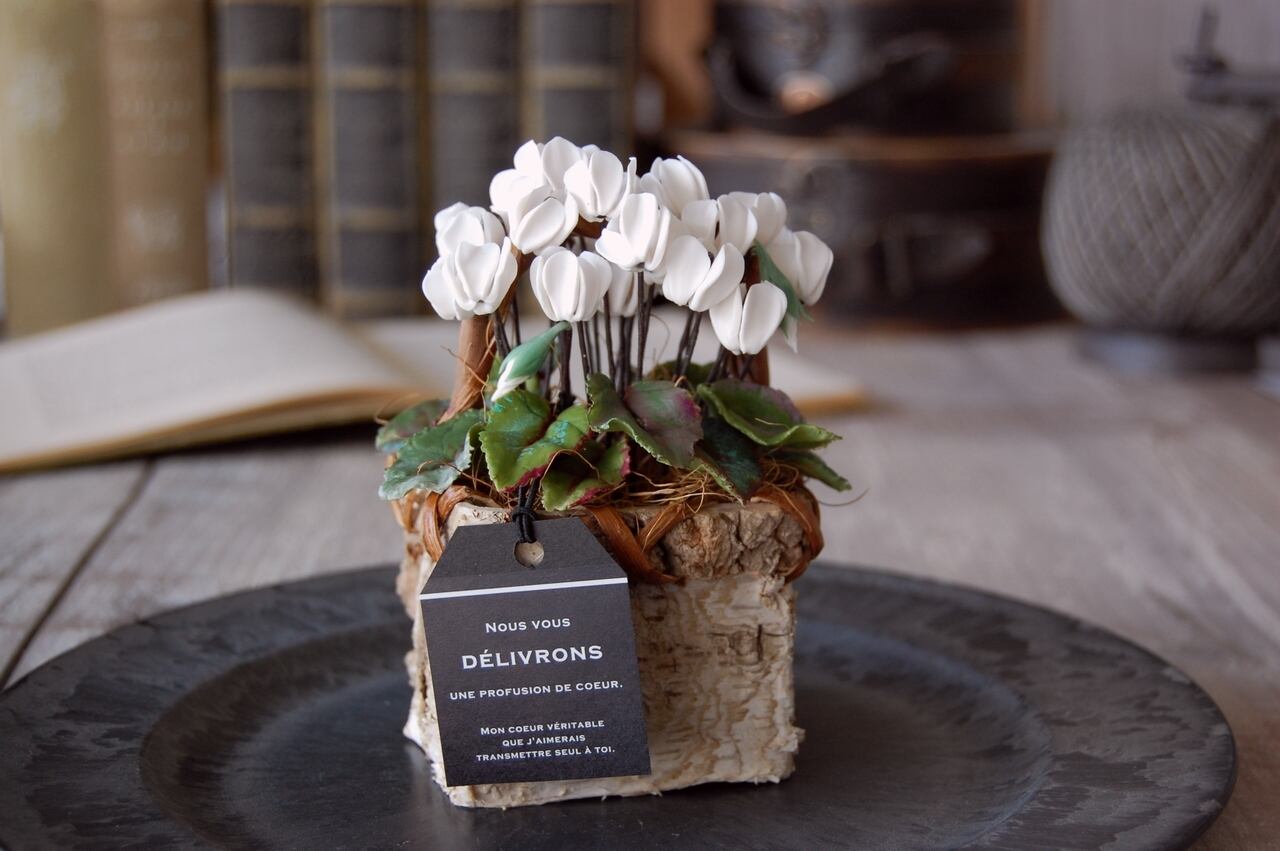 ◆粘土のお花◆ 小さなシクラメン ホワイト 白樺バスケット… S603