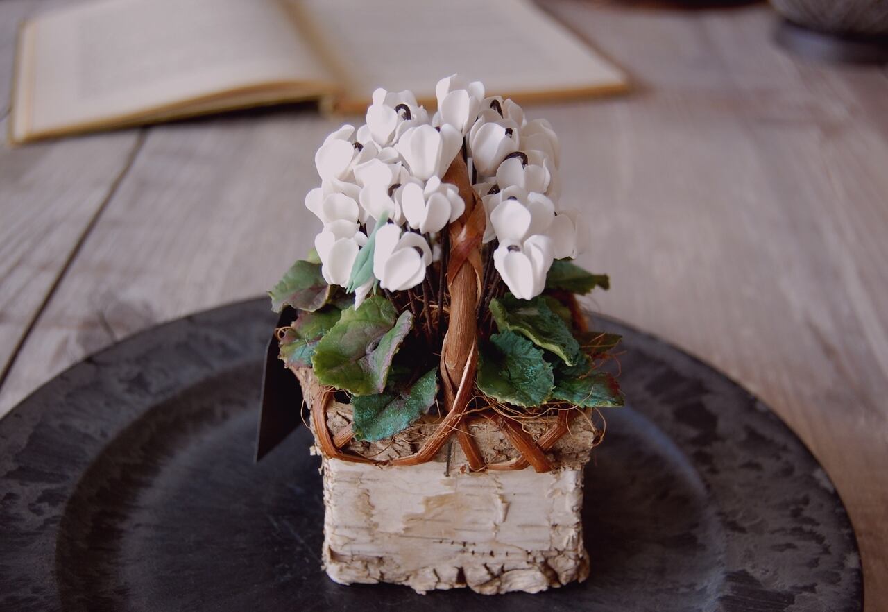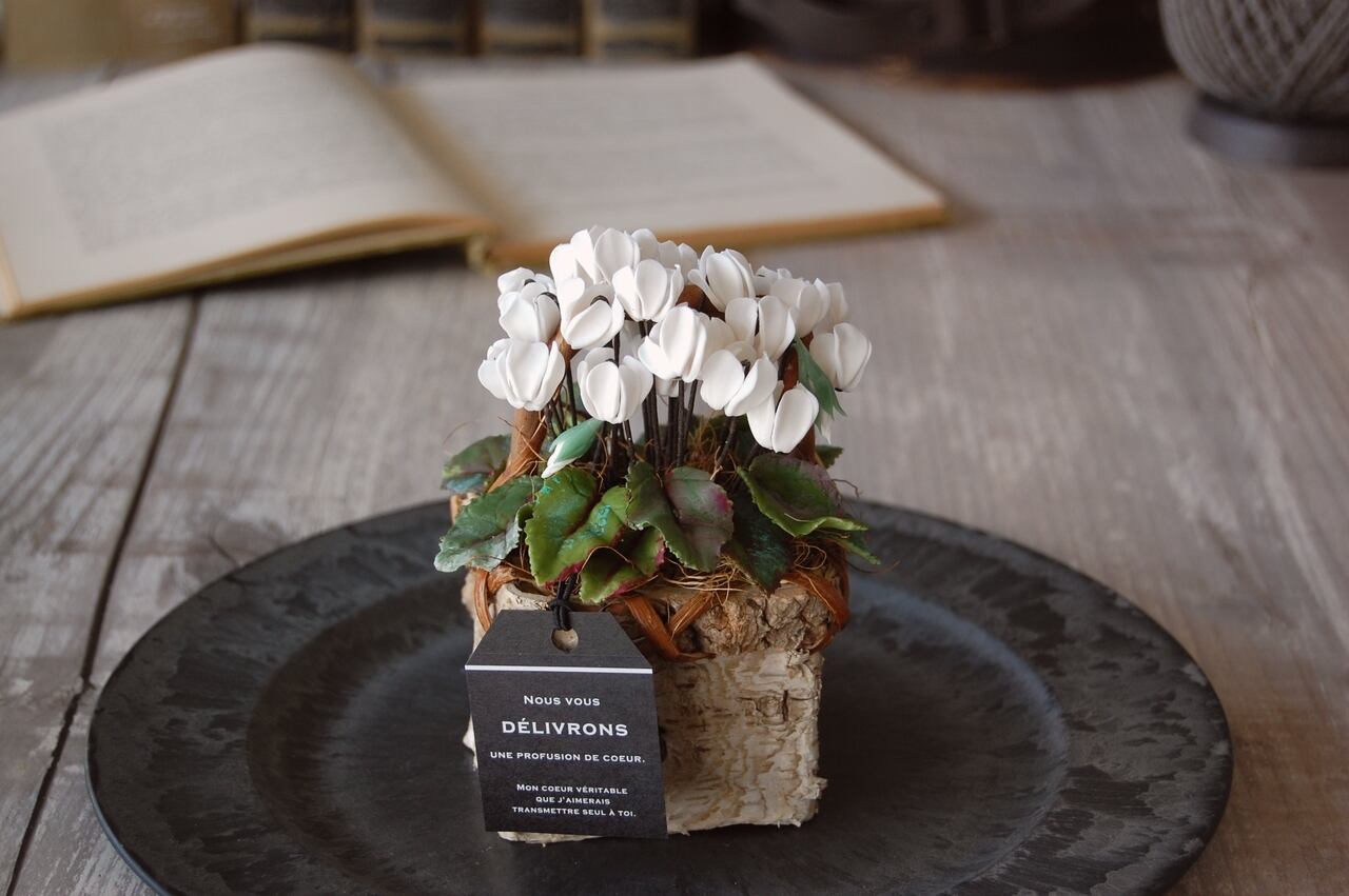 今回は白色シクラメンを天然の白樺で出来た小さなバスケット(籠)に植え込みました。