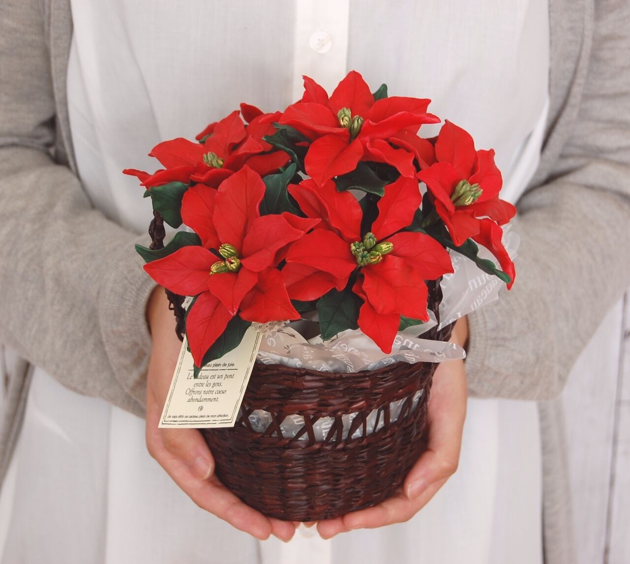 粘土でポインセチア作り、ブラウンのおしゃれな籠バックにたっぷりと飾りました。