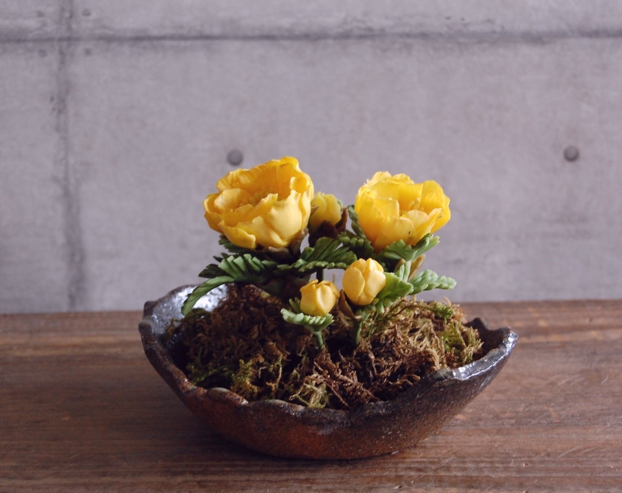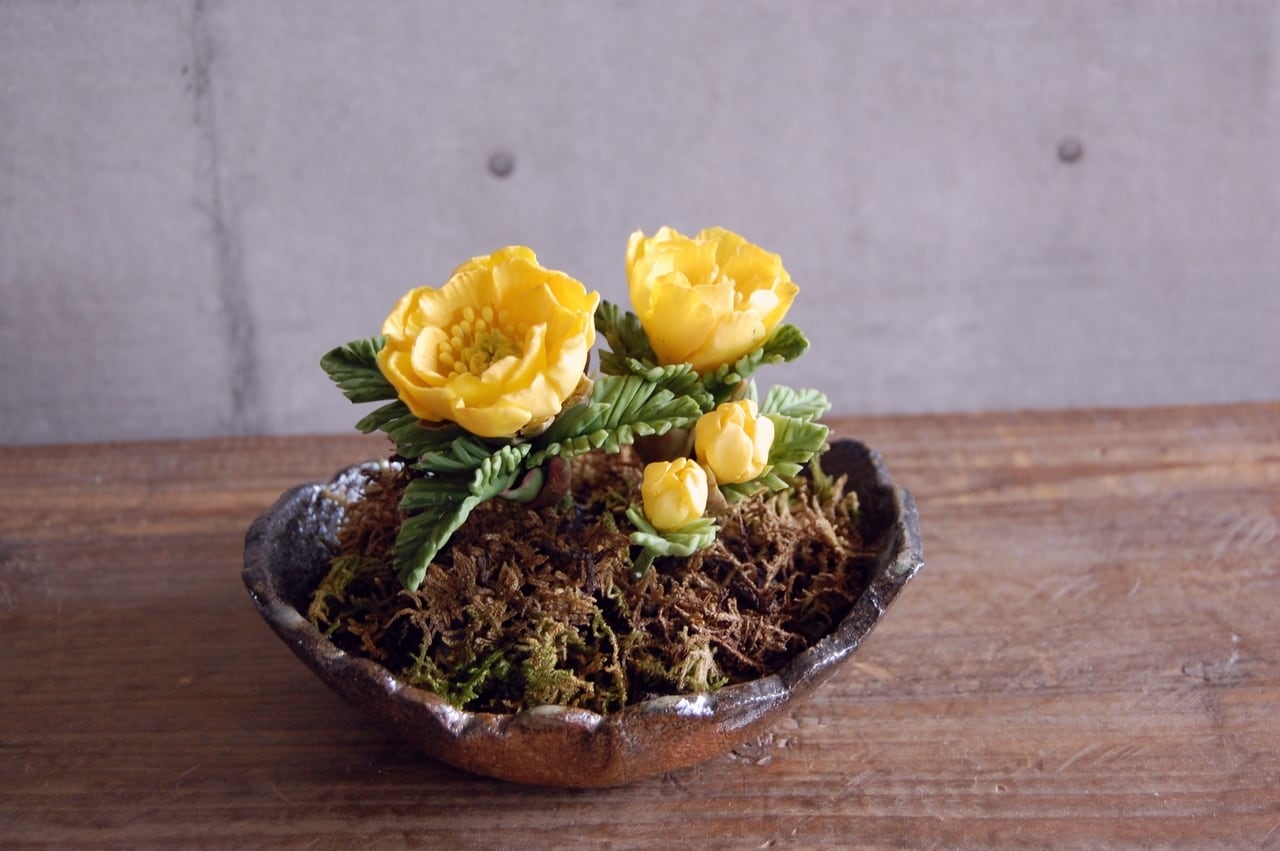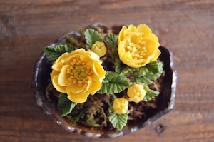 粘土で福寿草を作り、植木鉢に植え込みました。