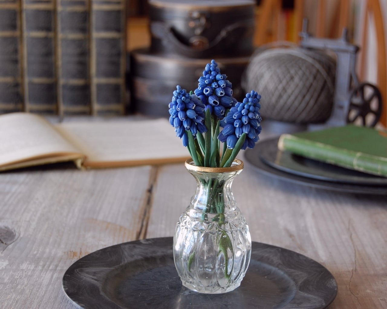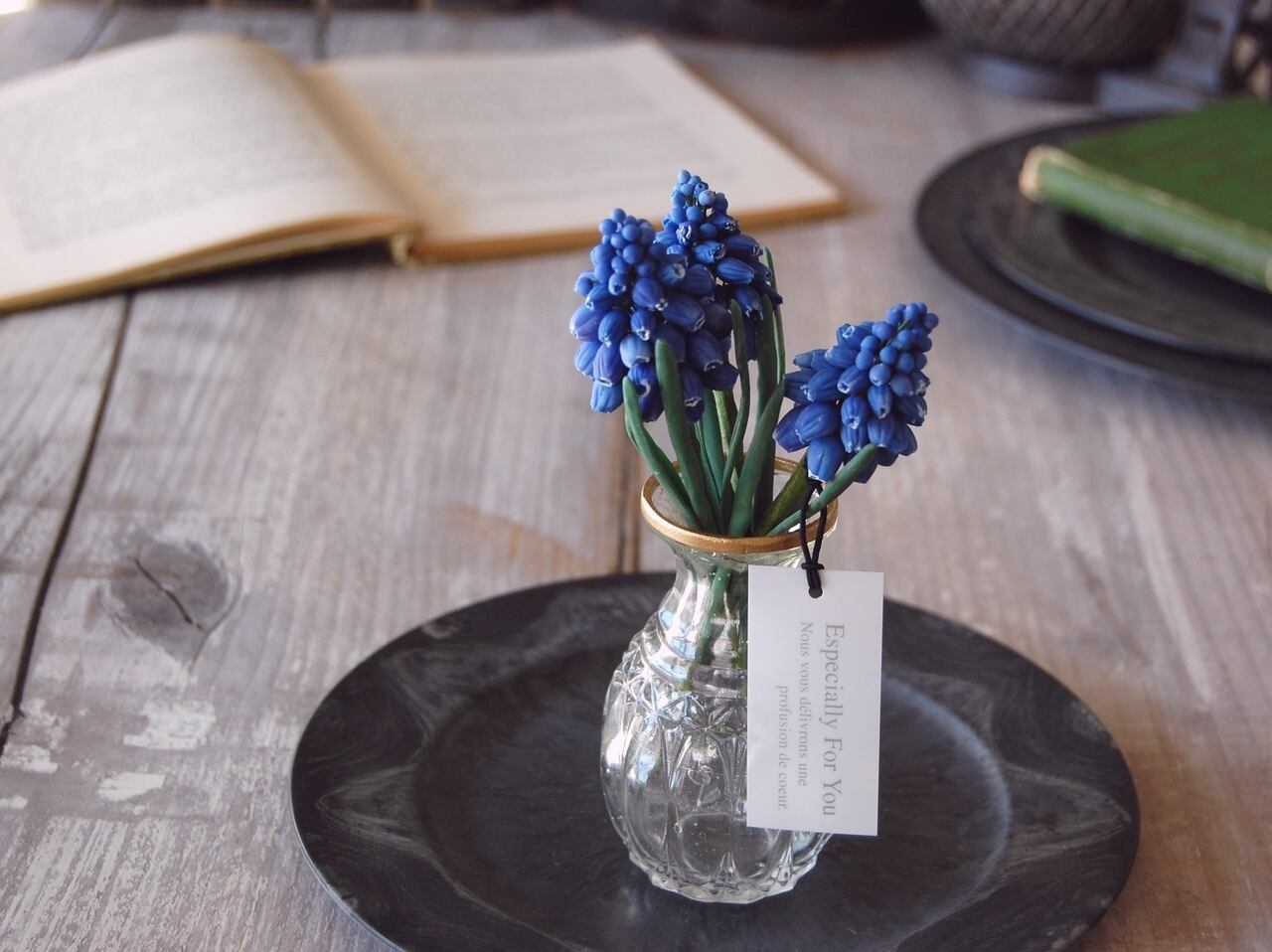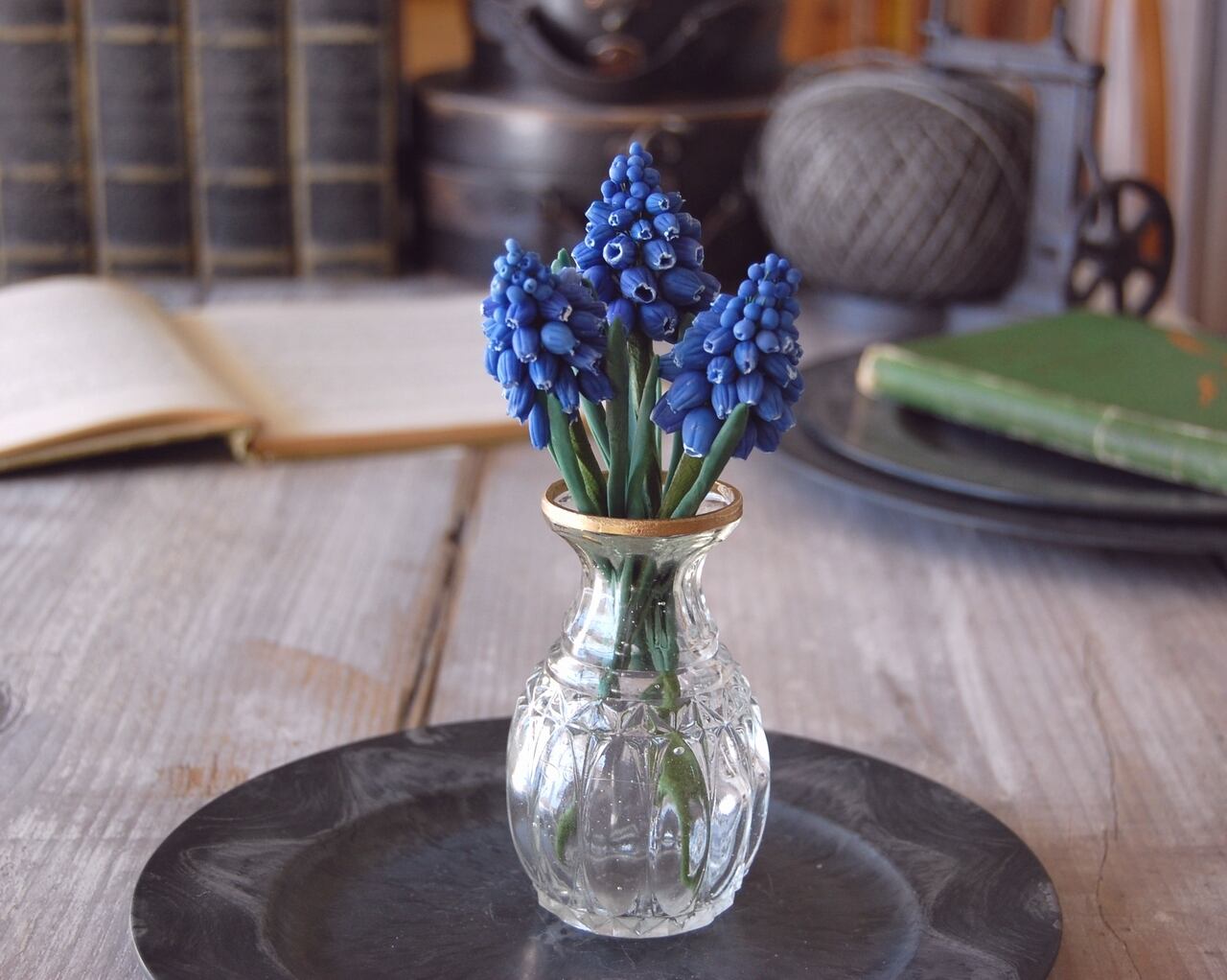そんなムスカリを粘土で制作し、おしやれなオルリム・シングルベースに飾りました。