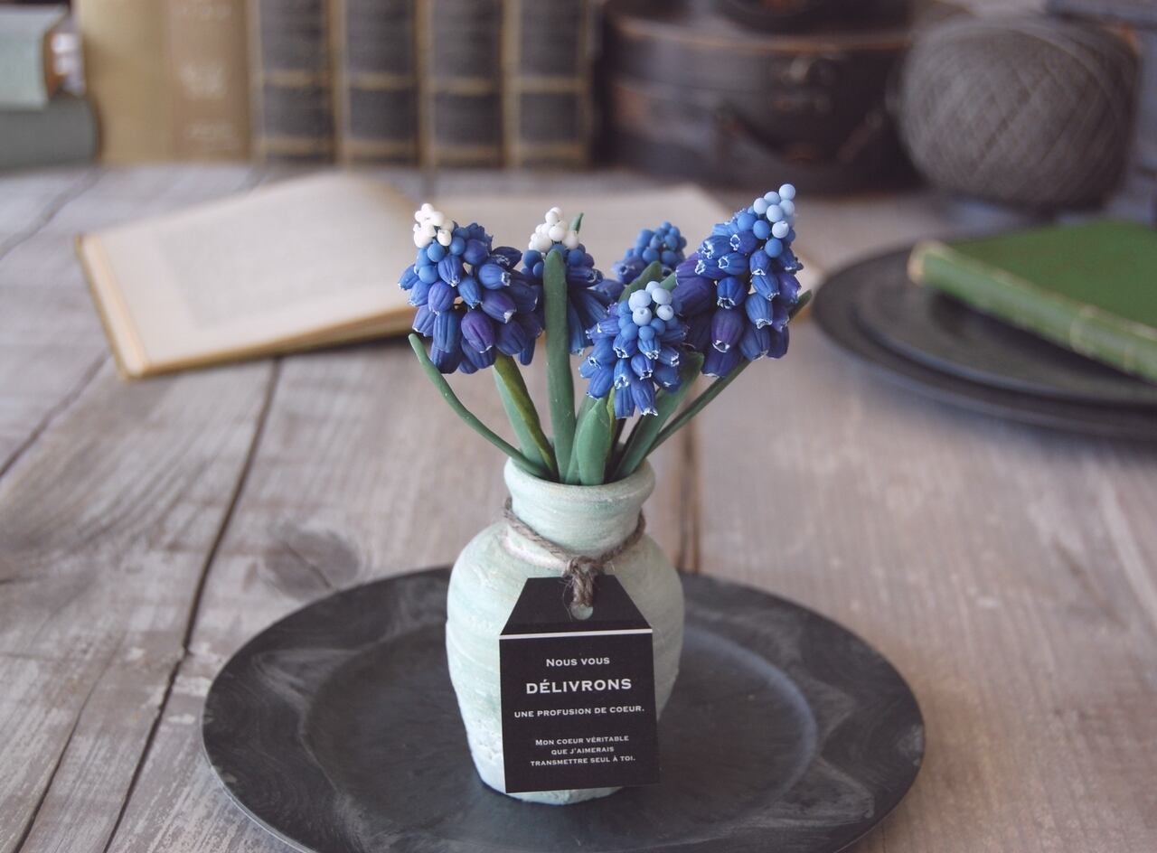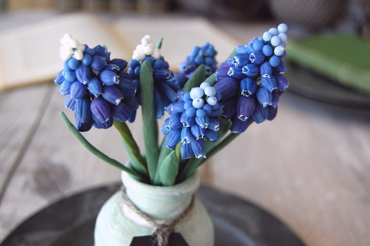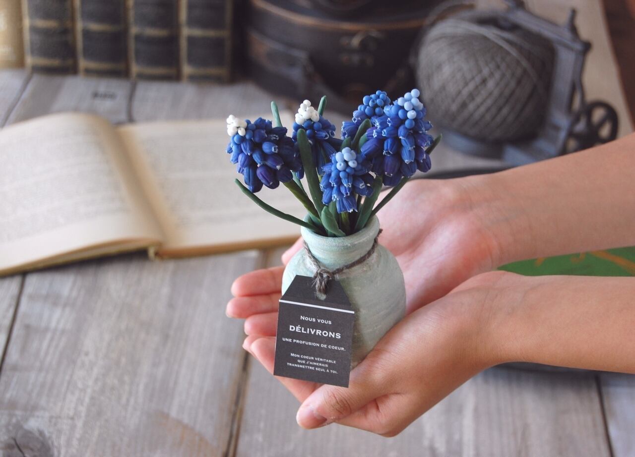 そんなムスカリを粘土で制作し、小さな壷に飾りました。