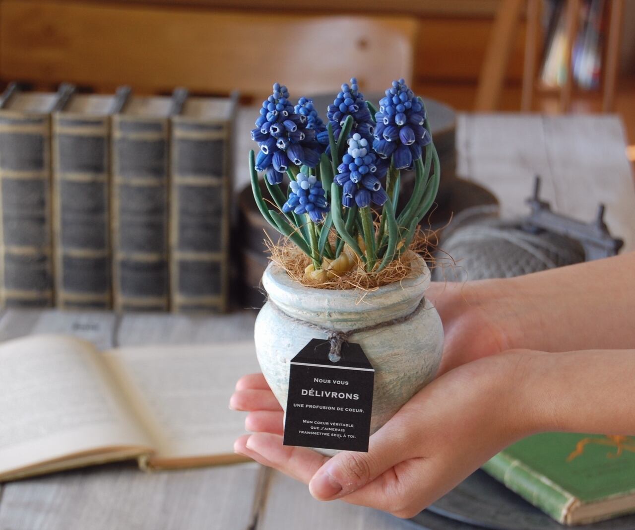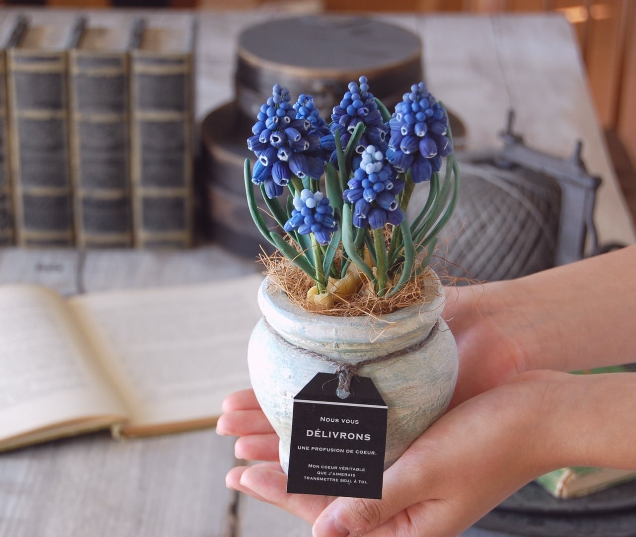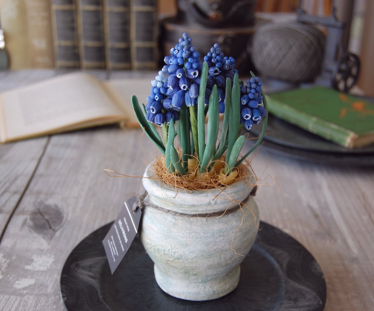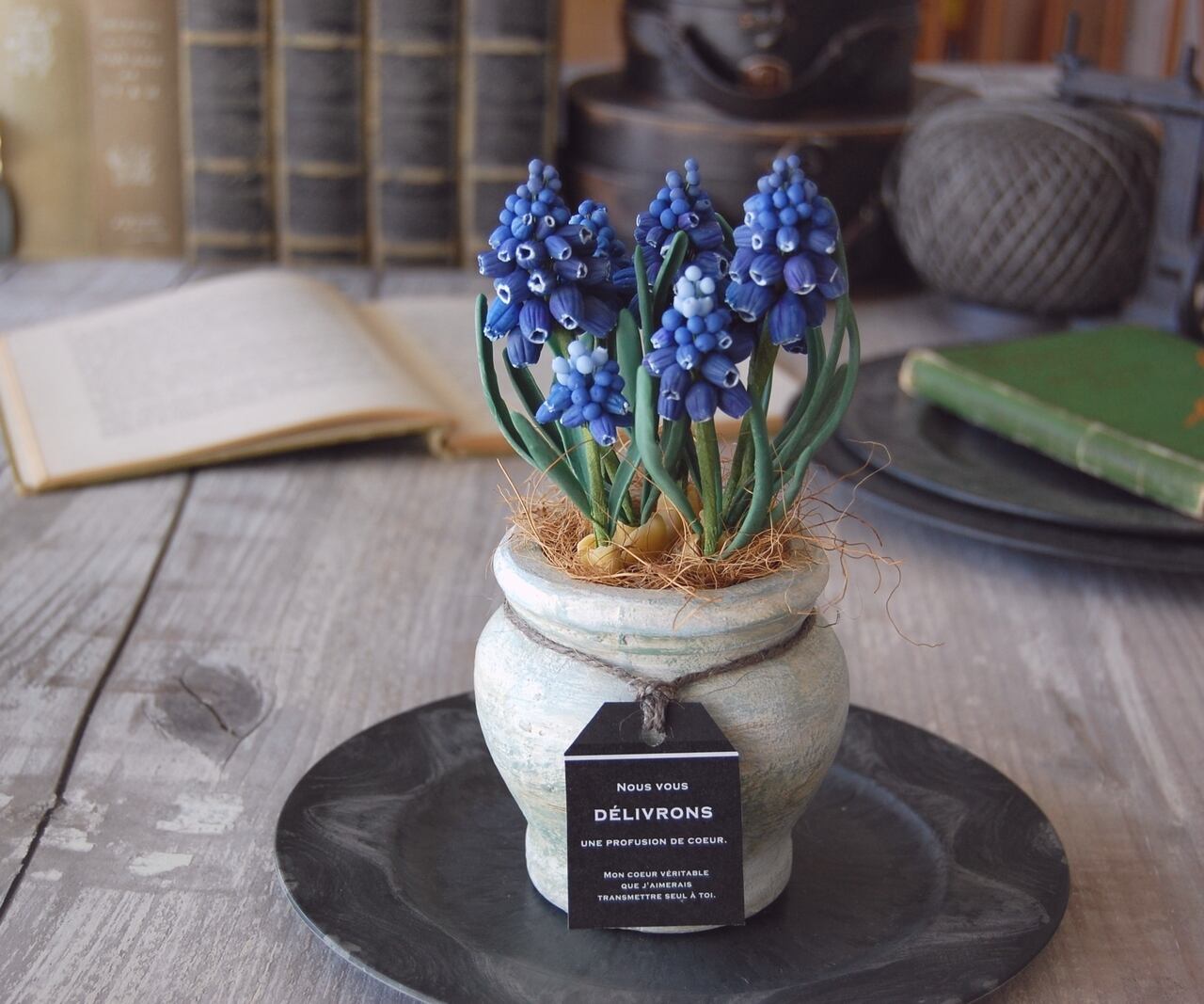そんなムスカリを粘土で制作し、壷型の植木鉢に植え込みました。