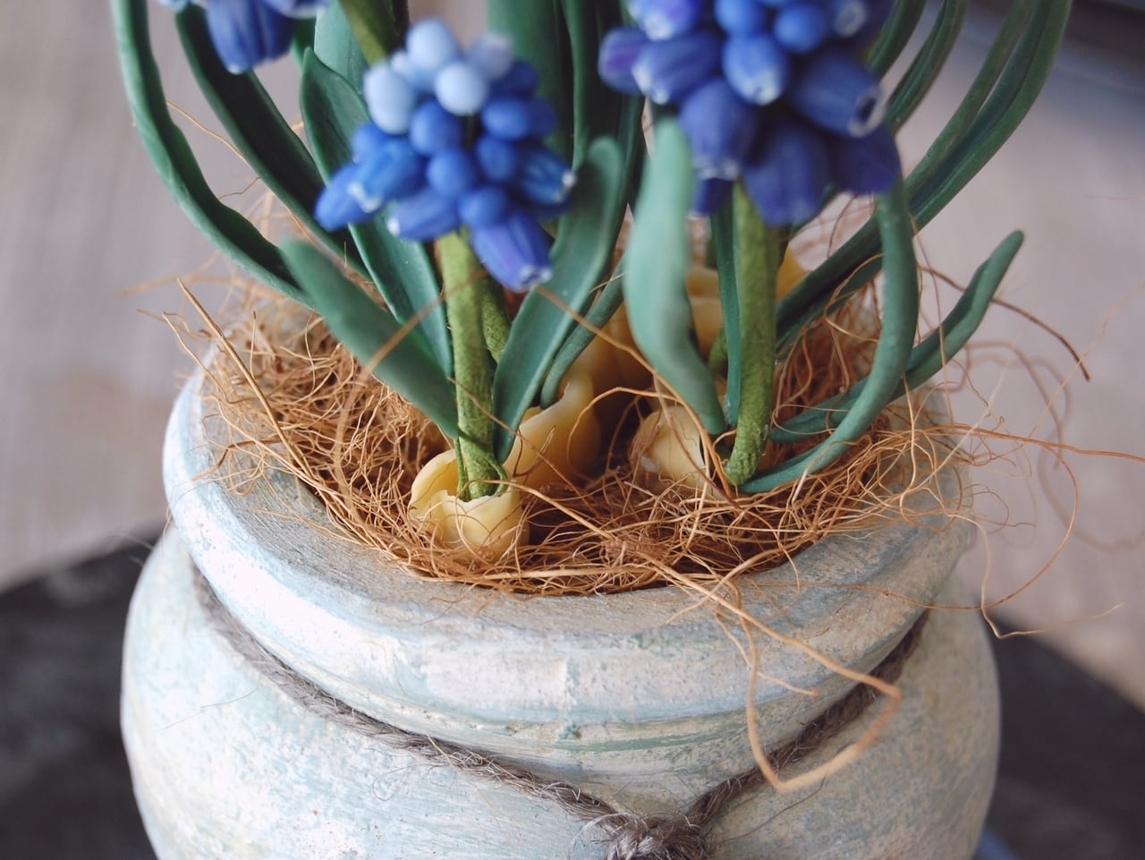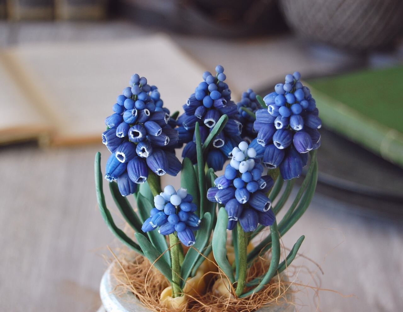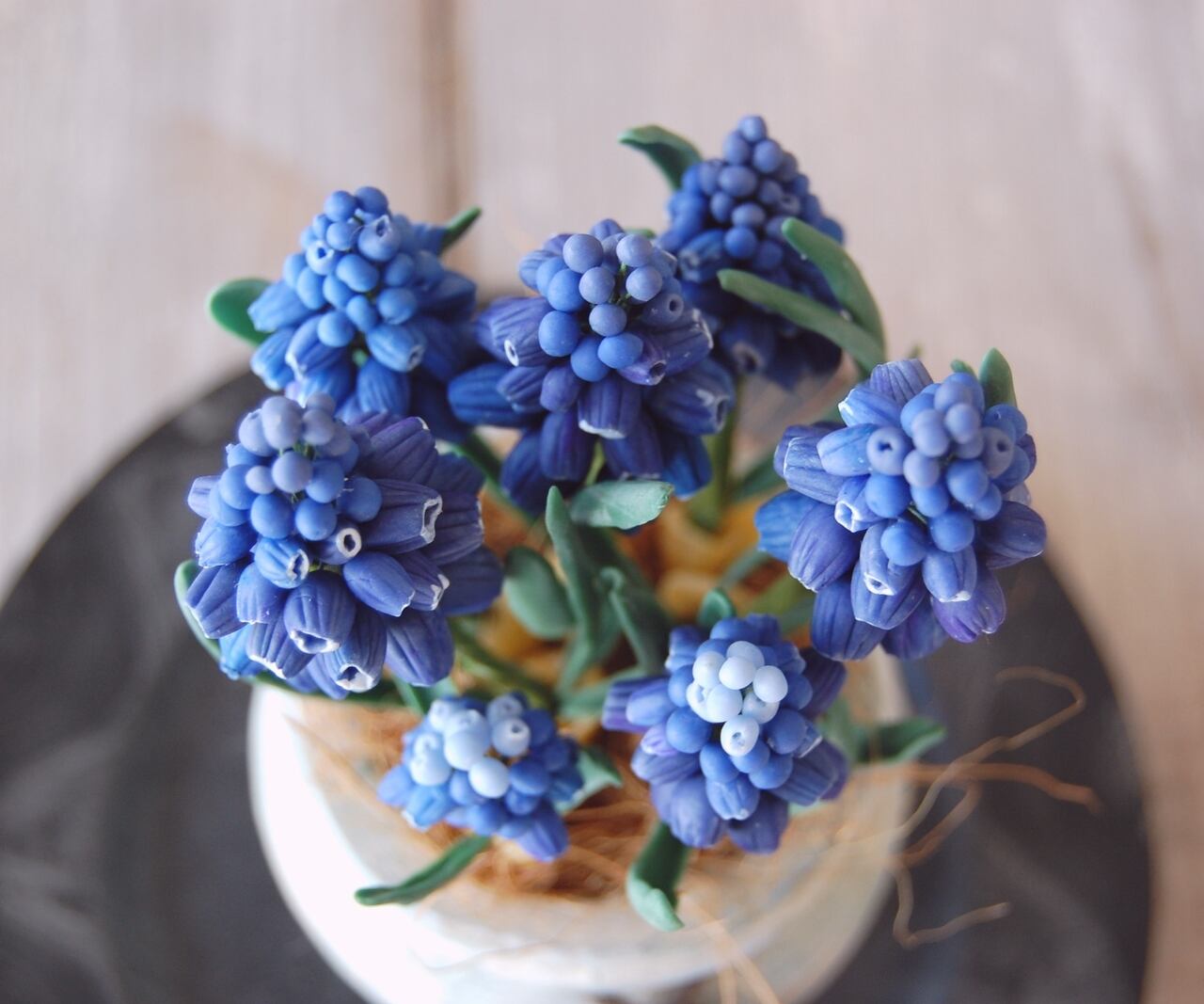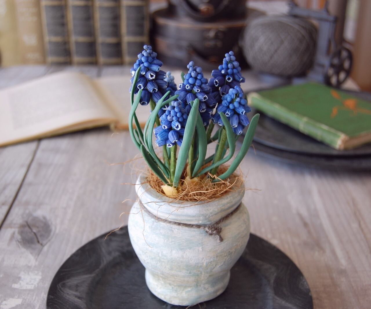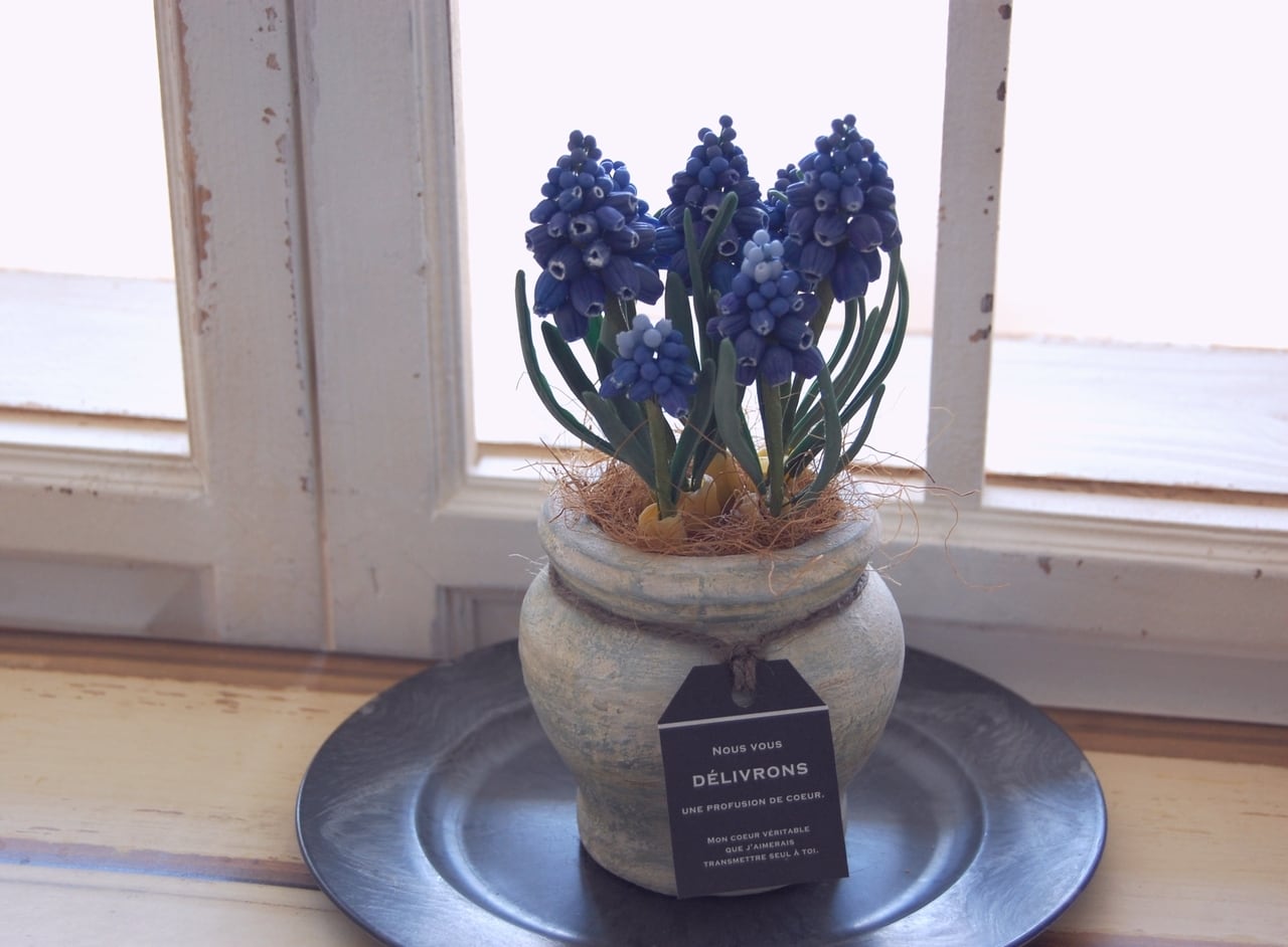 そんなムスカリを粘土で制作し、壷型の植木鉢に植え込みました。