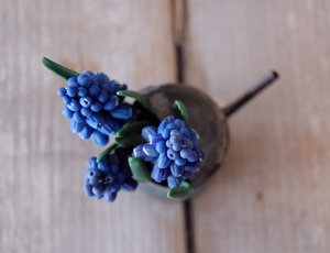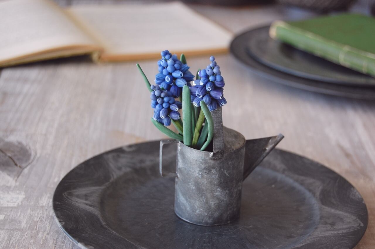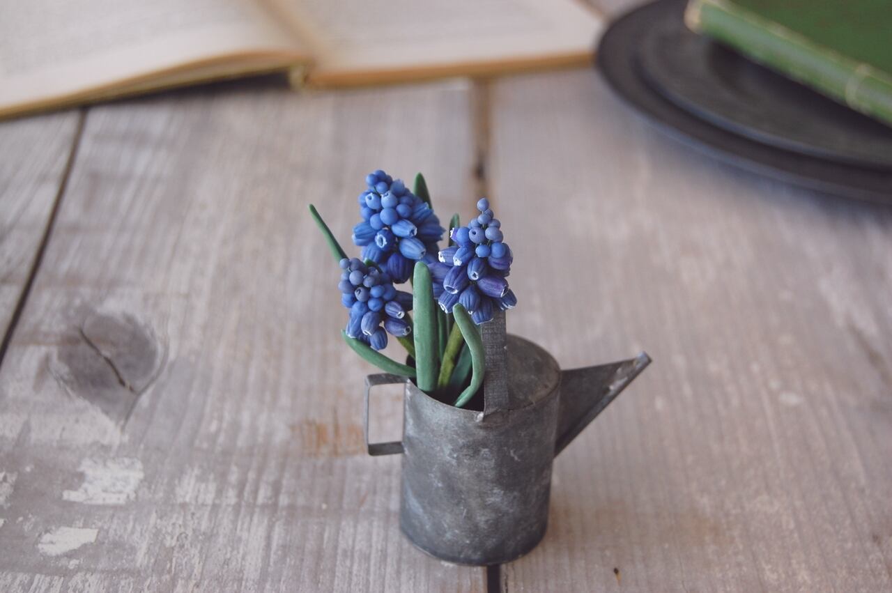 そんなムスカリを粘土で制作し、アンティーク調のミニじょうろにアレンジしました。