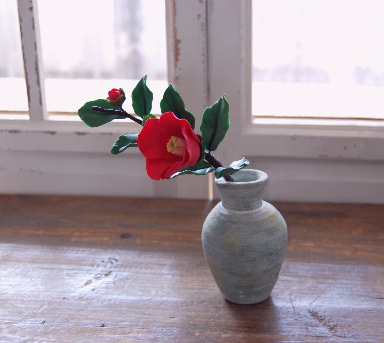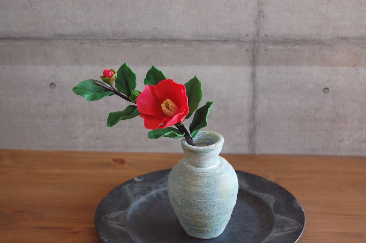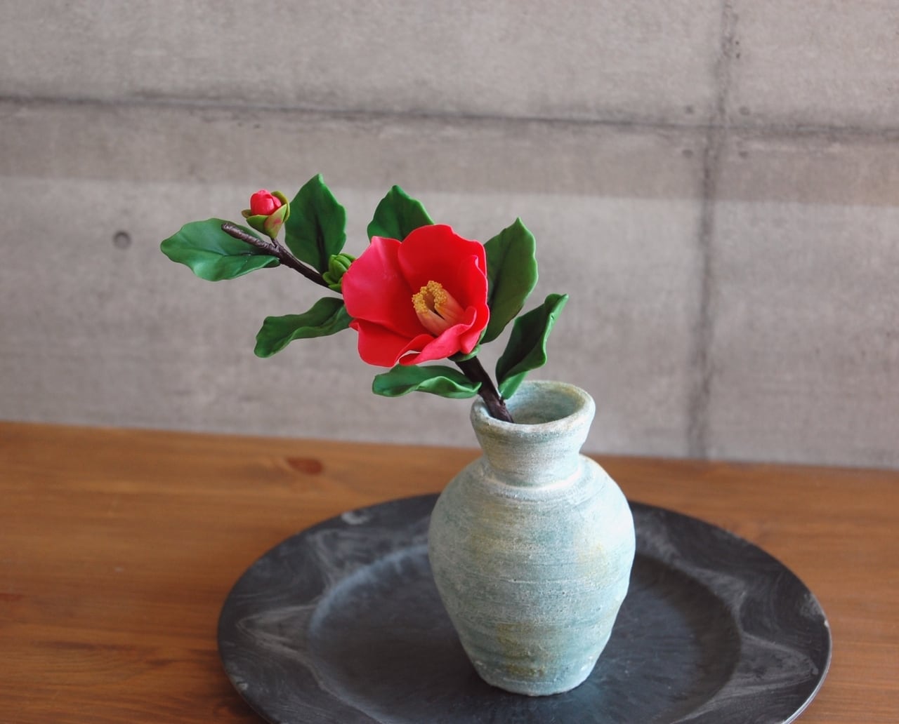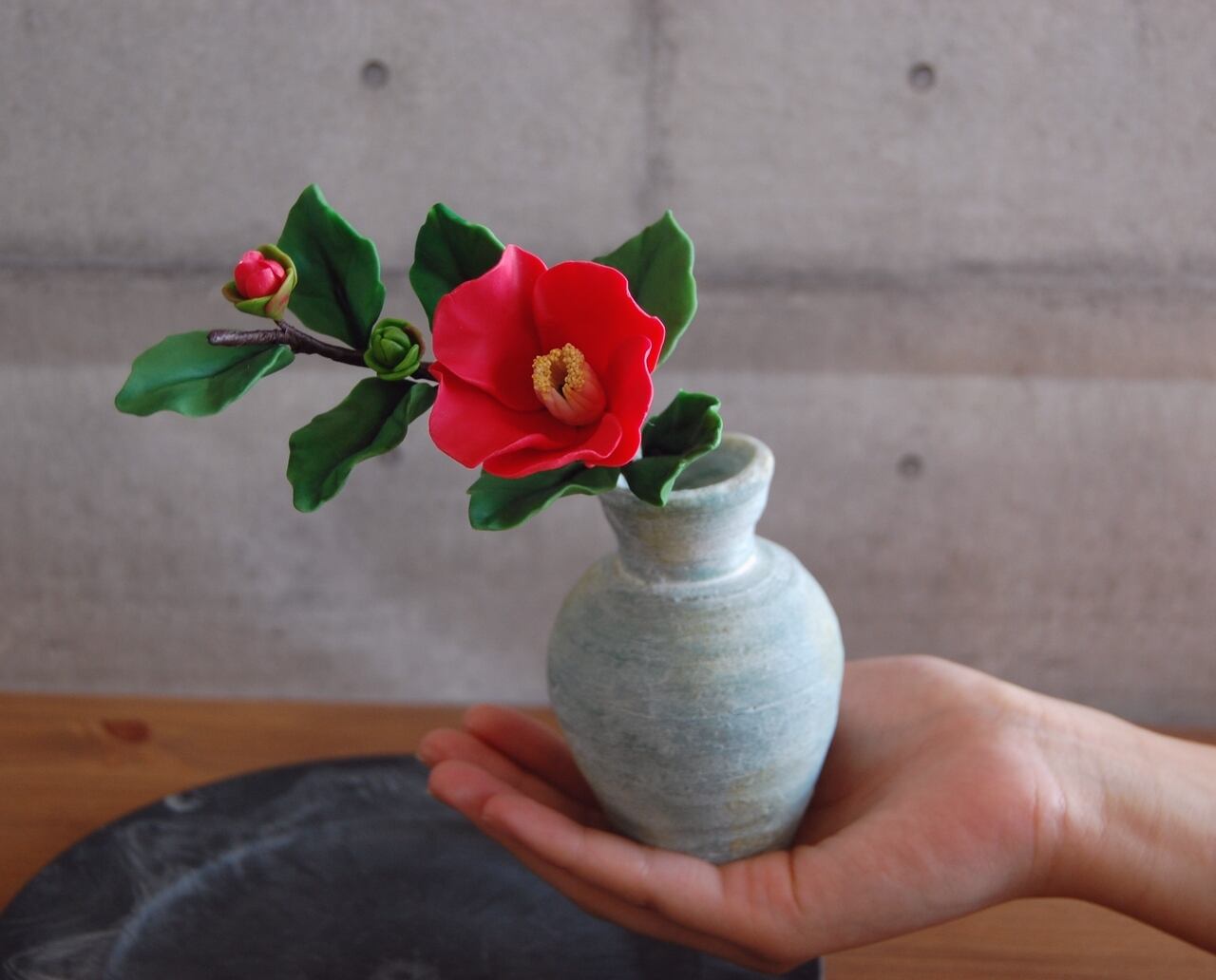 そんな椿を粘土で制作し、一輪挿しとして手のひらサイズの壺に生けました。