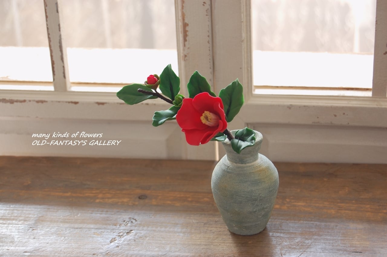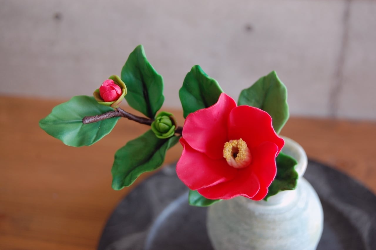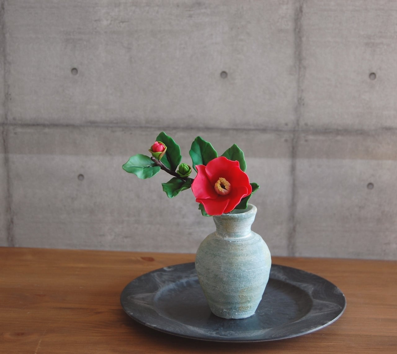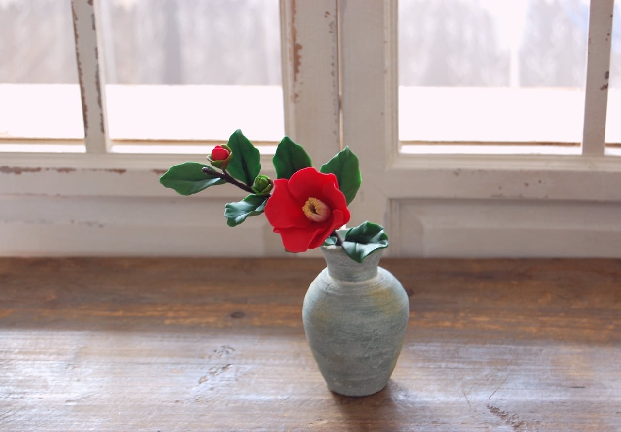 そんな椿を粘土で制作し、一輪挿しとして手のひらサイズの壺に生けました。