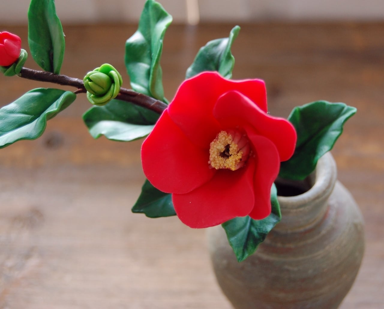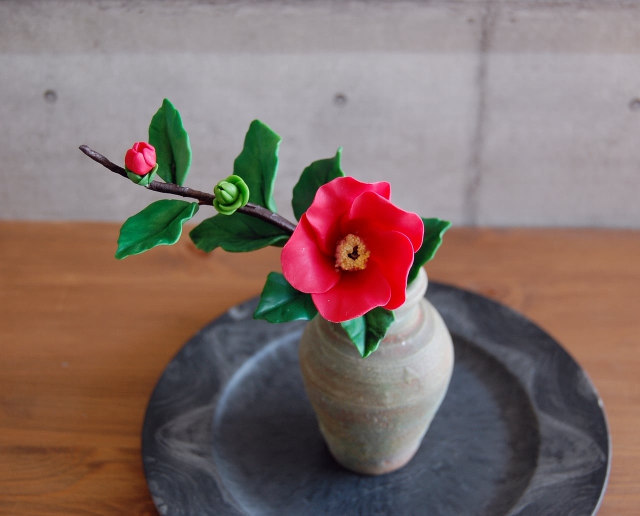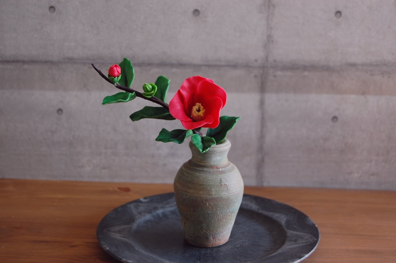 そんな椿を粘土で制作し、一輪挿しとして手のひらサイズの壺に生けました。