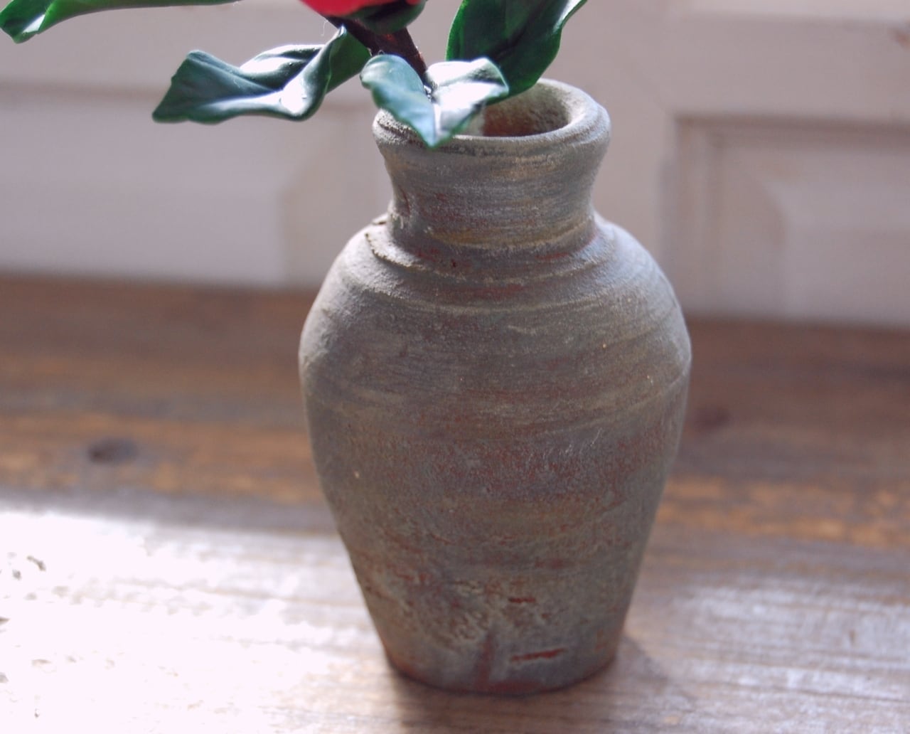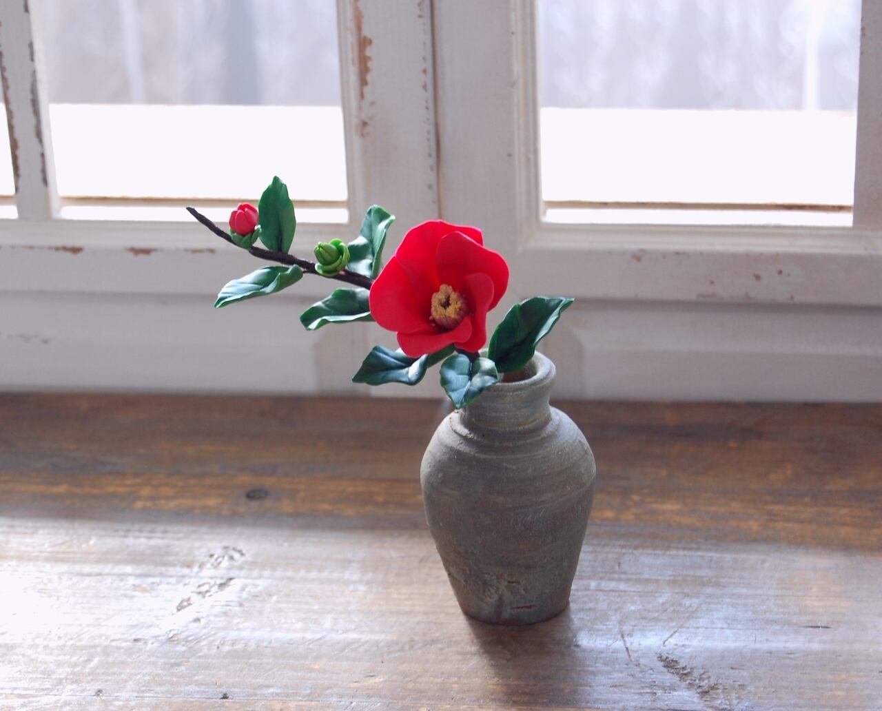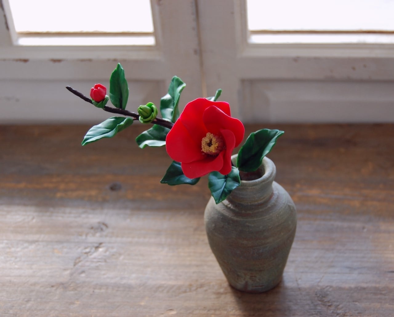 そんな椿を粘土で制作し、一輪挿しとして手のひらサイズの壺に生けました。