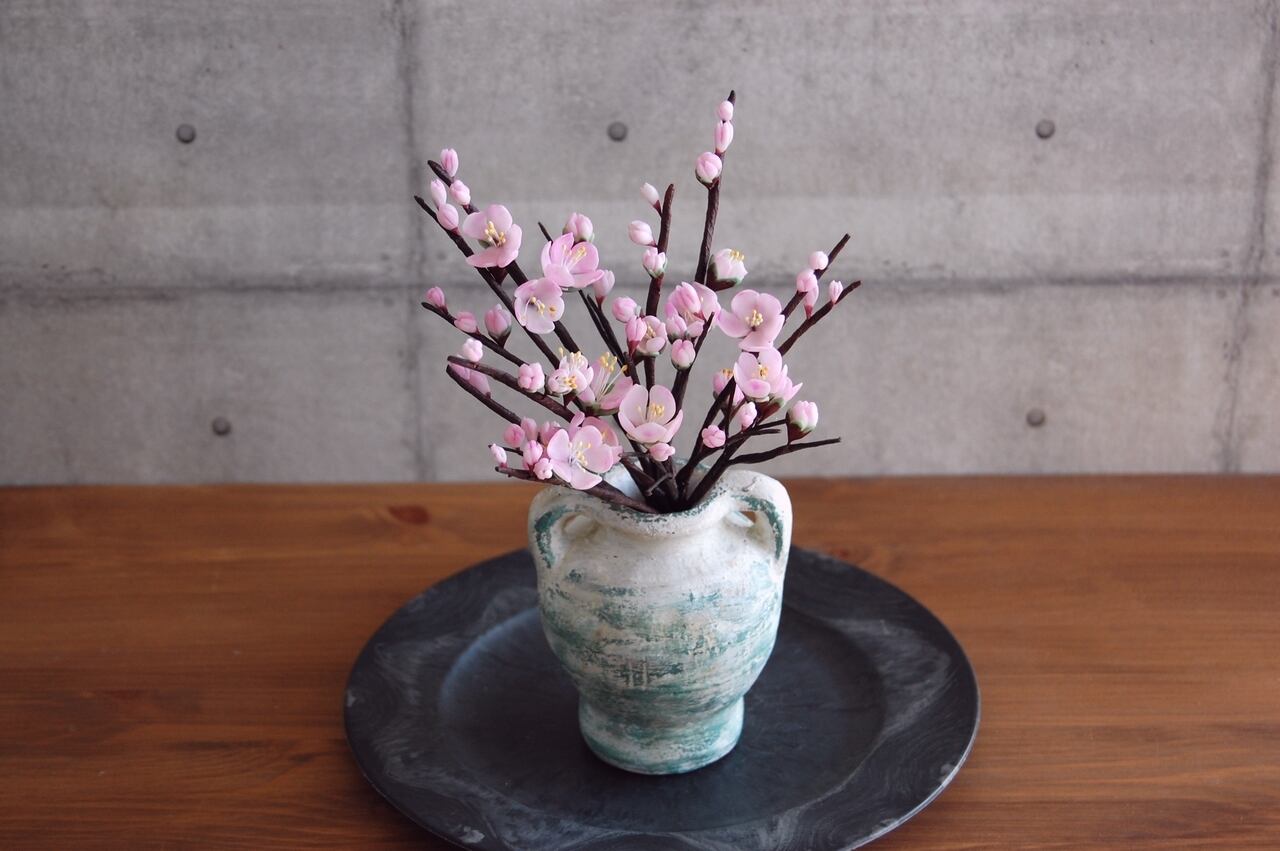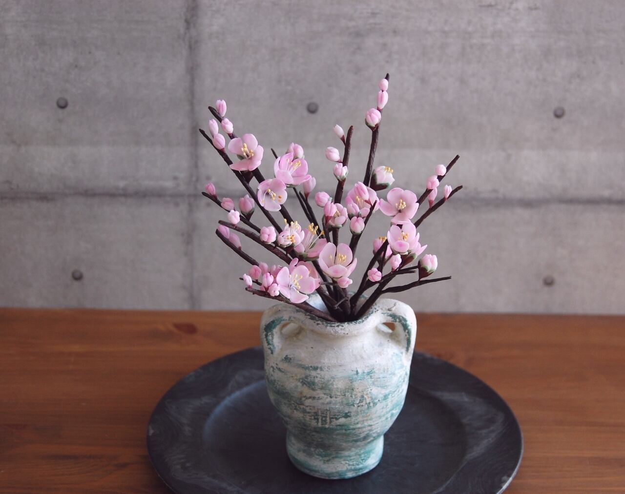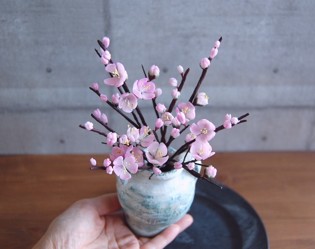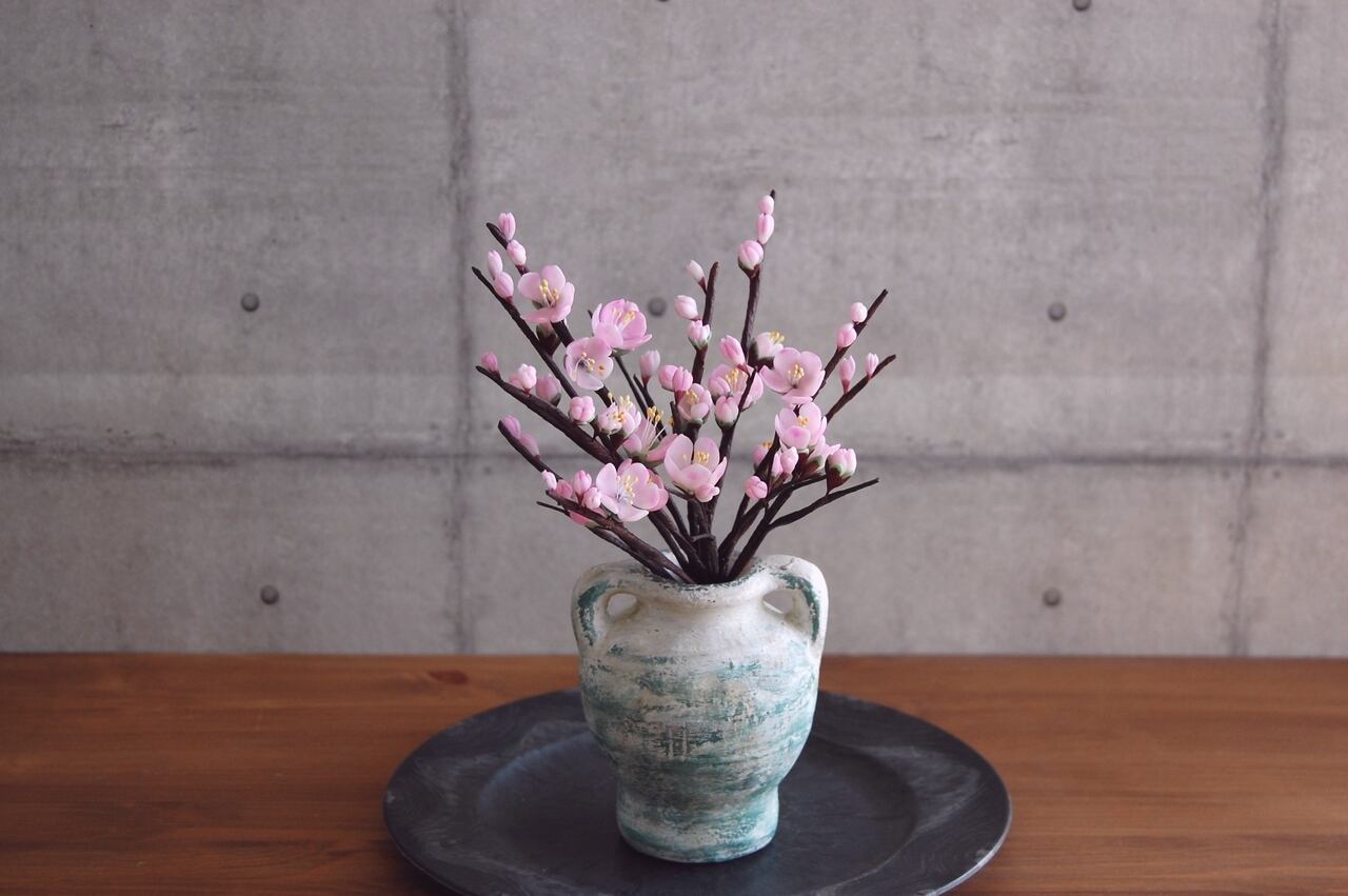 そんな梅を粘土で制作し、手のひらサイズの壺に生けました。