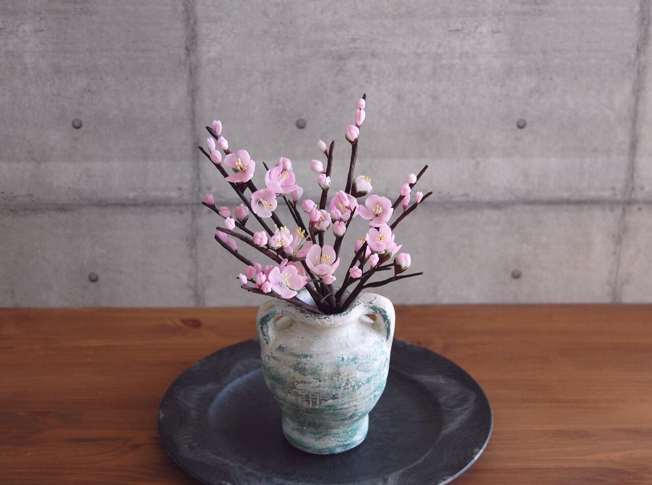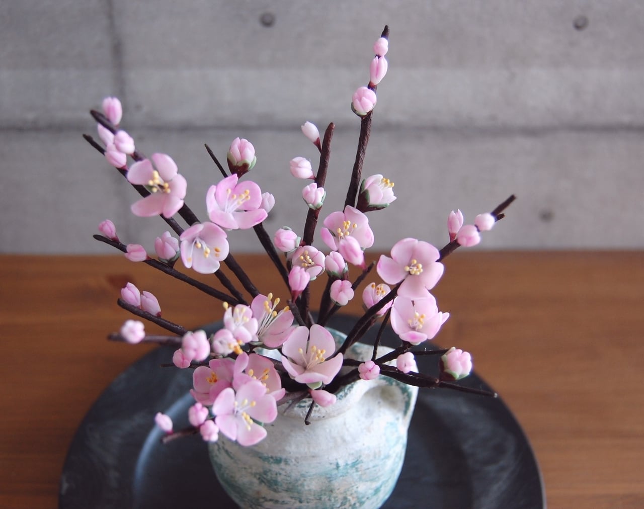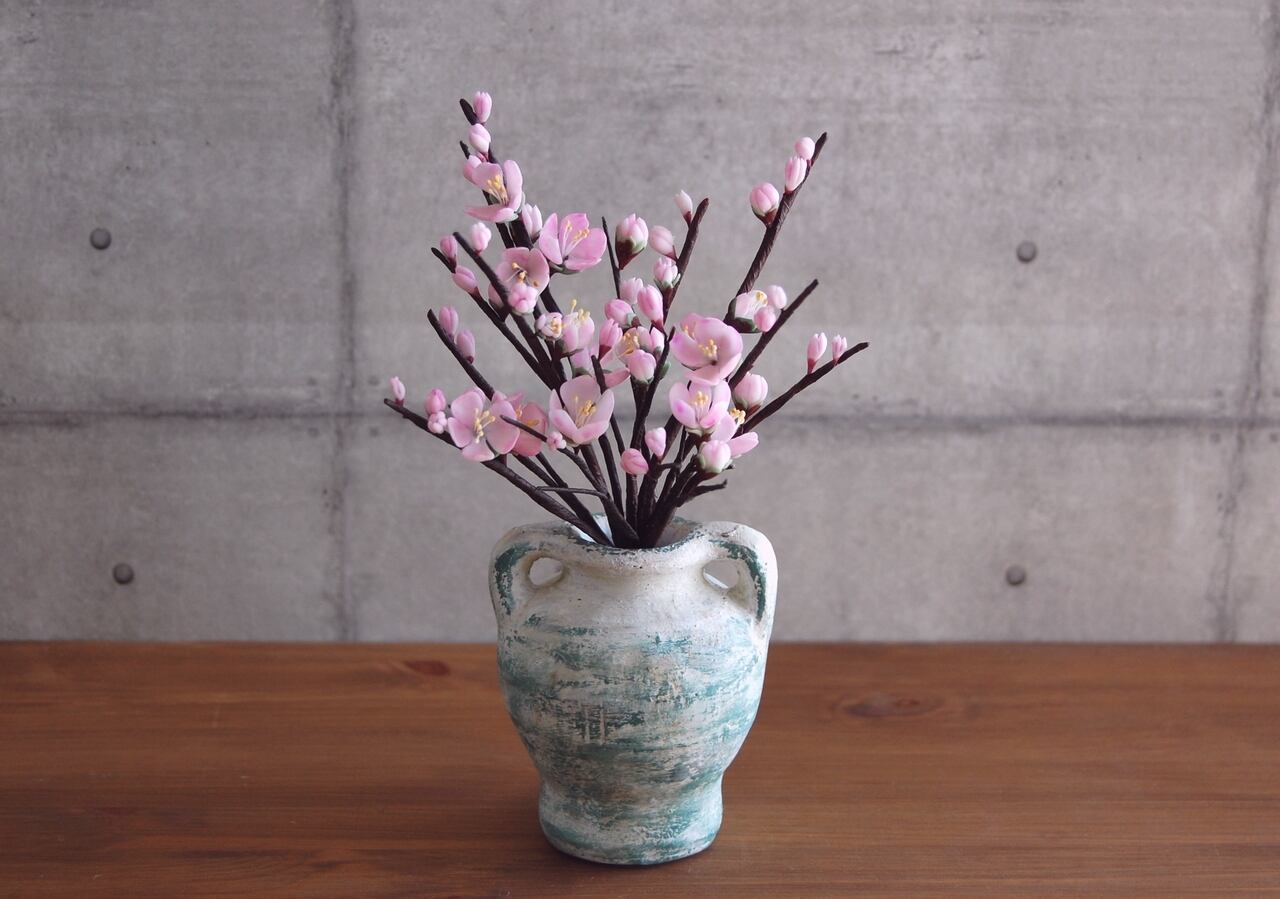 そんな梅を粘土で制作し、手のひらサイズの壺に生けました。