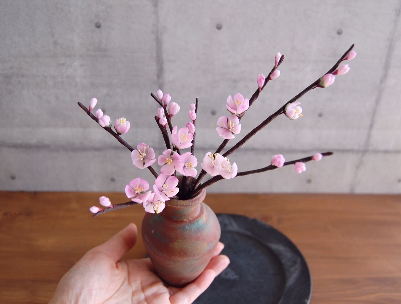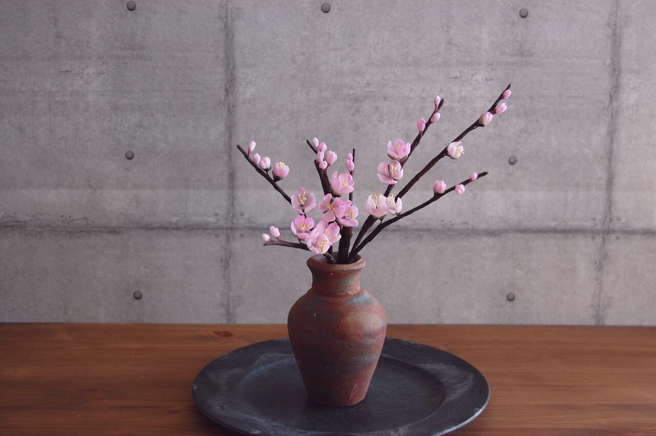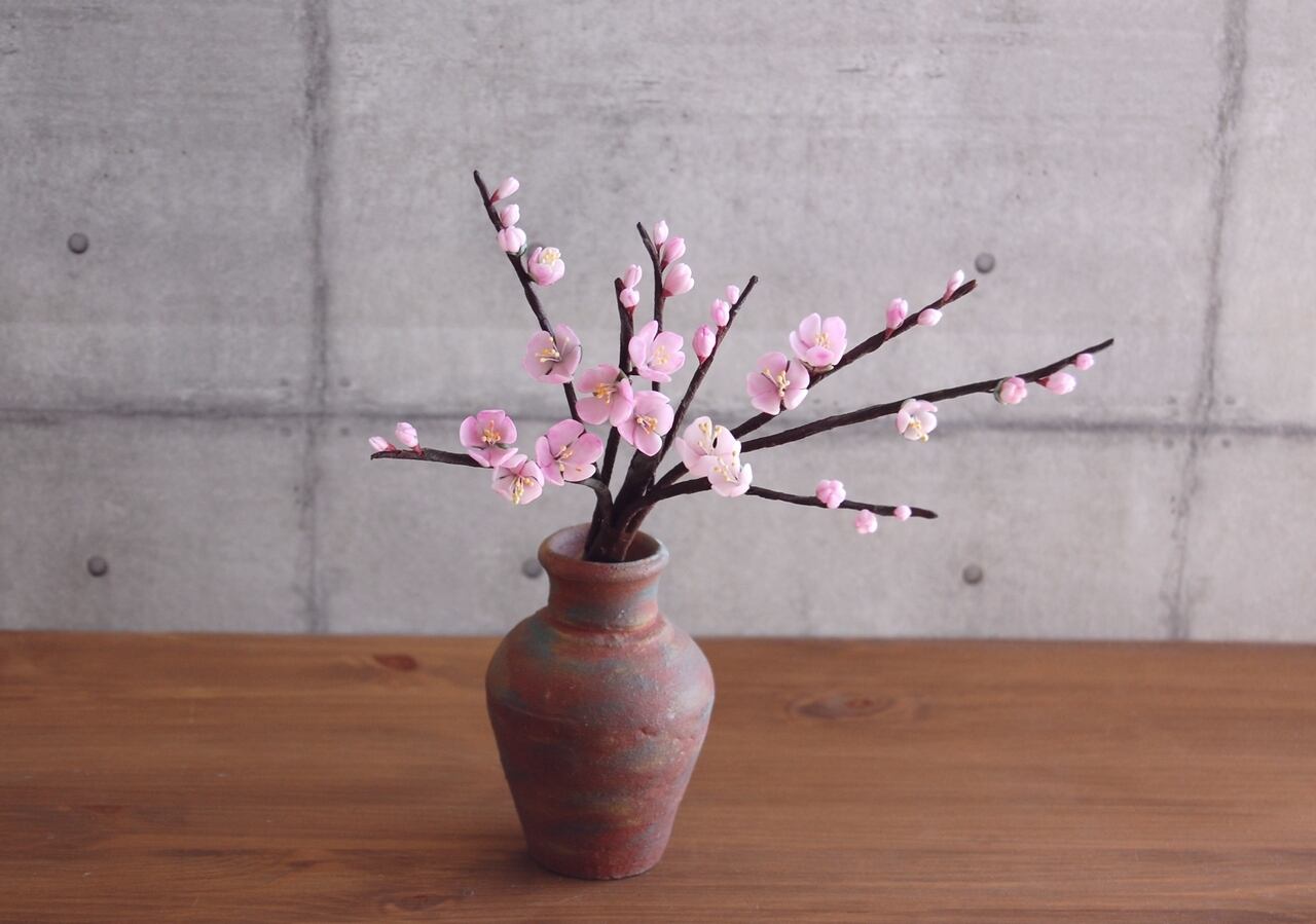 そんな梅を粘土で制作し、手のひらサイズの壺に生けました。