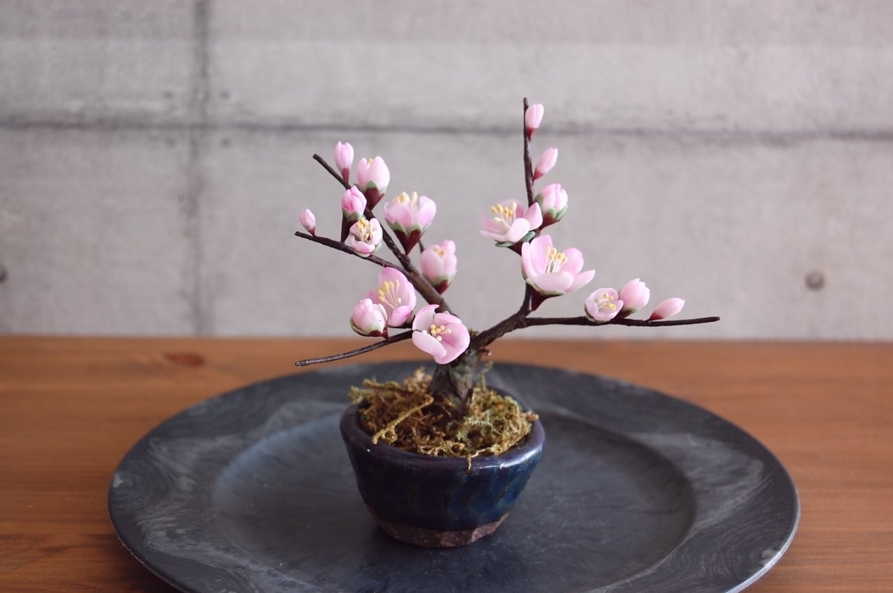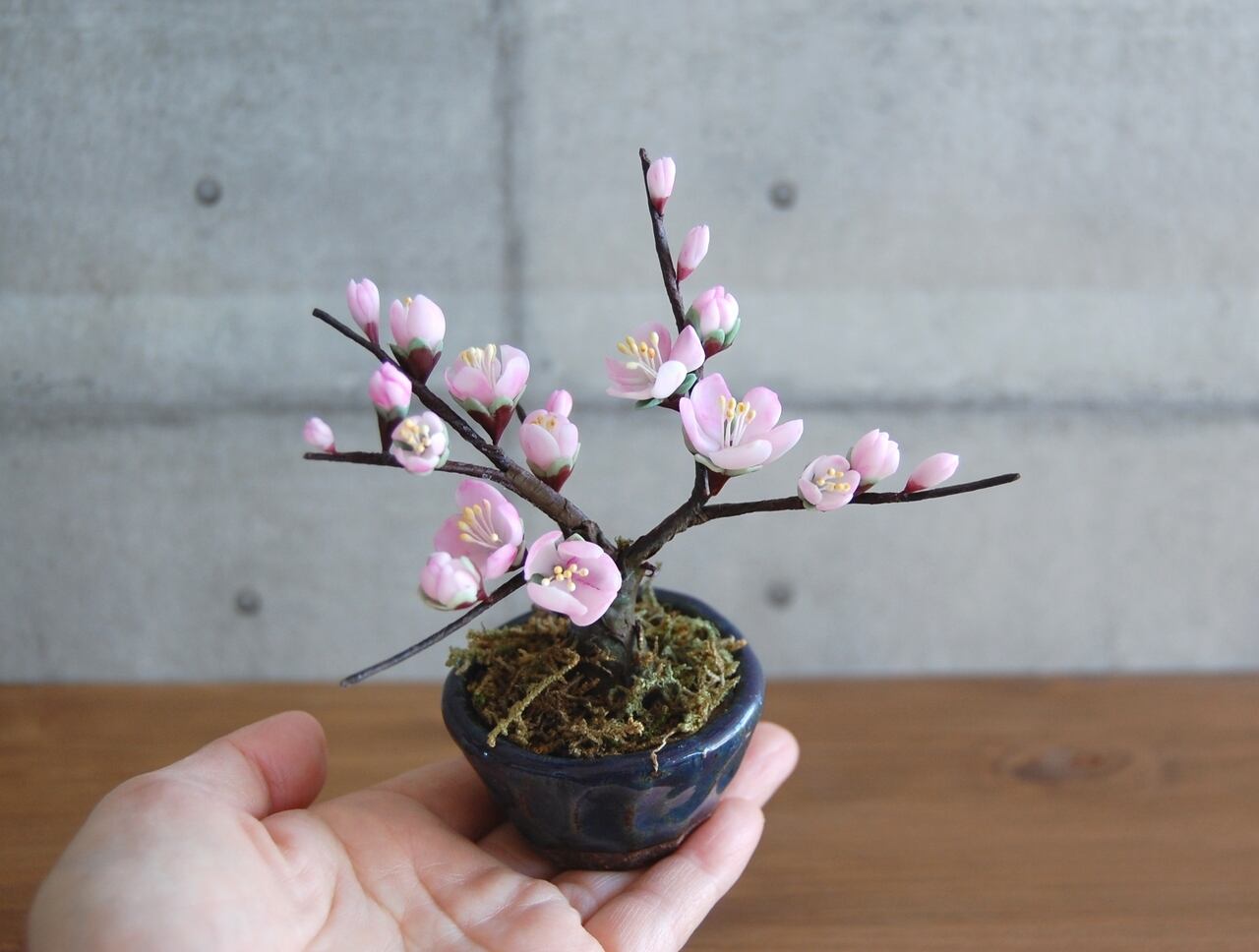 そんな梅を粘土で制作し、梅盆栽に仕上げました。
