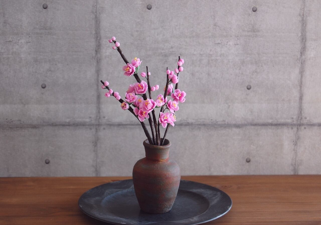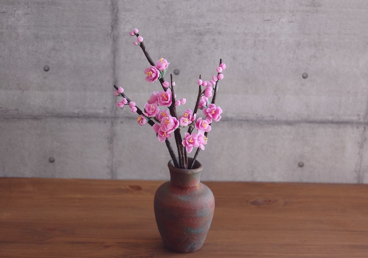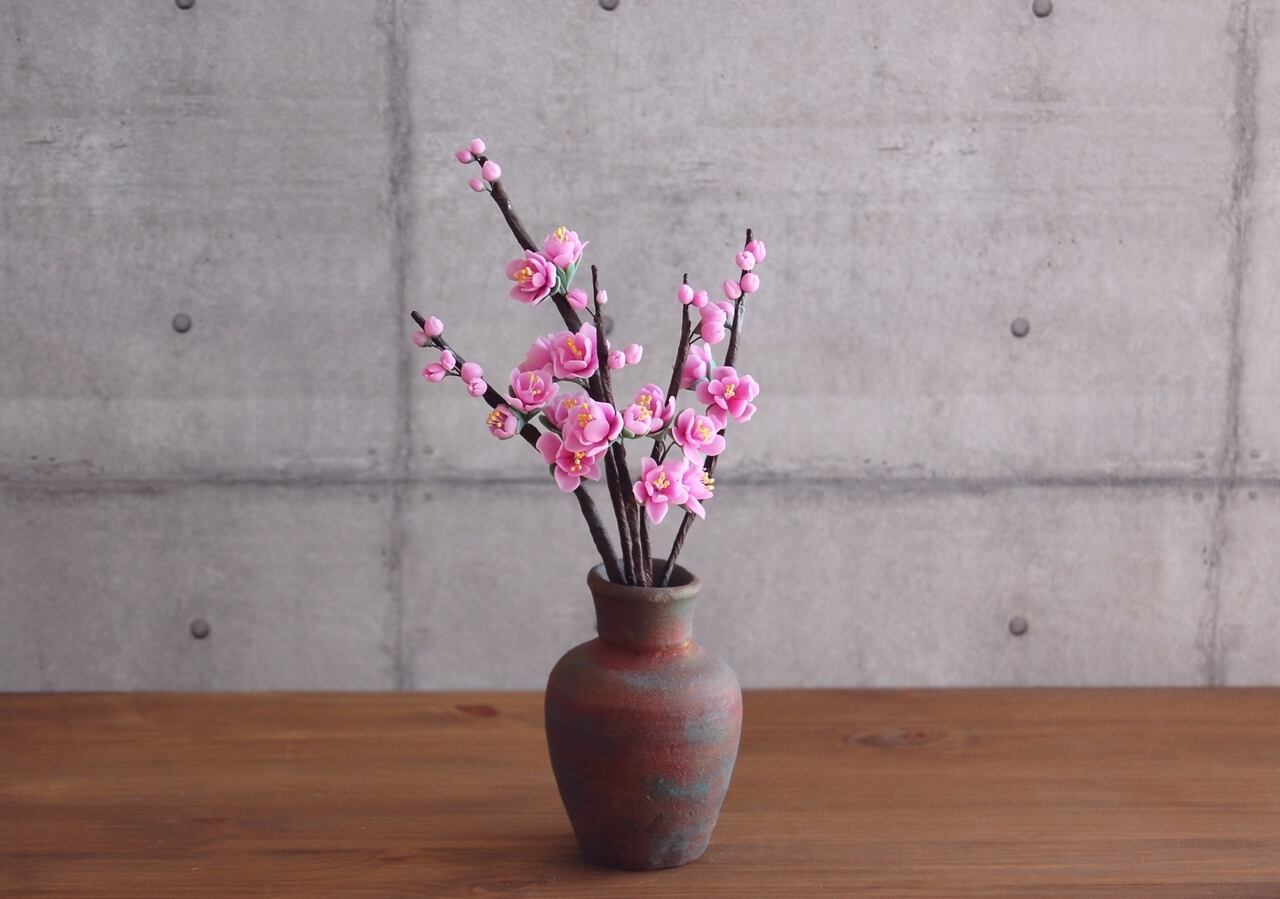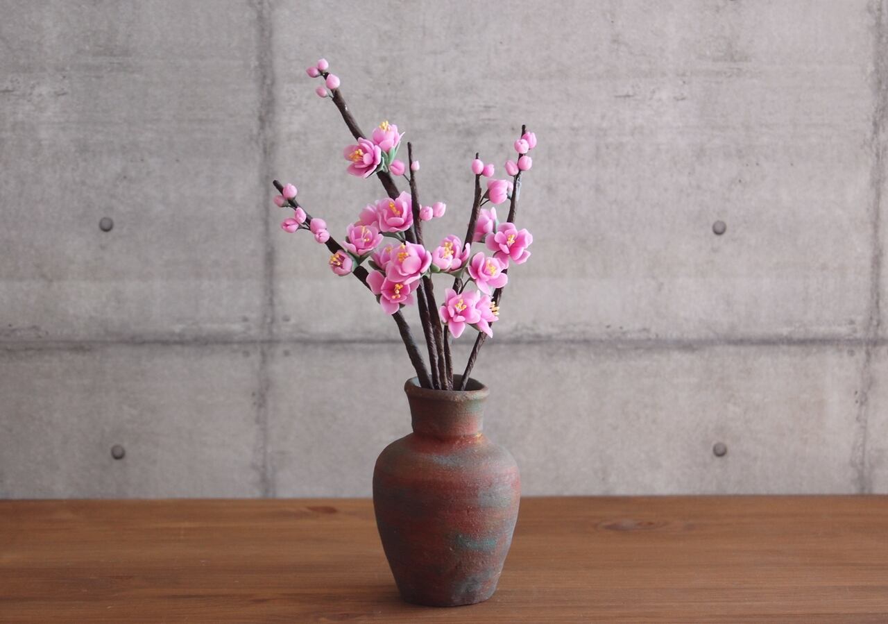 そんな桃を粘土で制作し、手のひらサイズの壺に生けました。