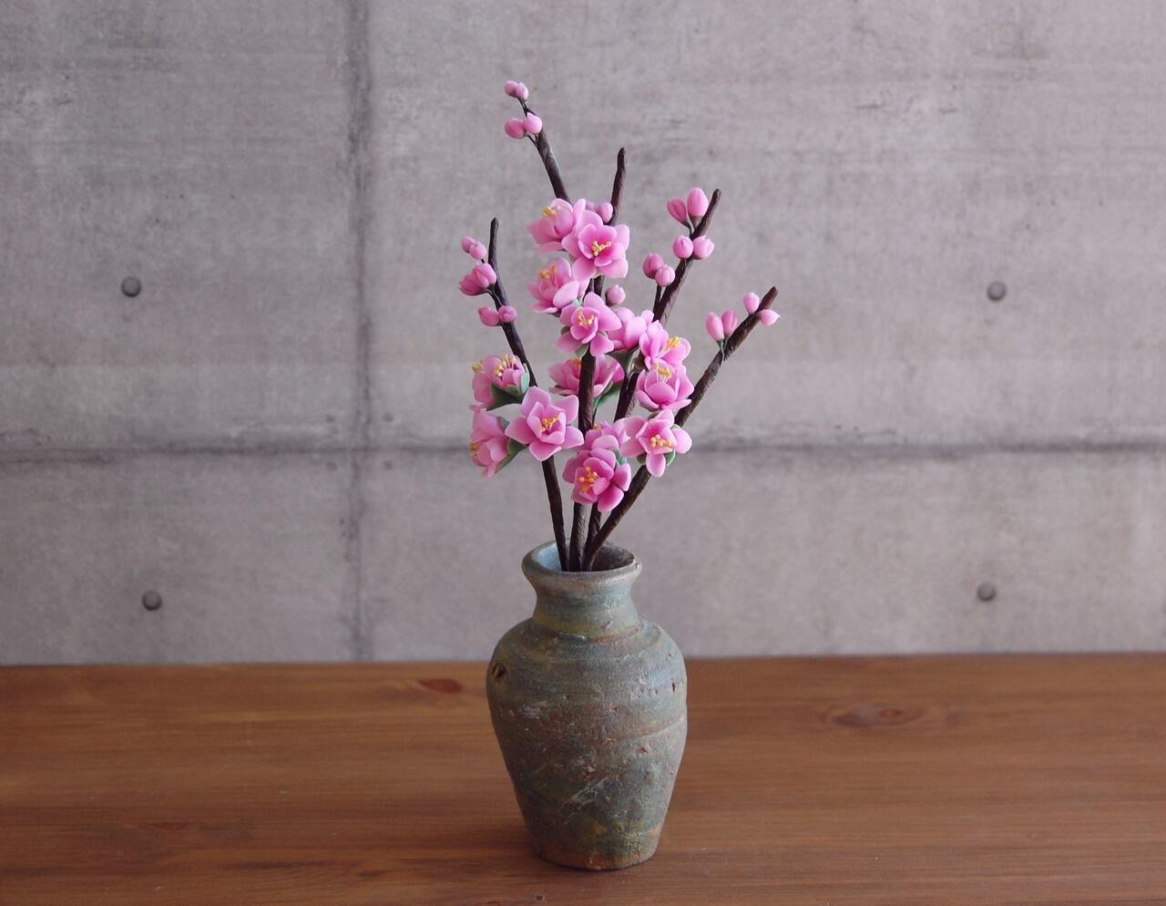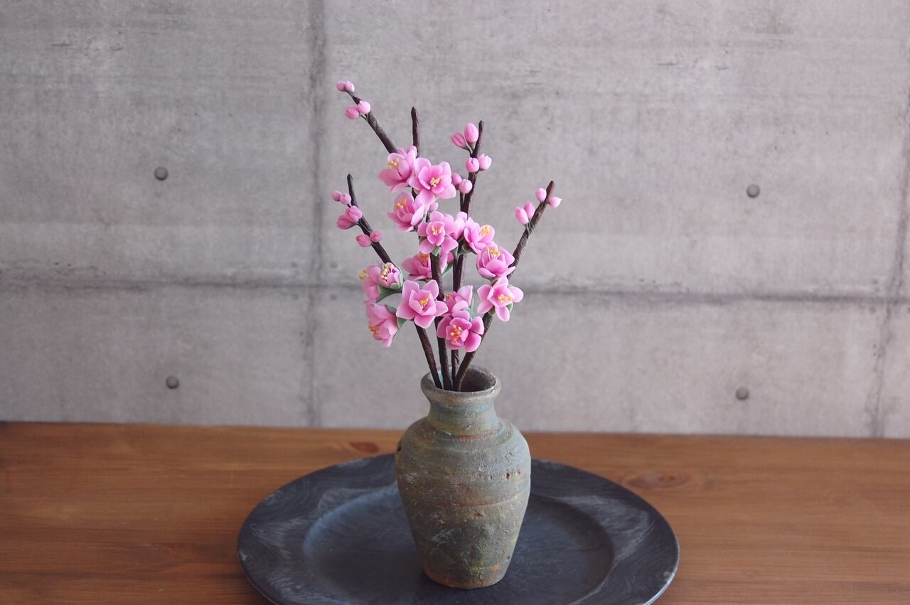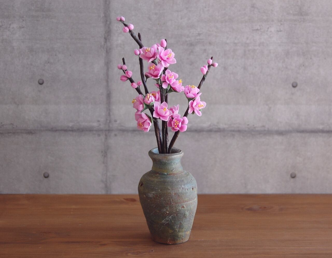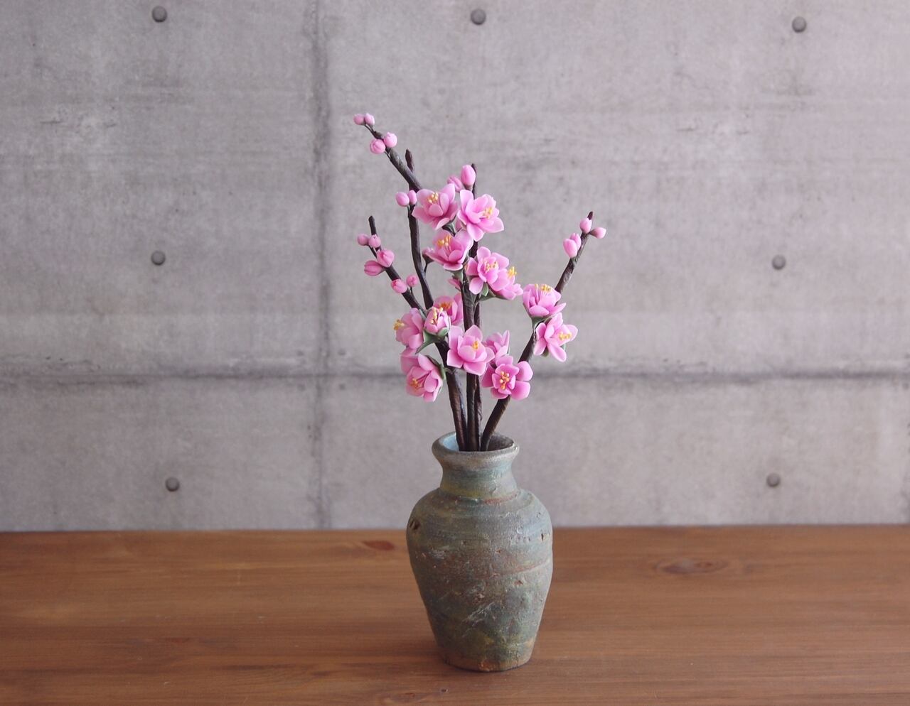 そんな桃を粘土で制作し、手のひらサイズの壺に生けました。