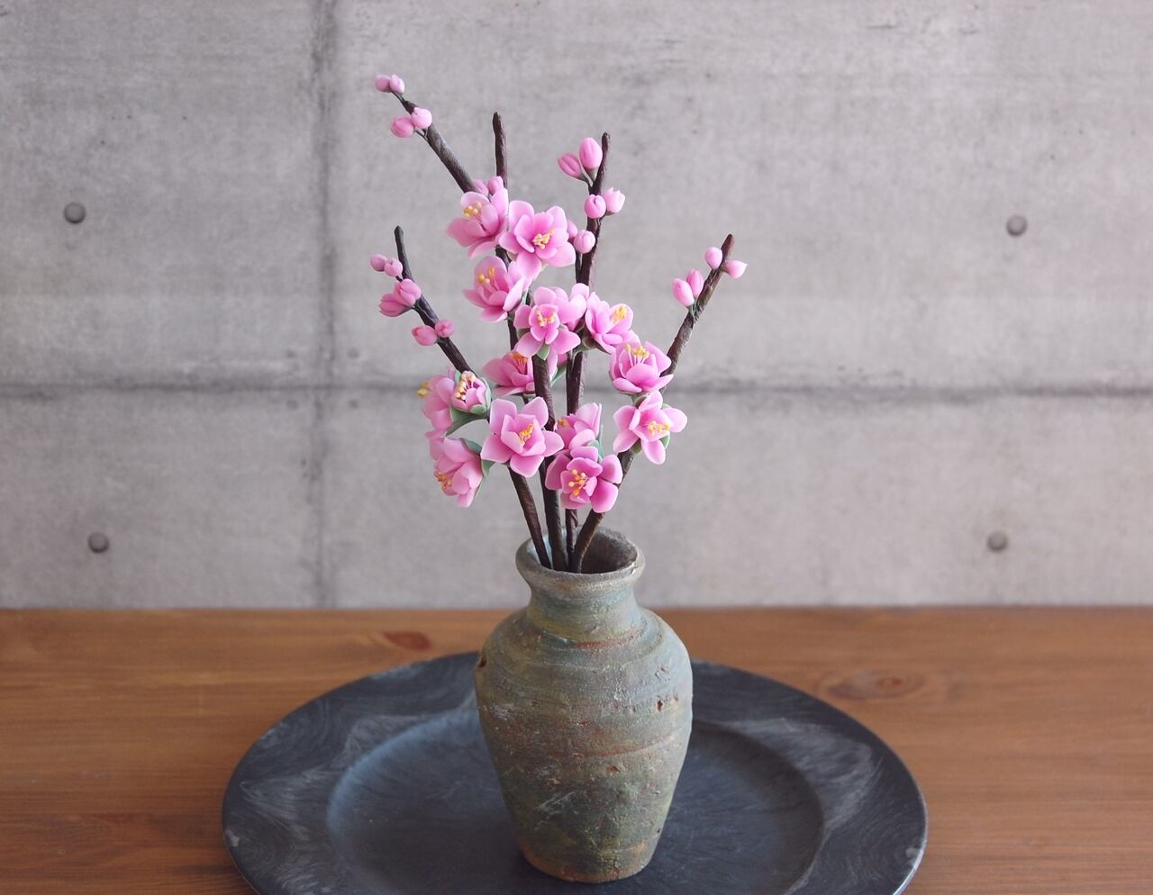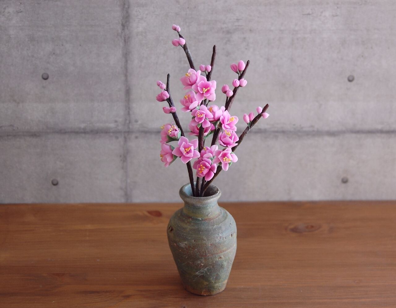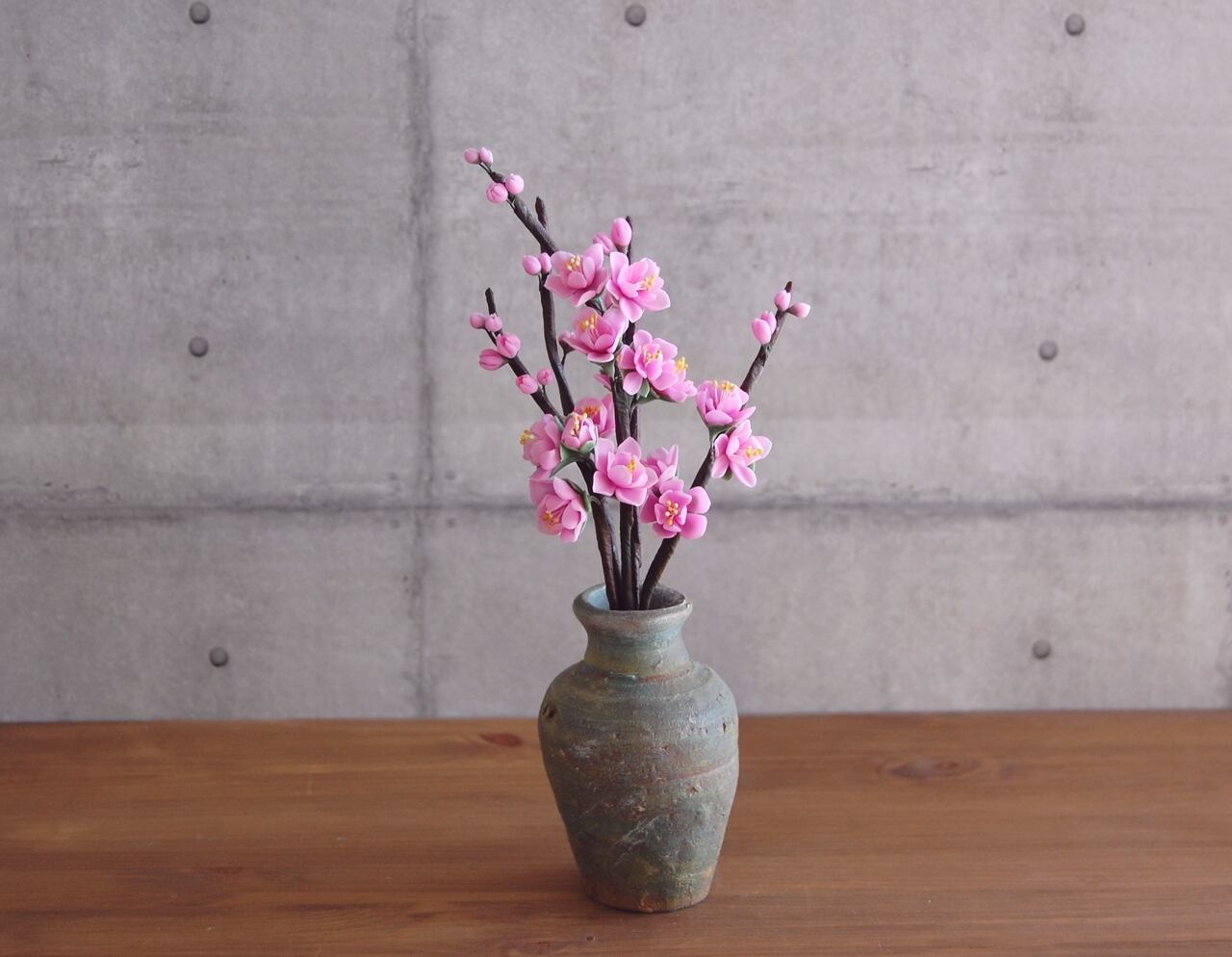 そんな桃を粘土で制作し、手のひらサイズの壺に生けました。