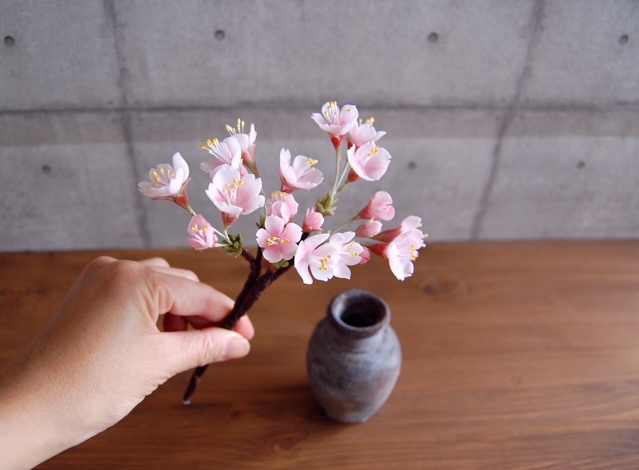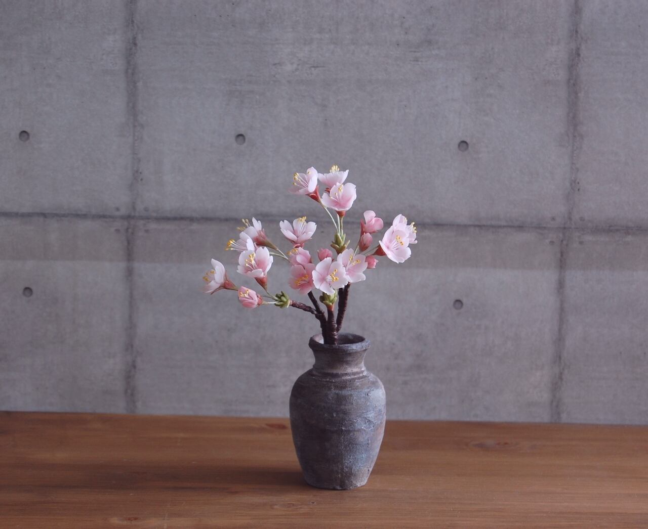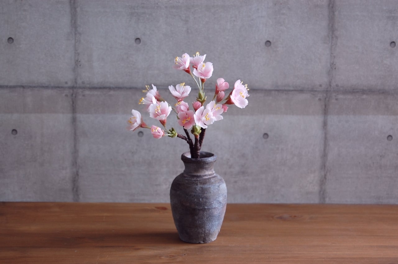 人気の桜を粘土で制作し、手のひらサイズの壺に生けました。
